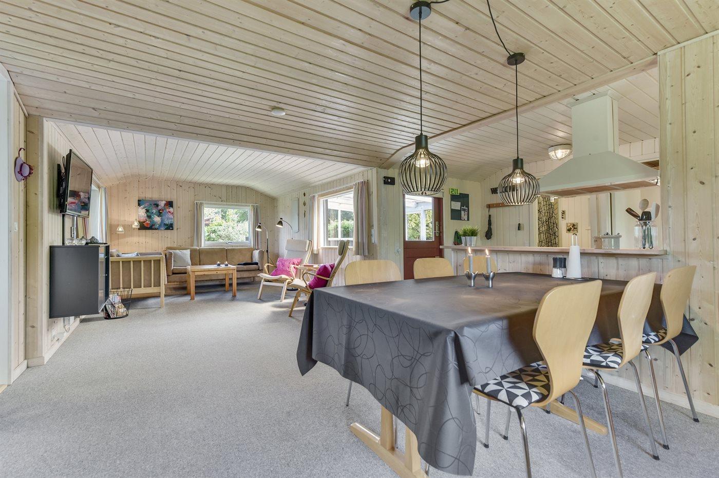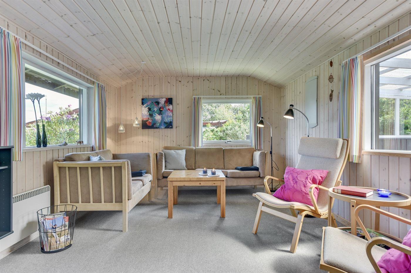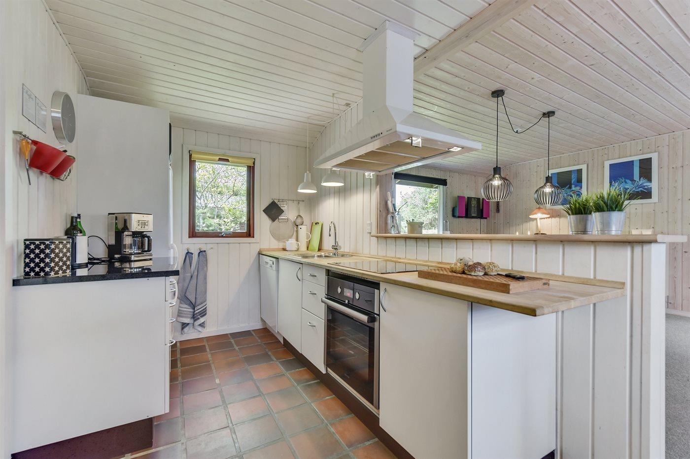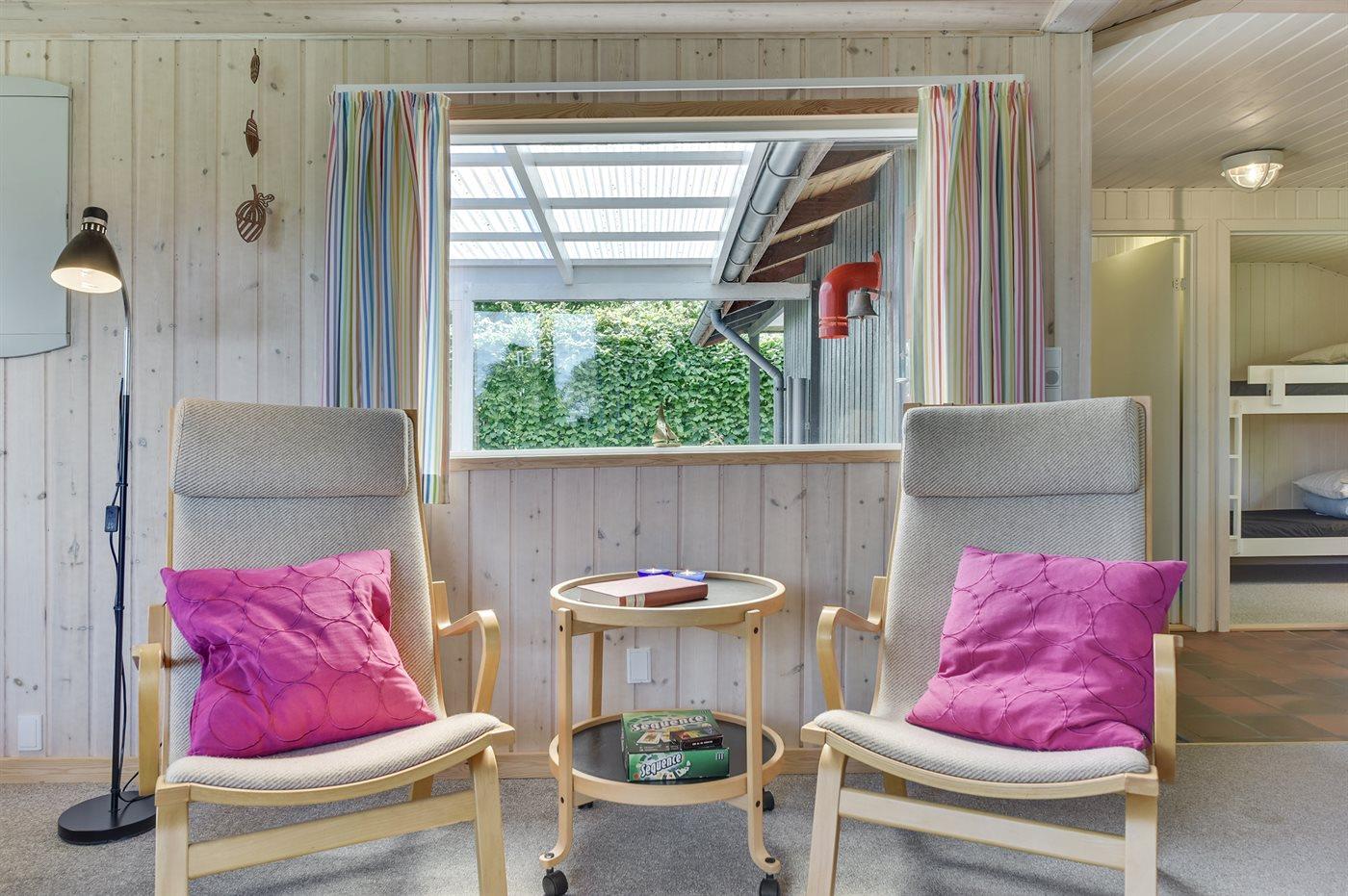 Dette pæne sommerhus i træ, renoveret i 1999, ligger på en delvist lukket havegrund - kun 50 m fra fælles legeplads. Til huset hører en åben samt en dejlig overdækket terrasse med havemøbler. Køkkenet ligger i åben forbindelse med spise-/opholdsstuen og er bl.a. udstyret med opvaskemaskine, lille fryser, mikrobølgeovn, varmluftovn og komfur med keramiske kogeplader. I spise-/opholdsstuen finder I TV med parabol (digital), DVD-afspiller samt stereoanlæg med CD-afspiller. Sovepladserne fordeler sig på 1 værelse med dobbeltseng, 1 værelse med køjeseng samt 2 sovepladser (enkeltsenge) i husets anneks. Til de mindste feriegæster står barneseng og høj barnestol til rådighed. Der er installeret energibesparende varmepumpe. Et pænt sommerhus i et familievenligt område med god badestrand.