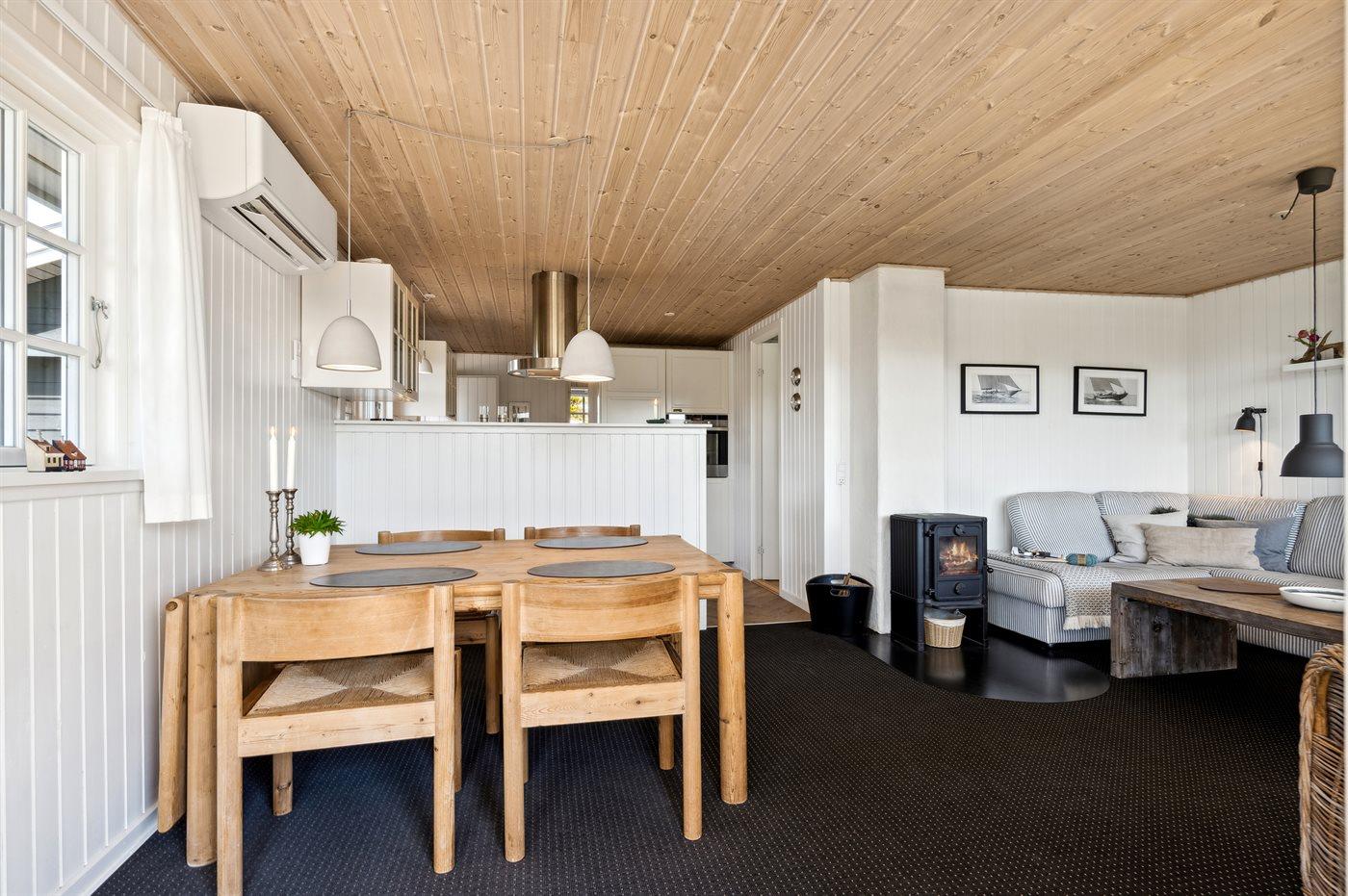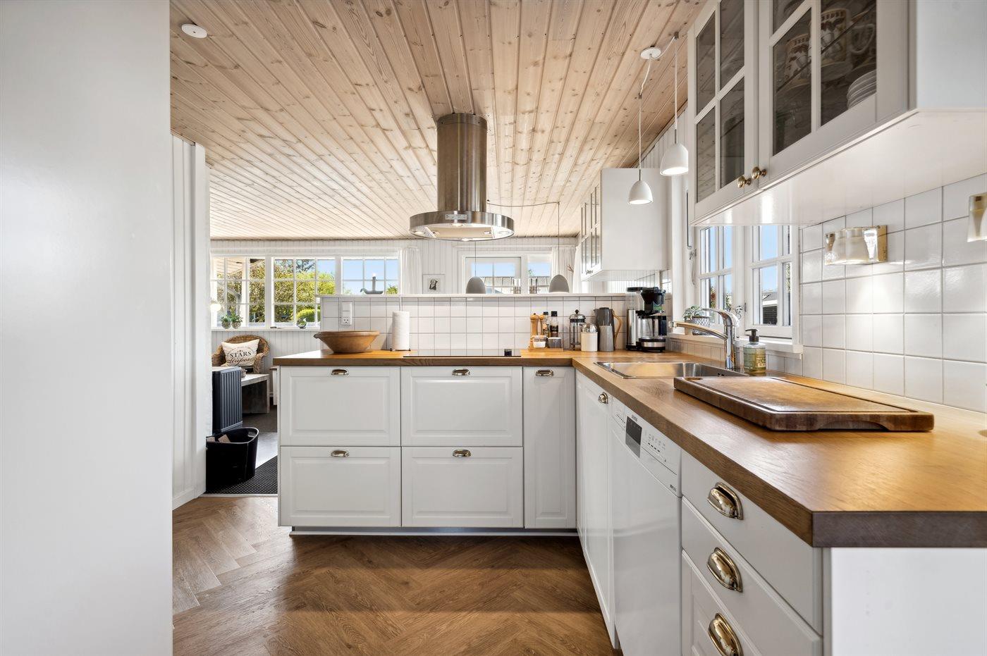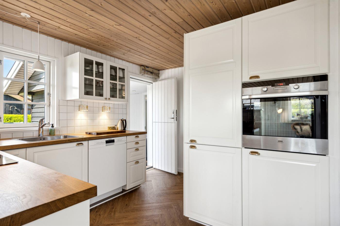 Køkkenet er udstyret med 1 køleskab. Der er 3 keramiske kogeplader, varmluftovn samt opvaskemaskine.