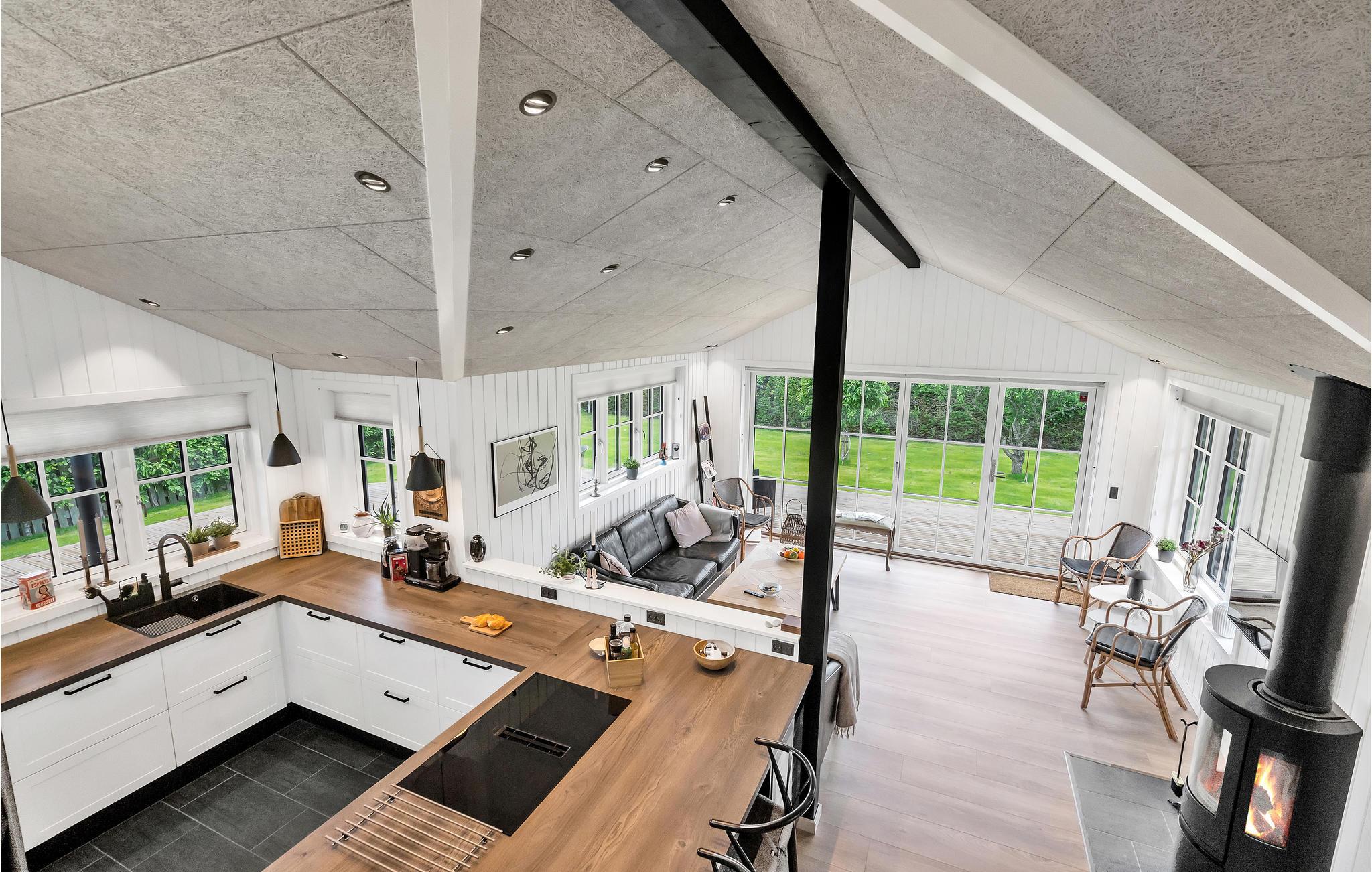 Et højdepunkt ved huset er den store stue med brændeovn, hvor I kan tilbringe gode stunder og nyde udsynet gennem det store vinduesparti. Den skjulte opholdsstue under det skrå tag bliver nok især populær blandt børnene.