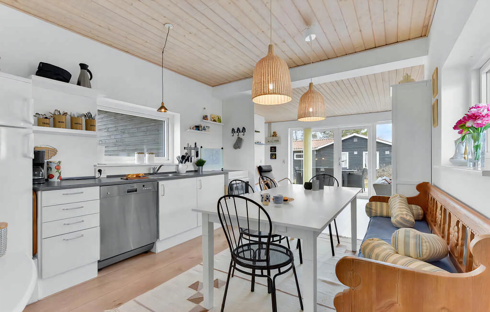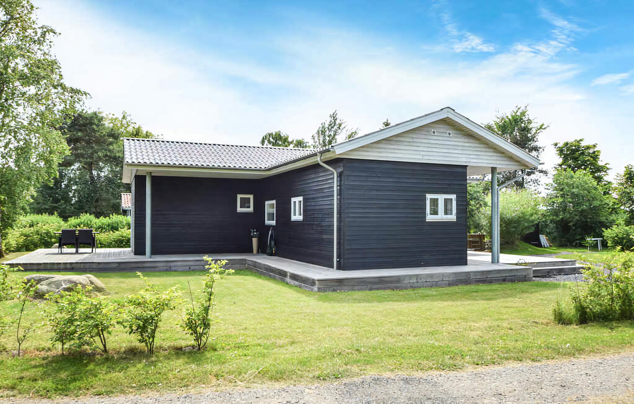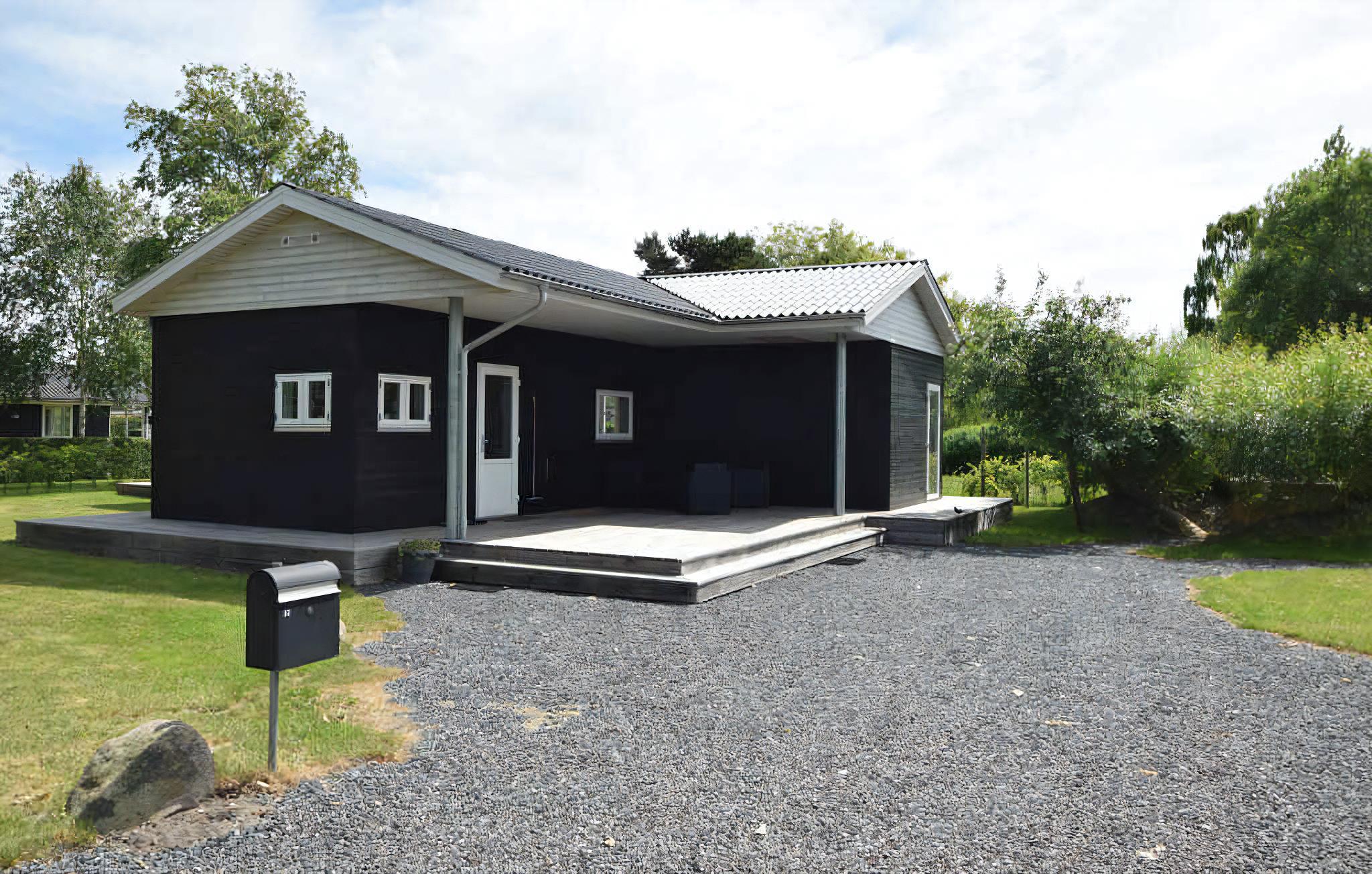 Lyst og moderne sommerhus tæt på badestrand med stor terrasse og plads til 6 personer.
