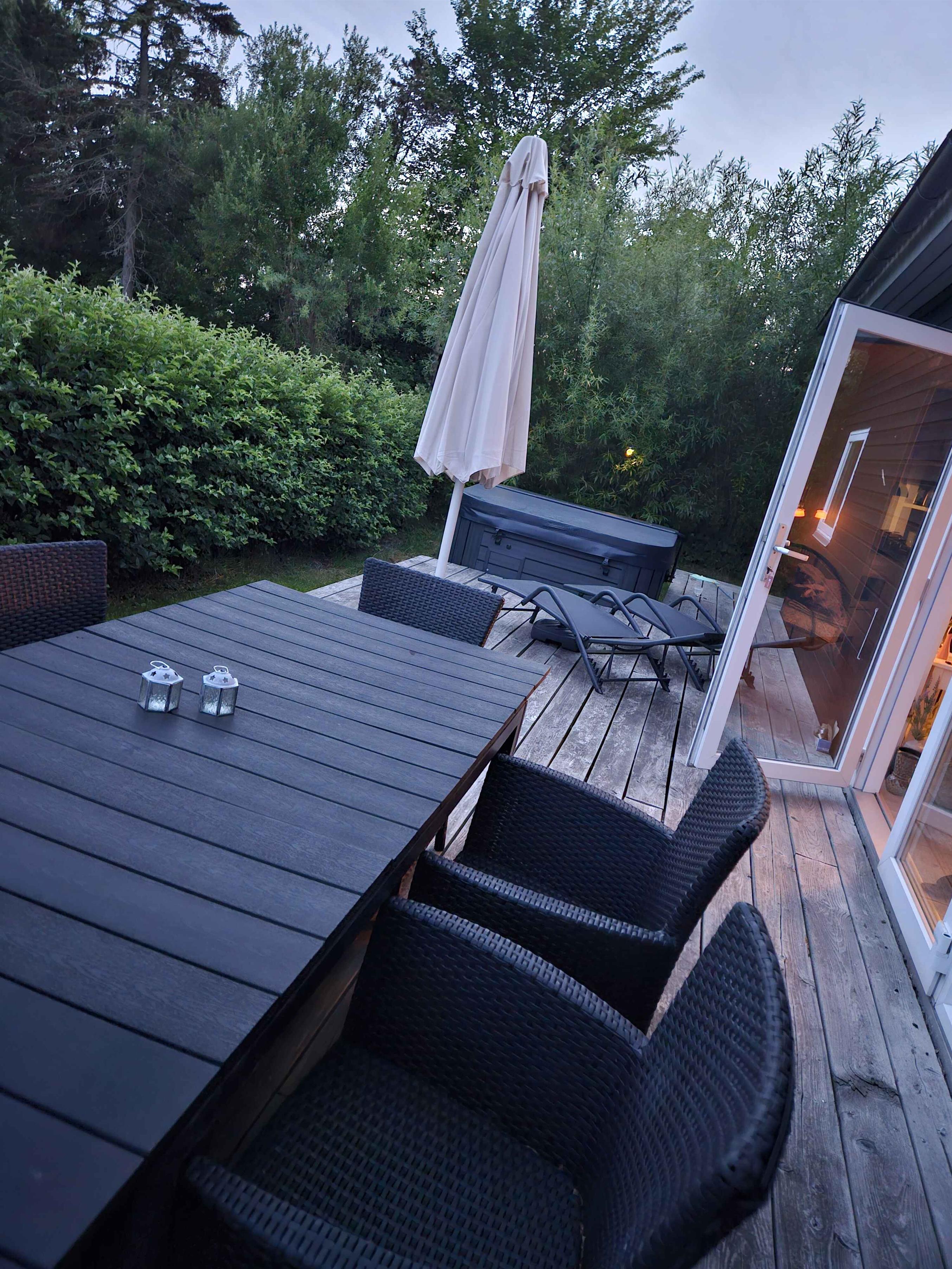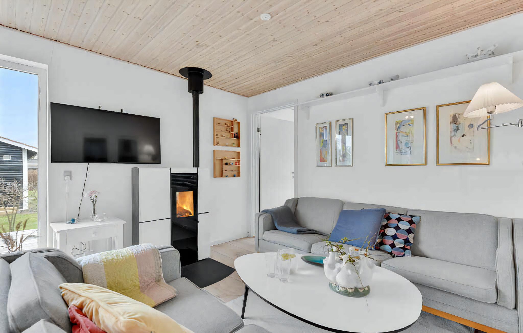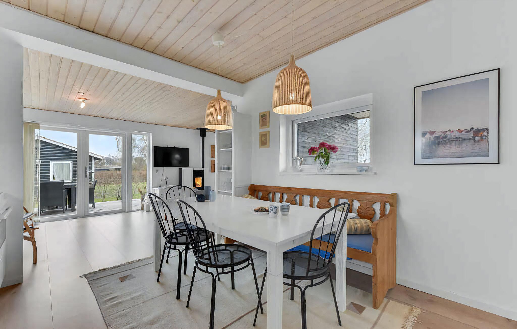 Lyst og moderne sommerhus tæt på badestrand med stor terrasse og plads til 6 personer.
