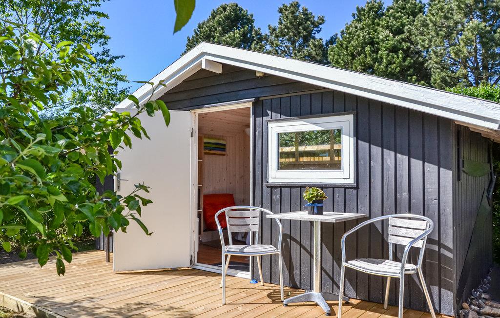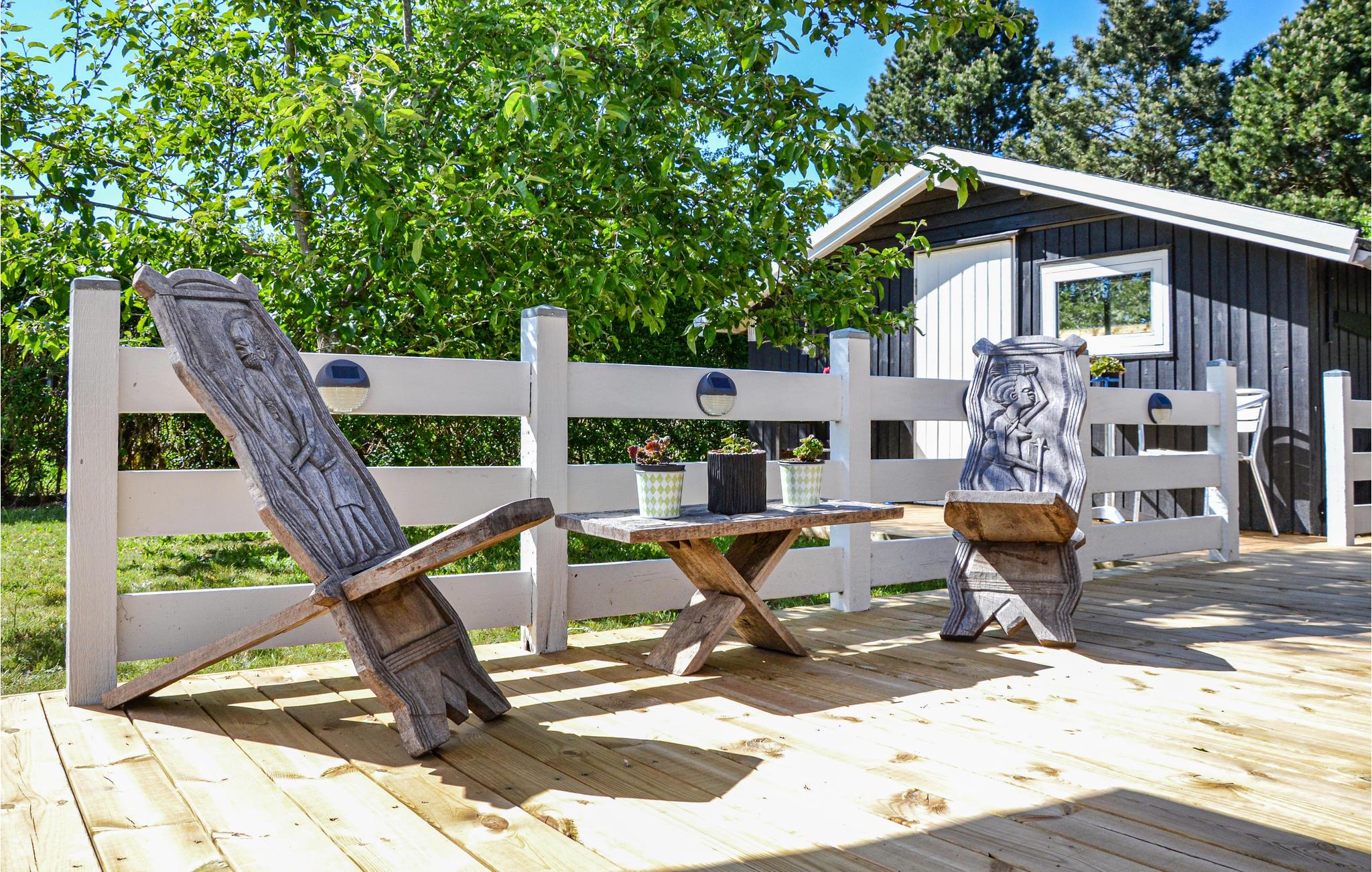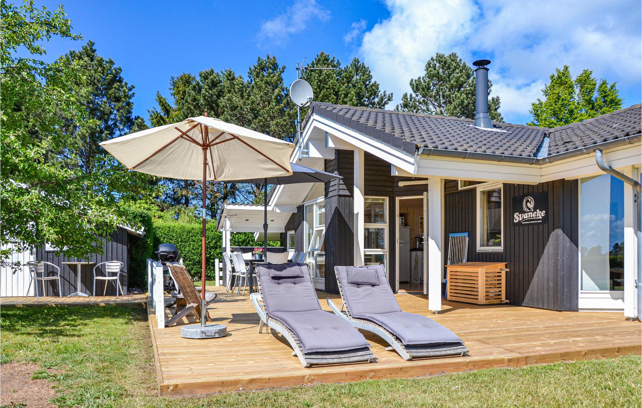 Charmerende sommerhus med stor terrasse, legeområde og nærhed til badestrand og fiskemuligheder.