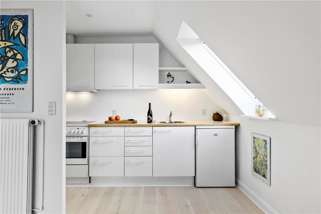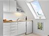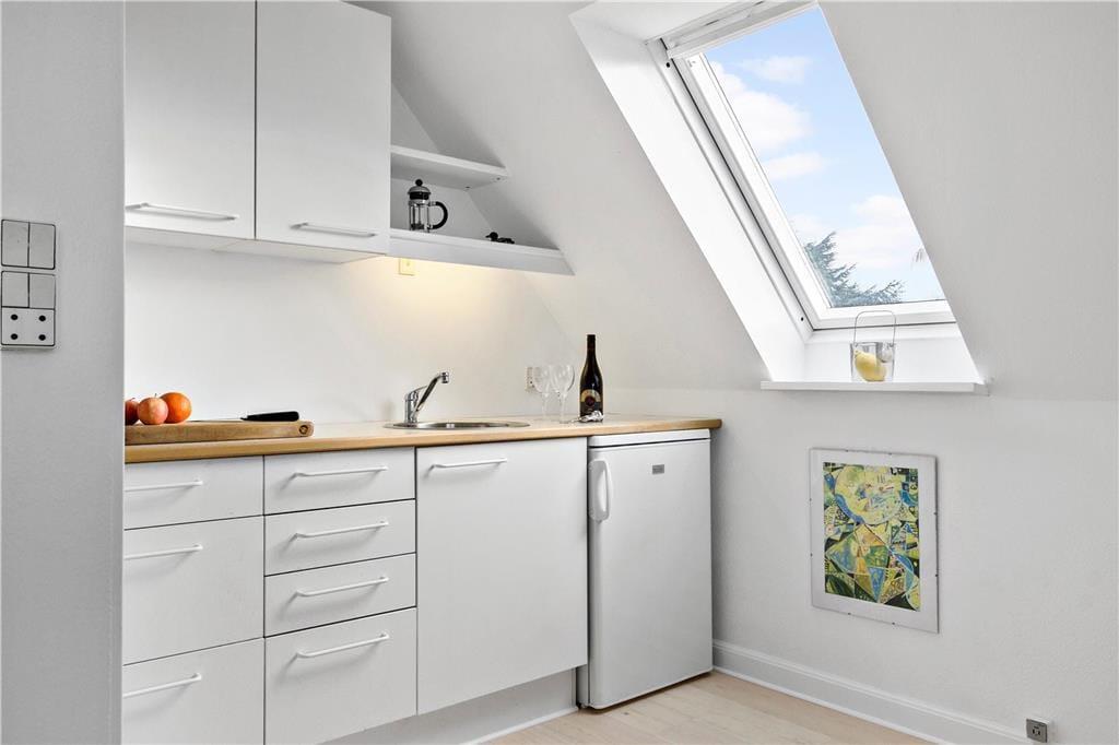Åbent køkken hjørne med komfur med 4 kogeplader og ovn, emhætte, køleskab, kaffemaskine, samt alt service og køkkengrej.