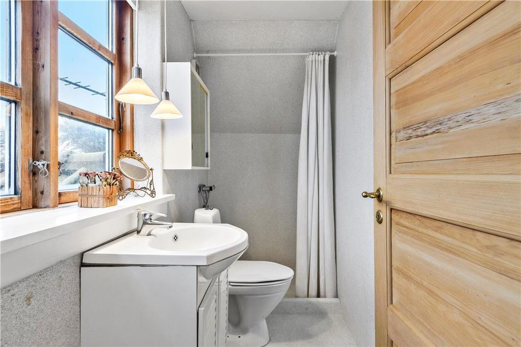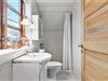 Nydeligt badeværelse med toilet, håndvask og bruseniche.