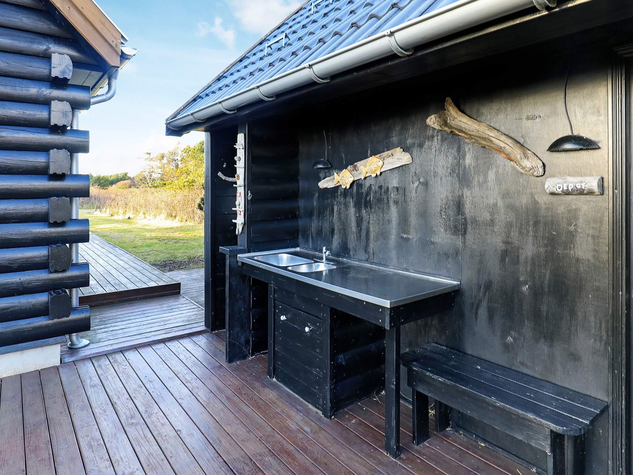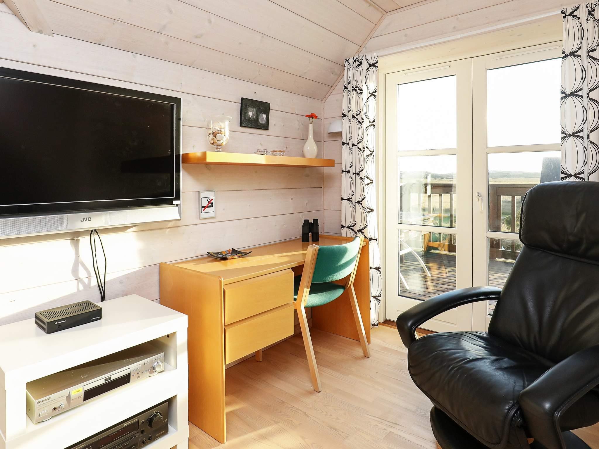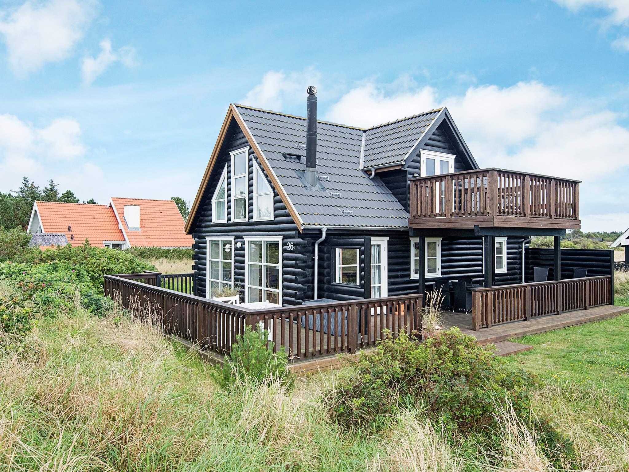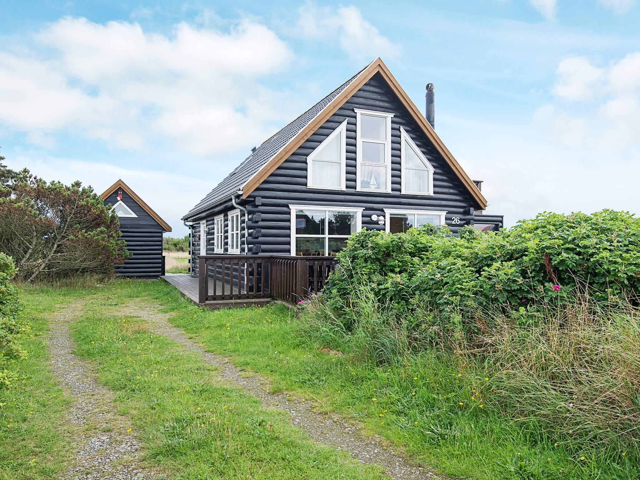 Bjælkehus med balkon og træterrasser hele vejen rundt om huset. Huset er rummeligt indrettet med stort køkken/alrum, entre samt stort badeværelse med vaskemaskine. I stueetagen er der soveværelse med dobbeltseng og indbygget skabsplads. Tv i stueplan har kun danske kanaler. På 1. sal er der tv-stue med skråvægge, sovesofa samt udgang til balkonen. Soveværelse med dobbeltseng og badeværelse med lille håndvask på 1. sal. Fra huset er der udsigt til Råbjerg Mile, marker og klitterne ned til Vesterhavet. Huset ligger for enden af vej i naturskønne omgivelser tæt på Skagen.
