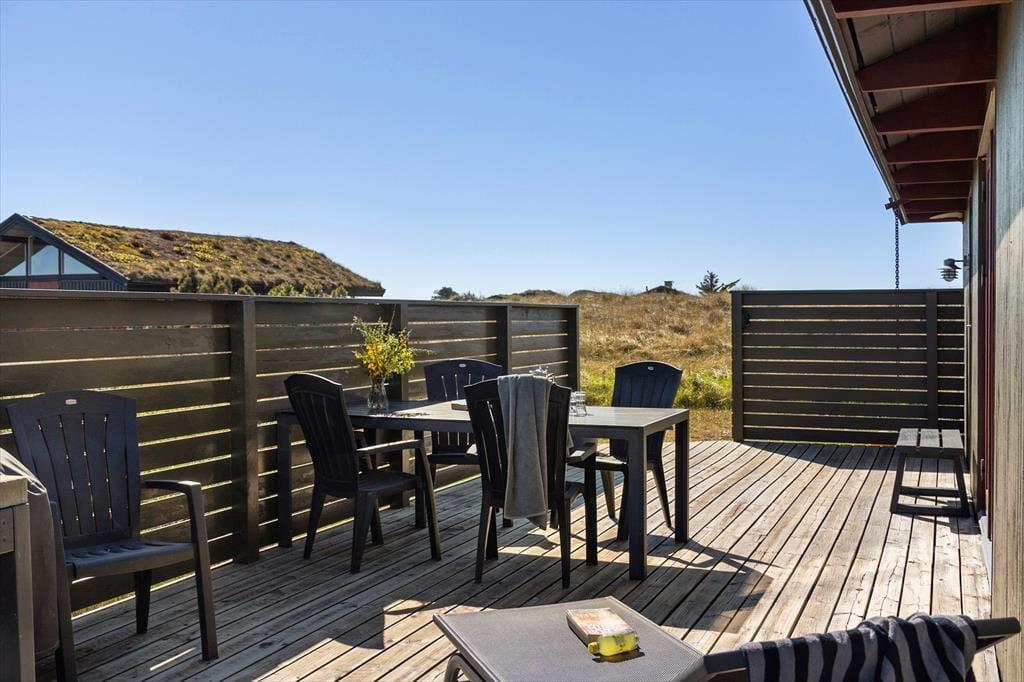 Når solen skinner, trækker udelivet helt naturligt – og her får du de perfekte rammer til at nyde det. Terrassen indbyder til afslapning med en kølig drink, mens fuglene kvidrer i de omkringliggende træer, og aftensmaden kan tilberedes på grillen, mens dagens oplevelser deles rundt om havebordet. Børnene kan boltre sig på grunden, mens de voksne nyder stilheden og den friske havluft. Og når lysten melder sig, kan I tage en kort gåtur på blot 500 meter og mærke sandet mellem tæerne på stranden, hvor Vesterhavets bølger ruller ind over kysten.