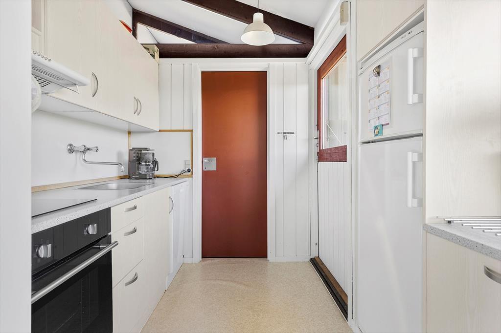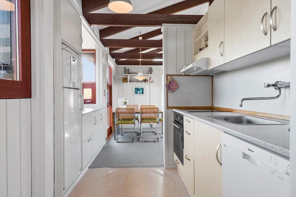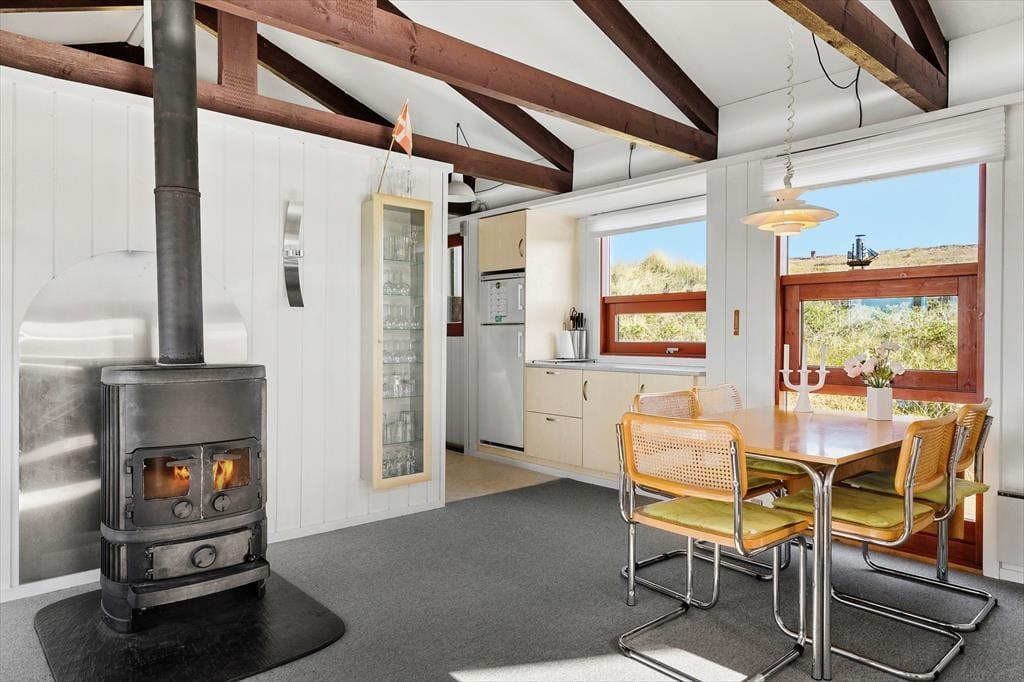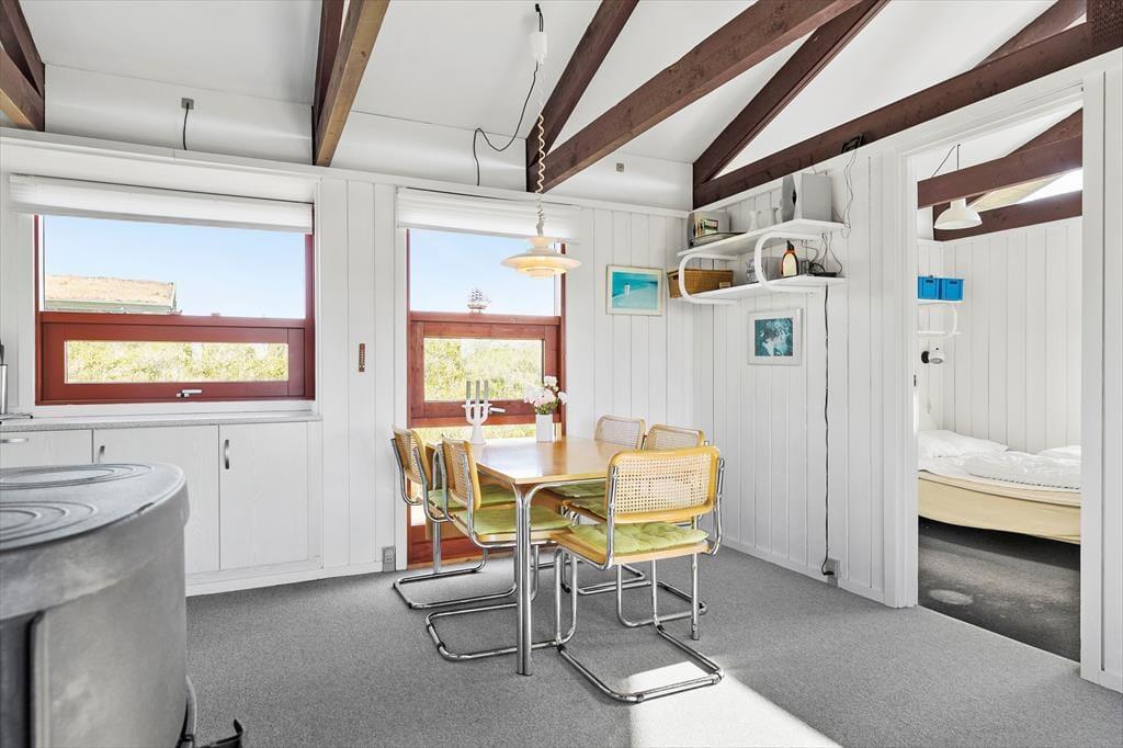 Når du træder ind i sommerhuset, bliver du mødt af et lyst og indbydende opholdsrum, hvor loft til kip og synlige spær giver en skøn fornemmelse af luft og rummelighed. Her kan hele familien samles i sofaerne til en god film eller et brætspil, mens brændeovnen knitrer i baggrunden og spreder varme og hygge. Køkkenet ligger i åben forbindelse med stuen, så samtalen kan fortsætte, mens maden bliver tilberedt. Indretningen er enkel og hjemlig, så du hurtigt føler dig godt tilpas, og de store vinduespartier lukker lyset ind, samtidig med at du får kig til den smukke naturgrund udenfor.
