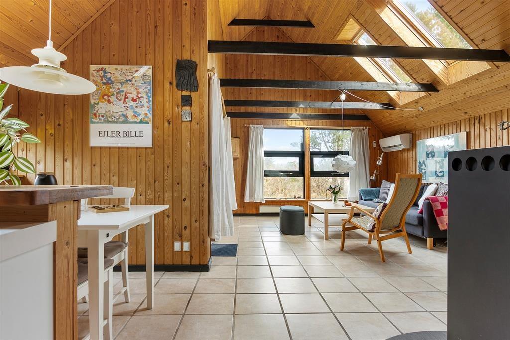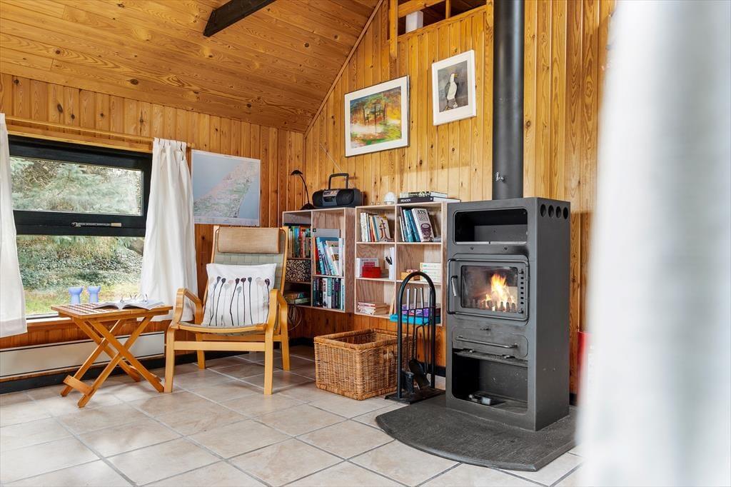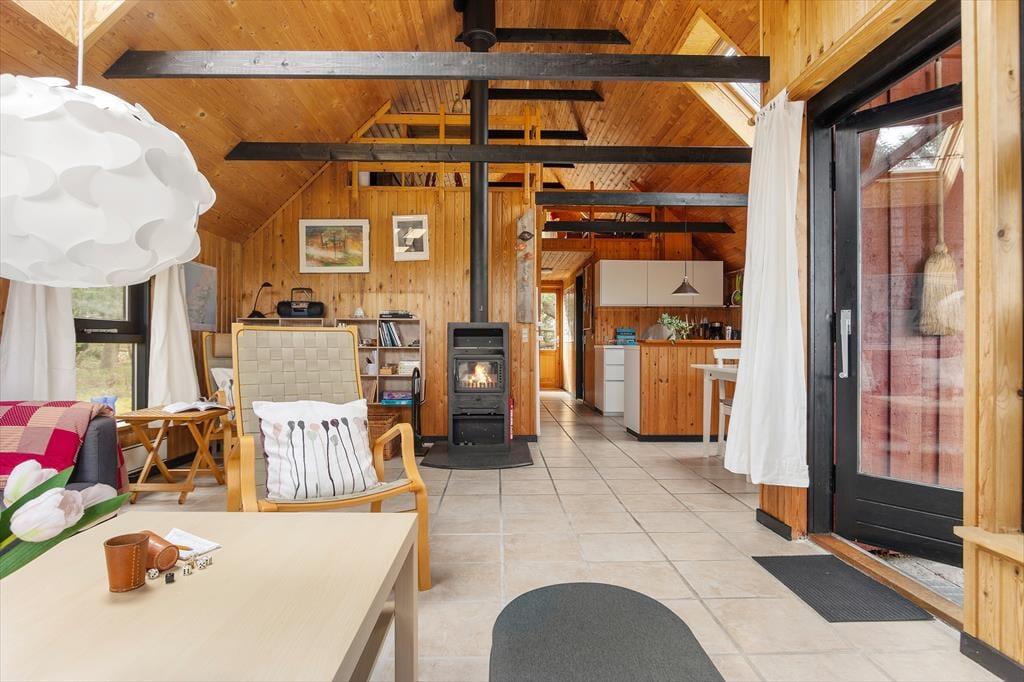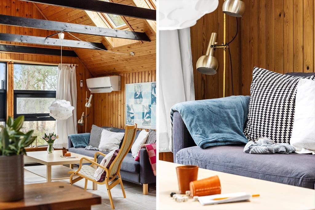 Bag den røde træfacade byder husets hyggelige og stemningsfulde rum dig velkommen. På klassisk sommerhusmanér er der loft til kip og rustik træbeklædning på væggene, og fra stuen giver en stige adgang til en hems. Hvis du har børn med på ferie, vil de sikkert synes, at det er hyggeligt at kravle herop for at lege, mens de voksne laver mad i køkkenet eller slapper af i stuens sofaafdeling. Lænestolen ved siden af brændeovnen er en perfekt siddeplads, hvis du vil læse eller strikke på en kølig aften. Og når det er tid til at sig godnat, kan du lige runde badeværelset for at børste tænder, inden du går til ro på et af de to soveværelser.