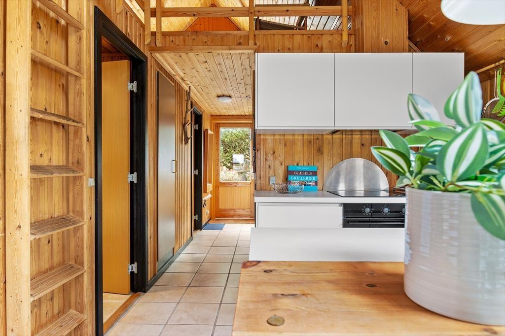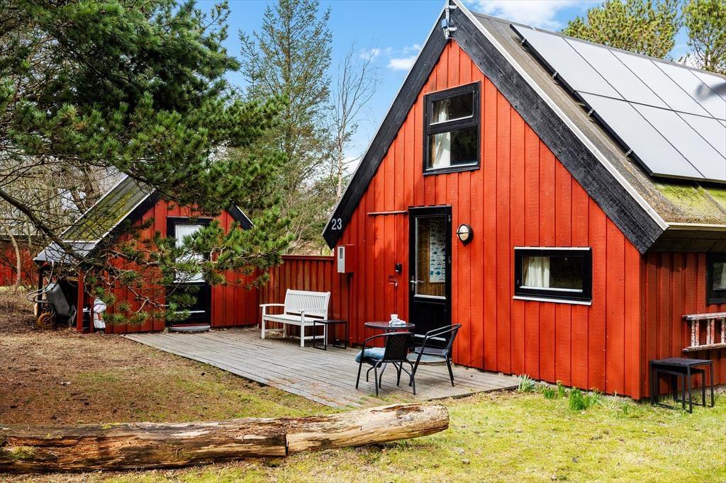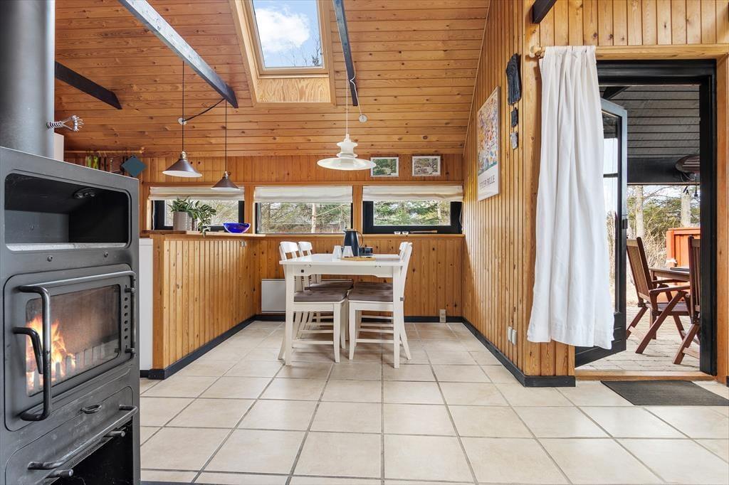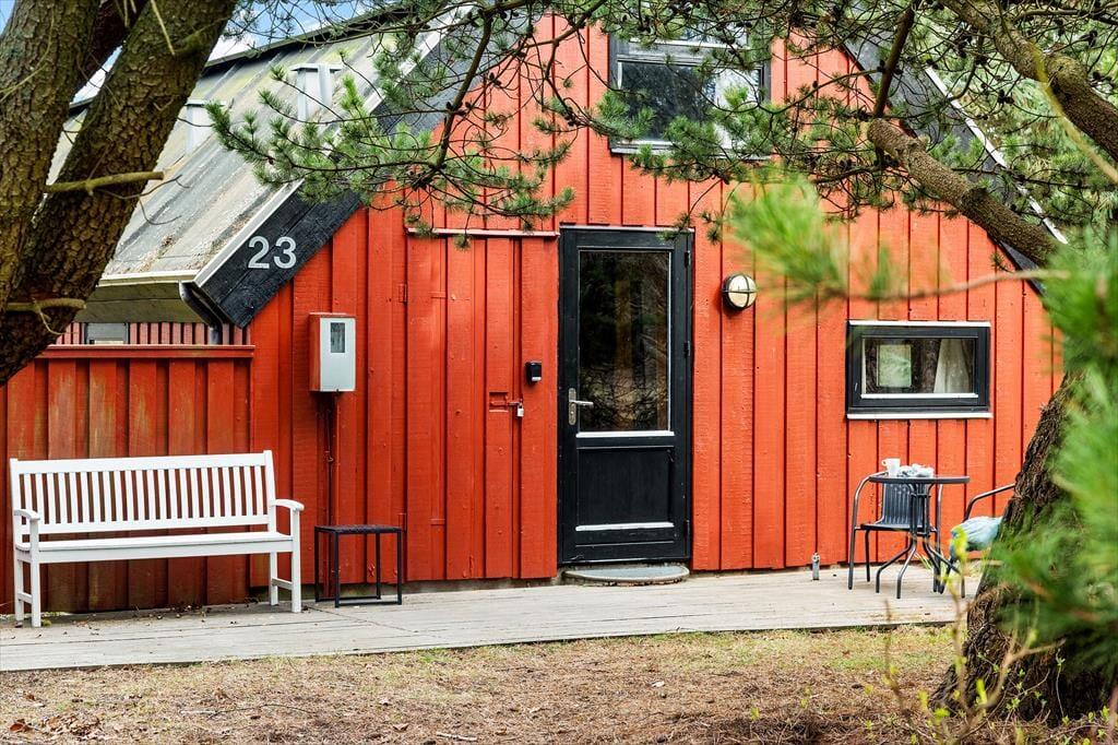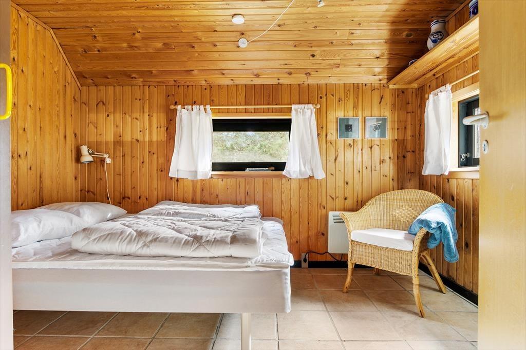 Bag den røde træfacade byder husets hyggelige og stemningsfulde rum dig velkommen. På klassisk sommerhusmanér er der loft til kip og rustik træbeklædning på væggene, og fra stuen giver en stige adgang til en hems. Hvis du har børn med på ferie, vil de sikkert synes, at det er hyggeligt at kravle herop for at lege, mens de voksne laver mad i køkkenet eller slapper af i stuens sofaafdeling. Lænestolen ved siden af brændeovnen er en perfekt siddeplads, hvis du vil læse eller strikke på en kølig aften. Og når det er tid til at sig godnat, kan du lige runde badeværelset for at børste tænder, inden du går til ro på et af de to soveværelser.