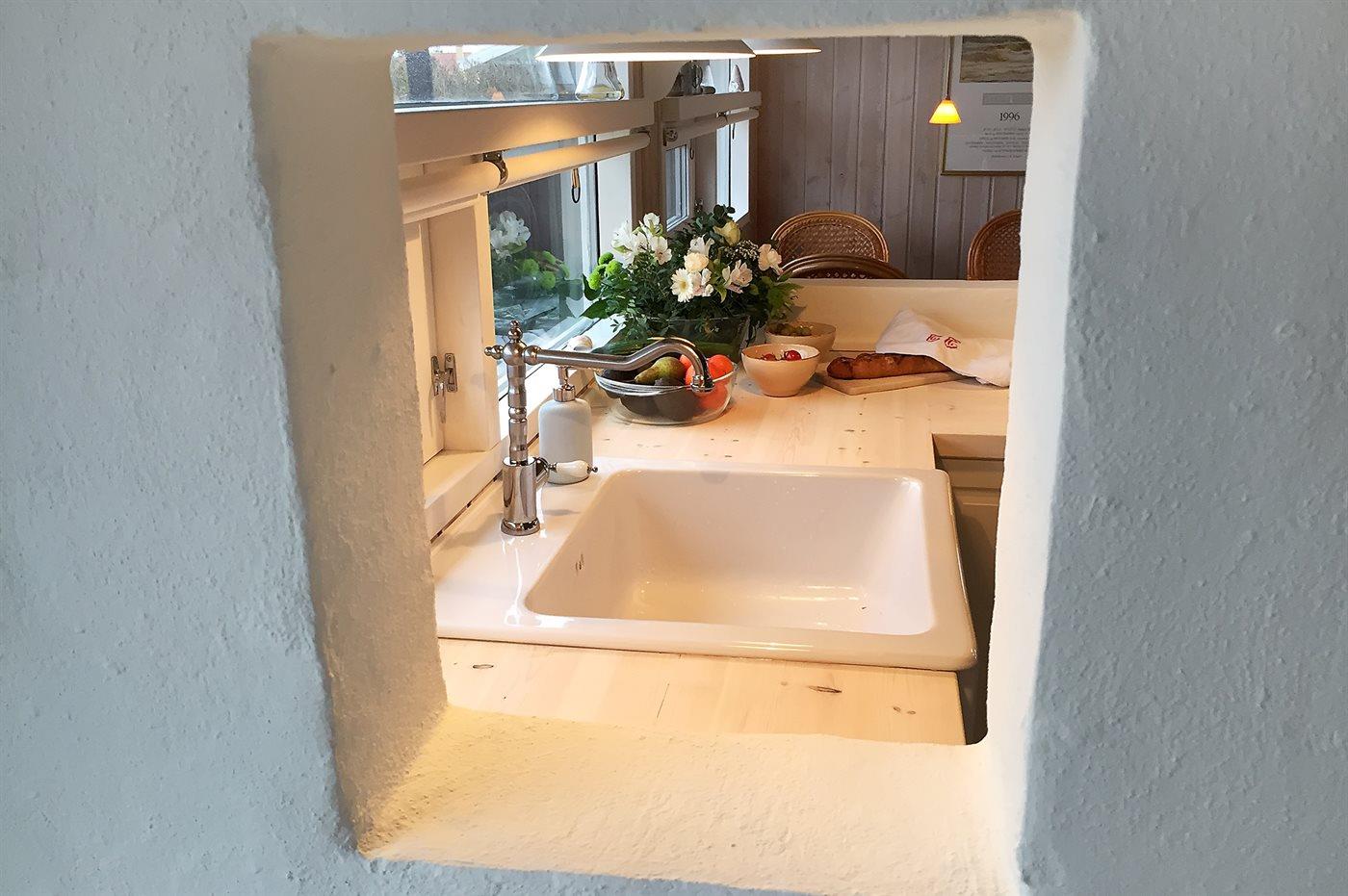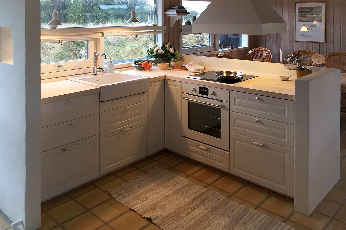 Køkkenet er udstyret med 1 køleskab. Der er 4 elkogeplader, bageovn, mikrobølgeovn.