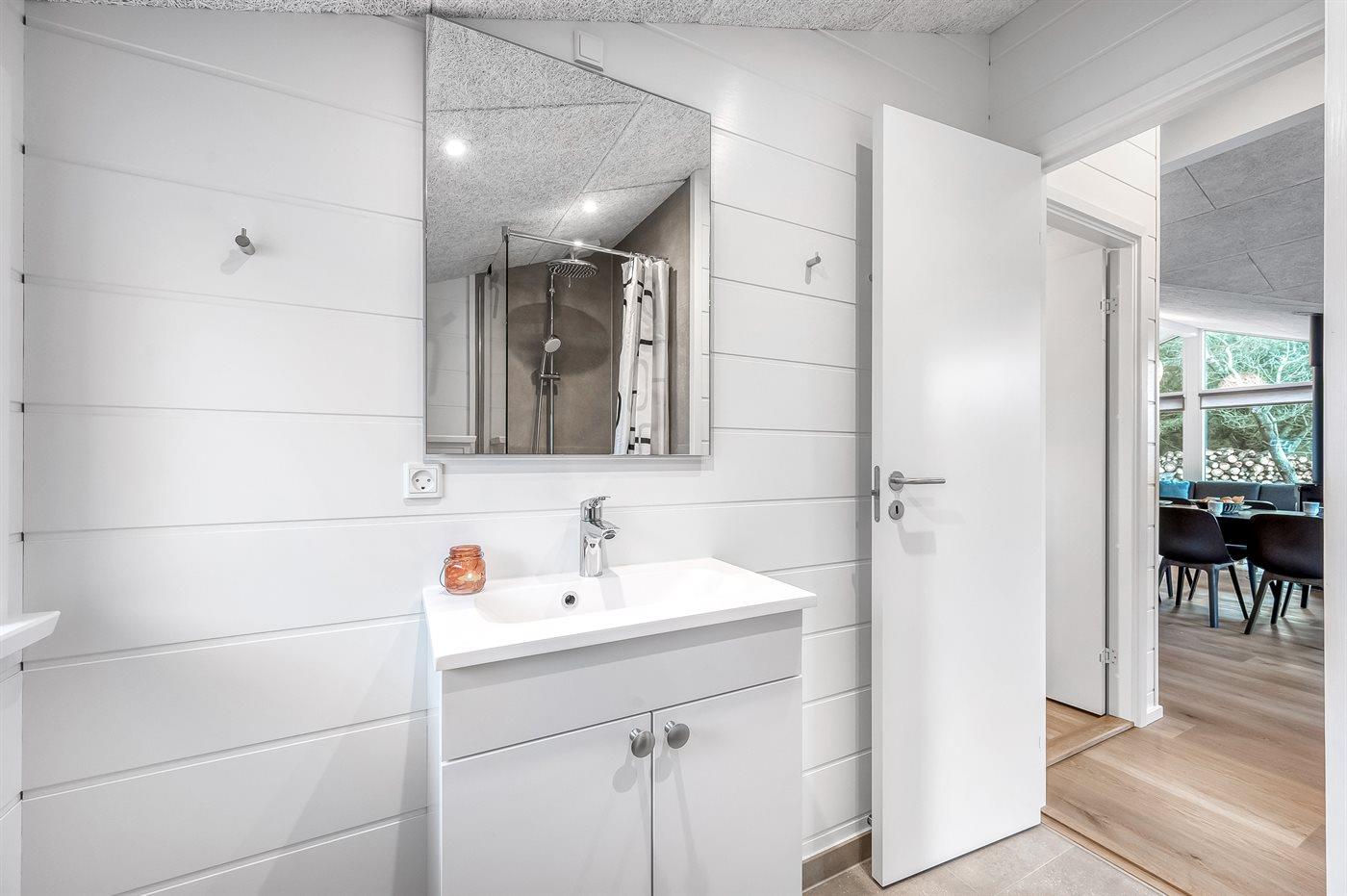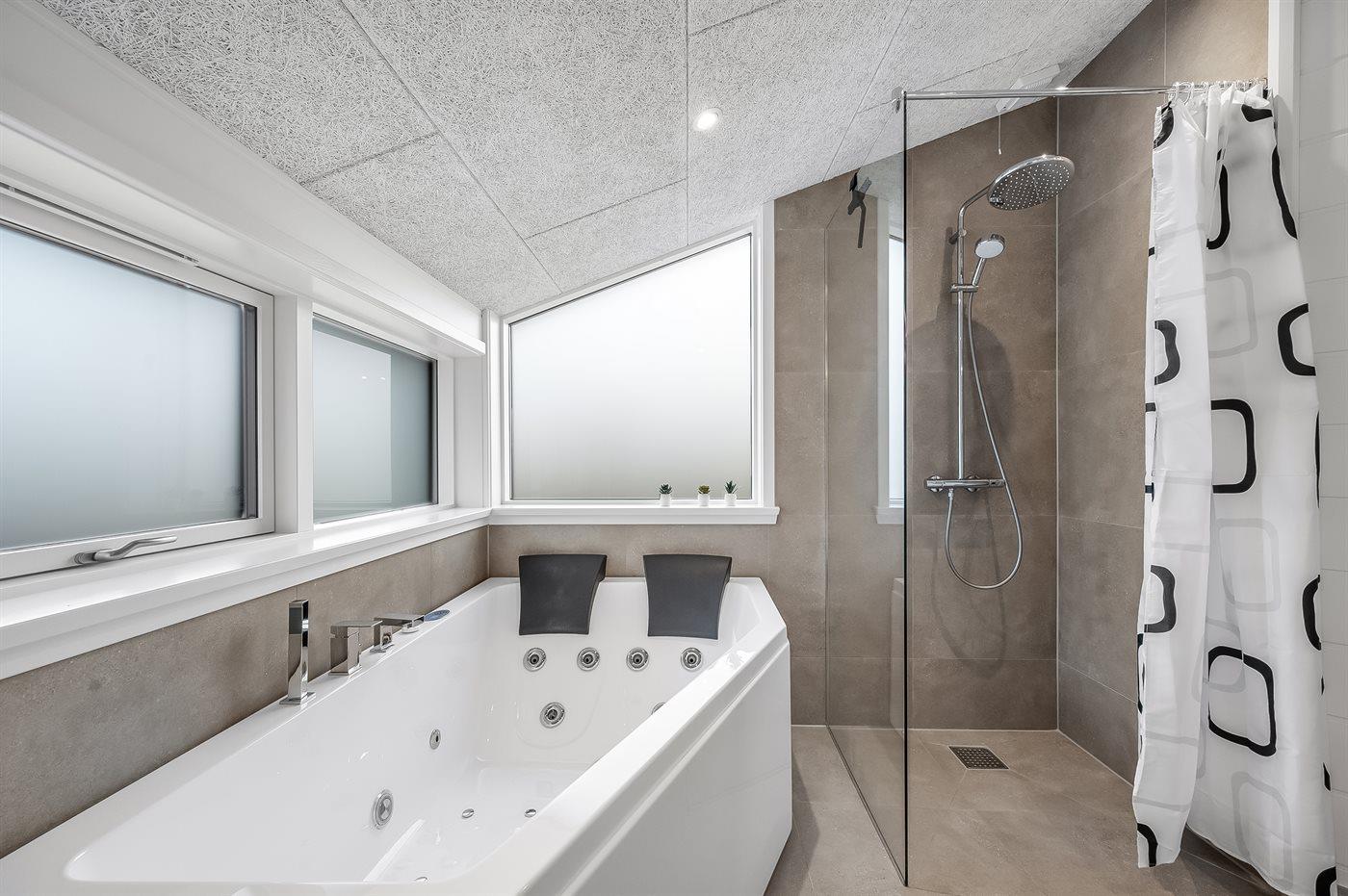 Der er 2 badeværelser med bruseniche og 2 toiletter. Der er gulvvarme på 2 badeværelser. I saunaen er der mulighed for afslapning.
