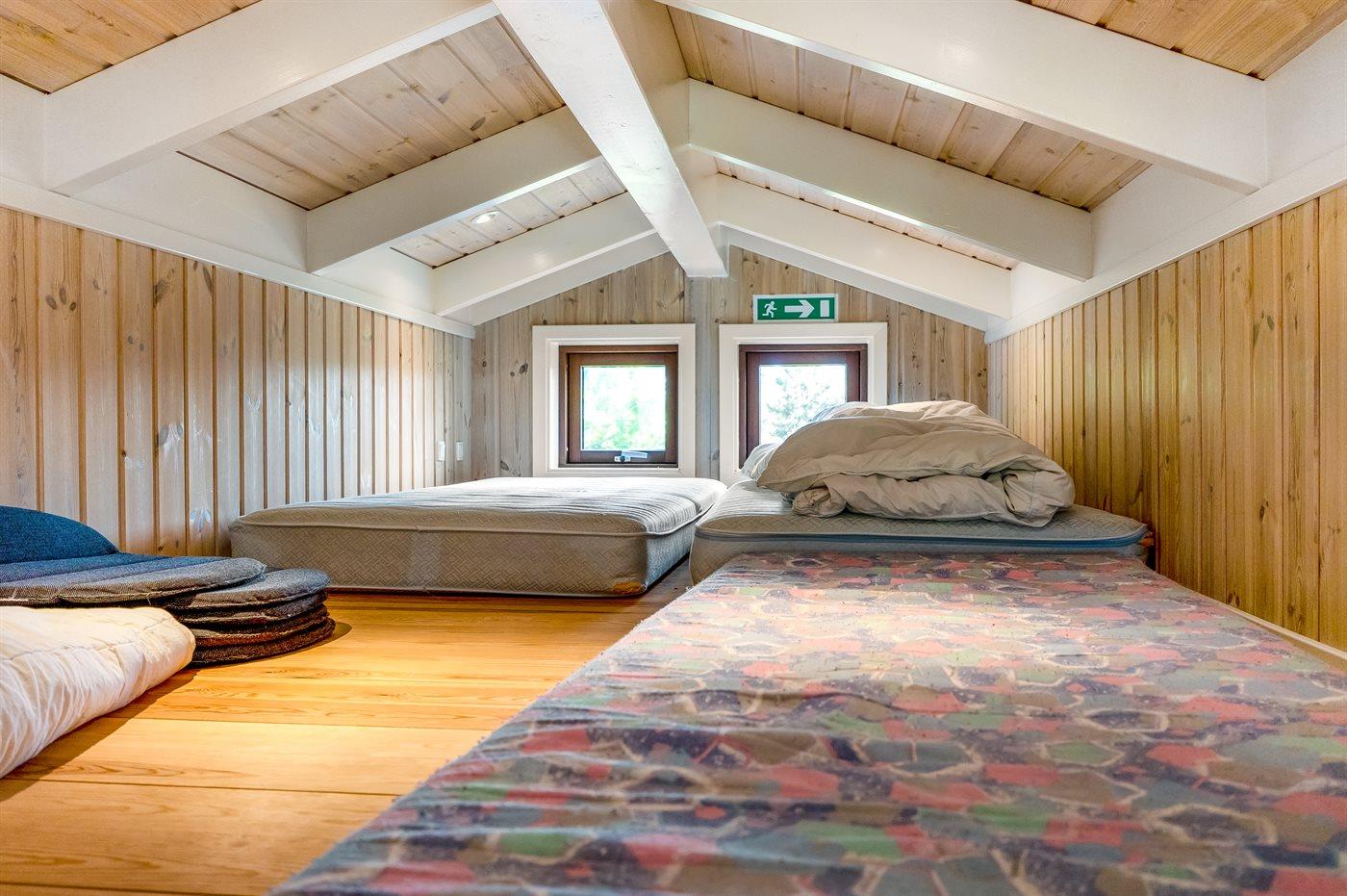 Der er i alt 2 soveværelser. Sovepladserne fordeler sig på: 4 sovepladser i dobbeltsenge. 2 sovepladser på madrasser. 2 af disse sovepladser befinder sig på husets hems.