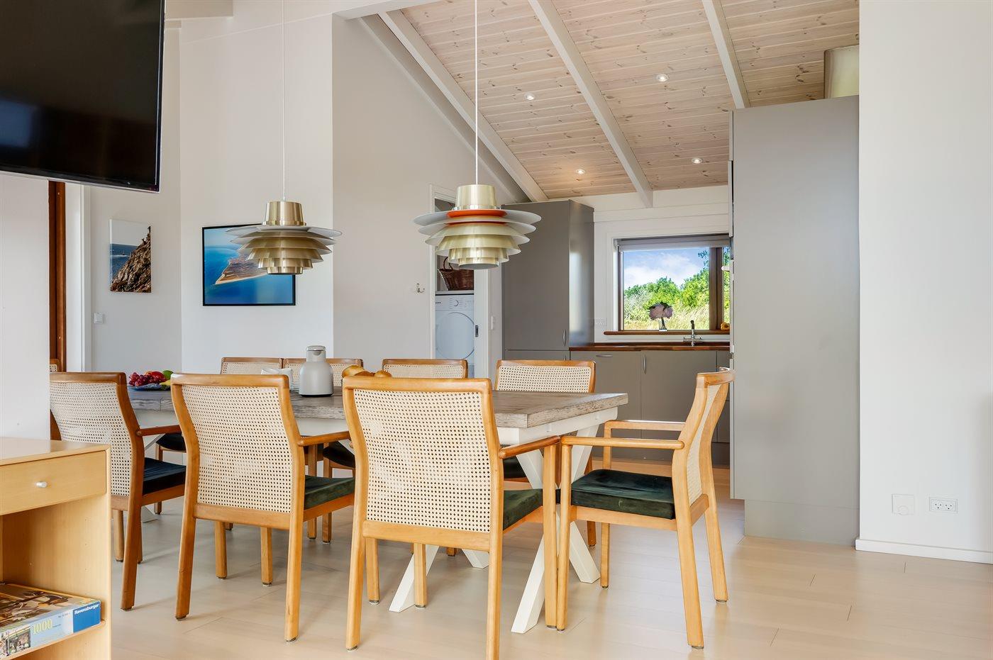 Køkkenet er udstyret med 1 køleskab. Der er 4 induktionskogeplader, varmluftovn, mikrobølgeovn samt opvaskemaskine.