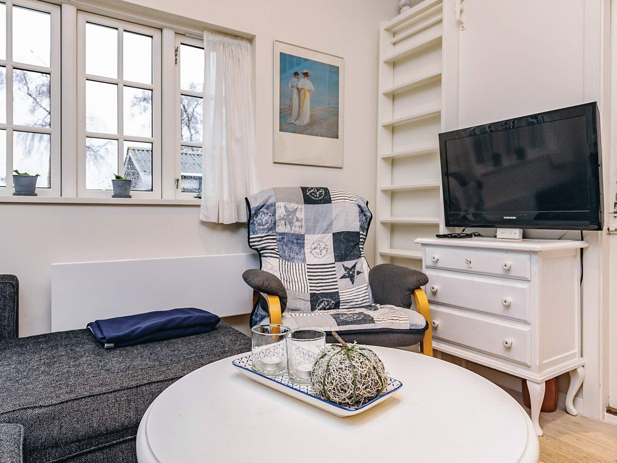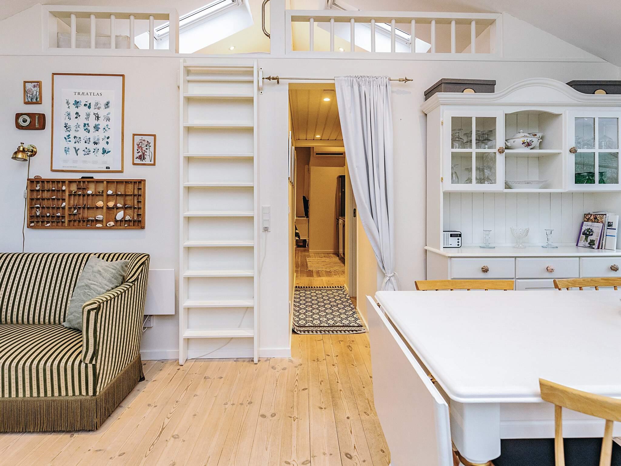 Der er også en dejlig stor og lys stue med spiseplads og sofa. Fra stuen er der adgang til hems med 2 sovepladser.