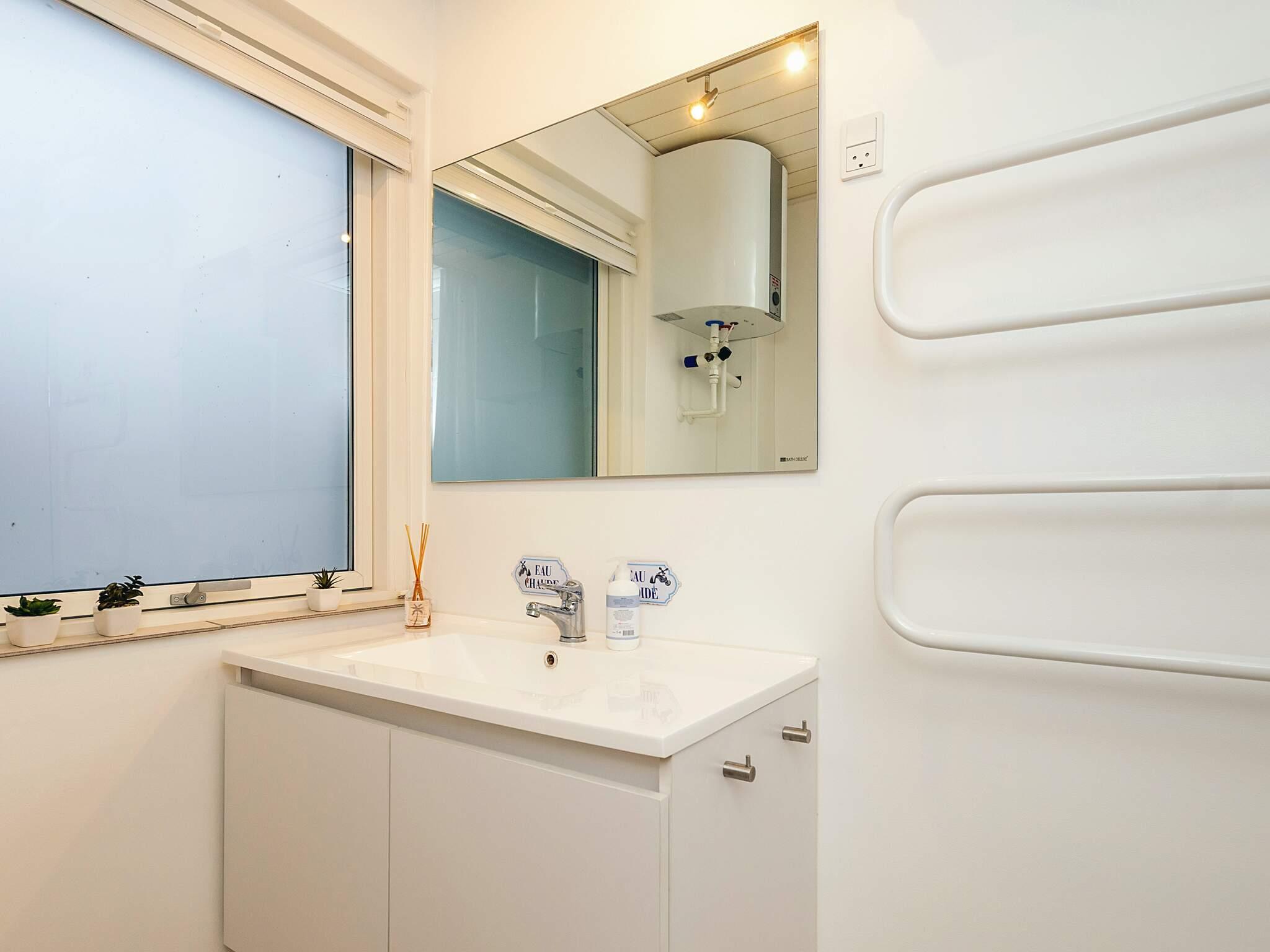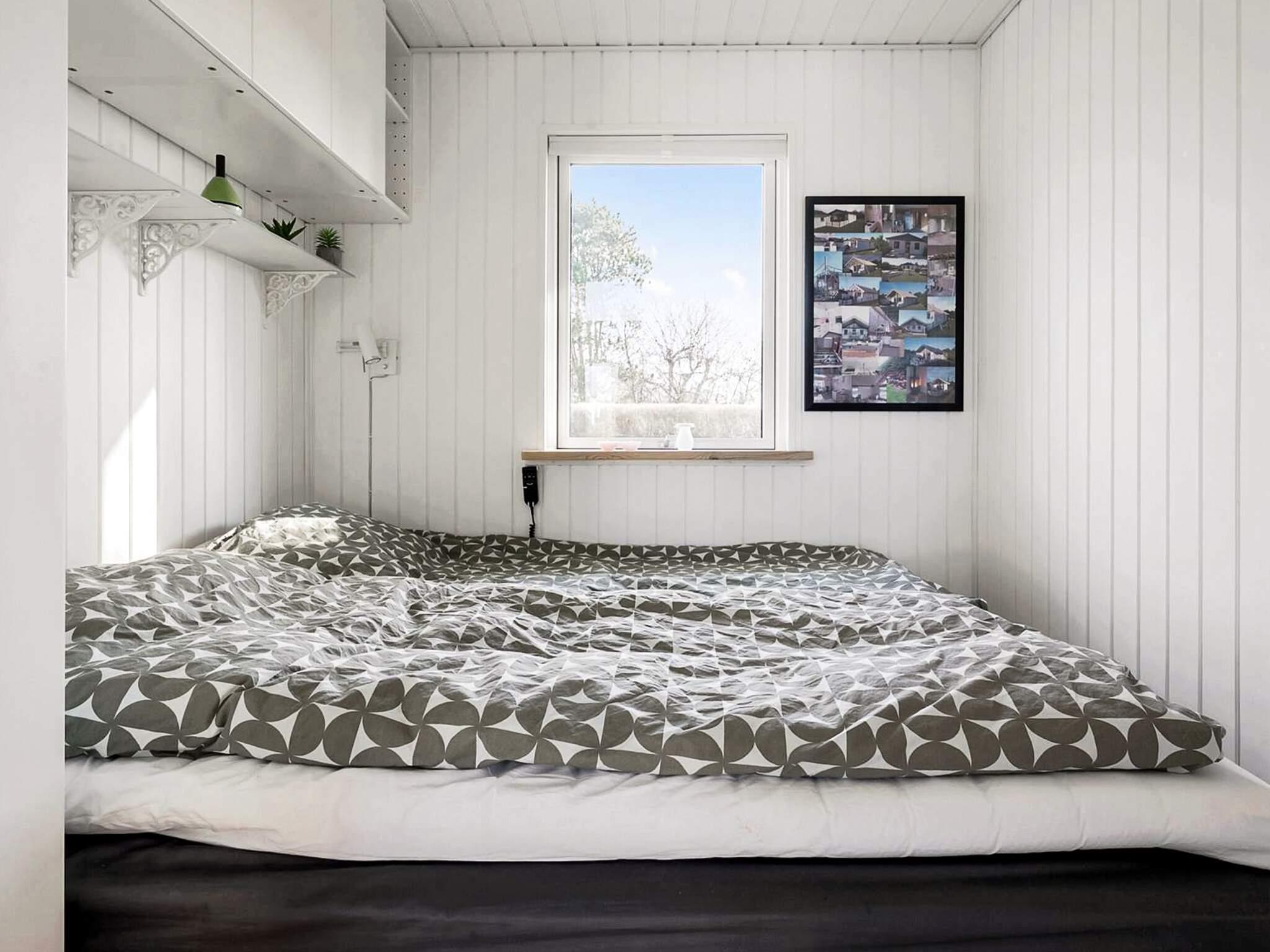 Det flotte køkken er i åben forbindelse med stuen, hvor loft til kip og en hyggelig brændeovn skaber en indbydende atmosfære. Derudover er der installeret en luft/luft varmepumpe, som sikrer et behageligt indeklima året rundt. Soveværelset er lyst og indbydende, og badeværelset er moderne med bruseniche.