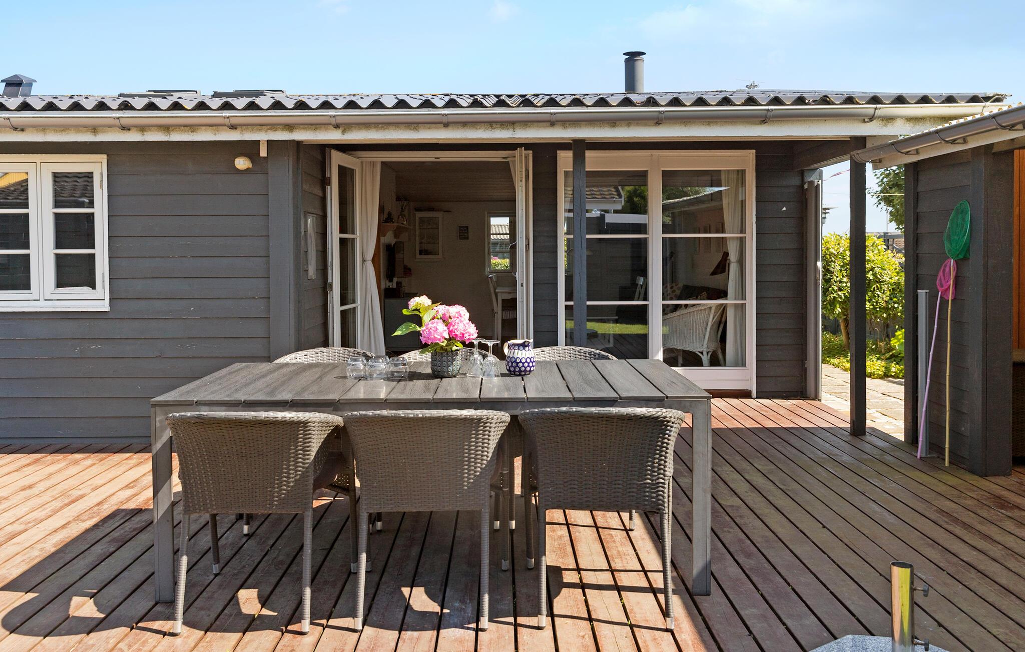Indbydende træhus tæt på stranden i Karrebæksminde med stor terrasse og hyggelig atmosfære.