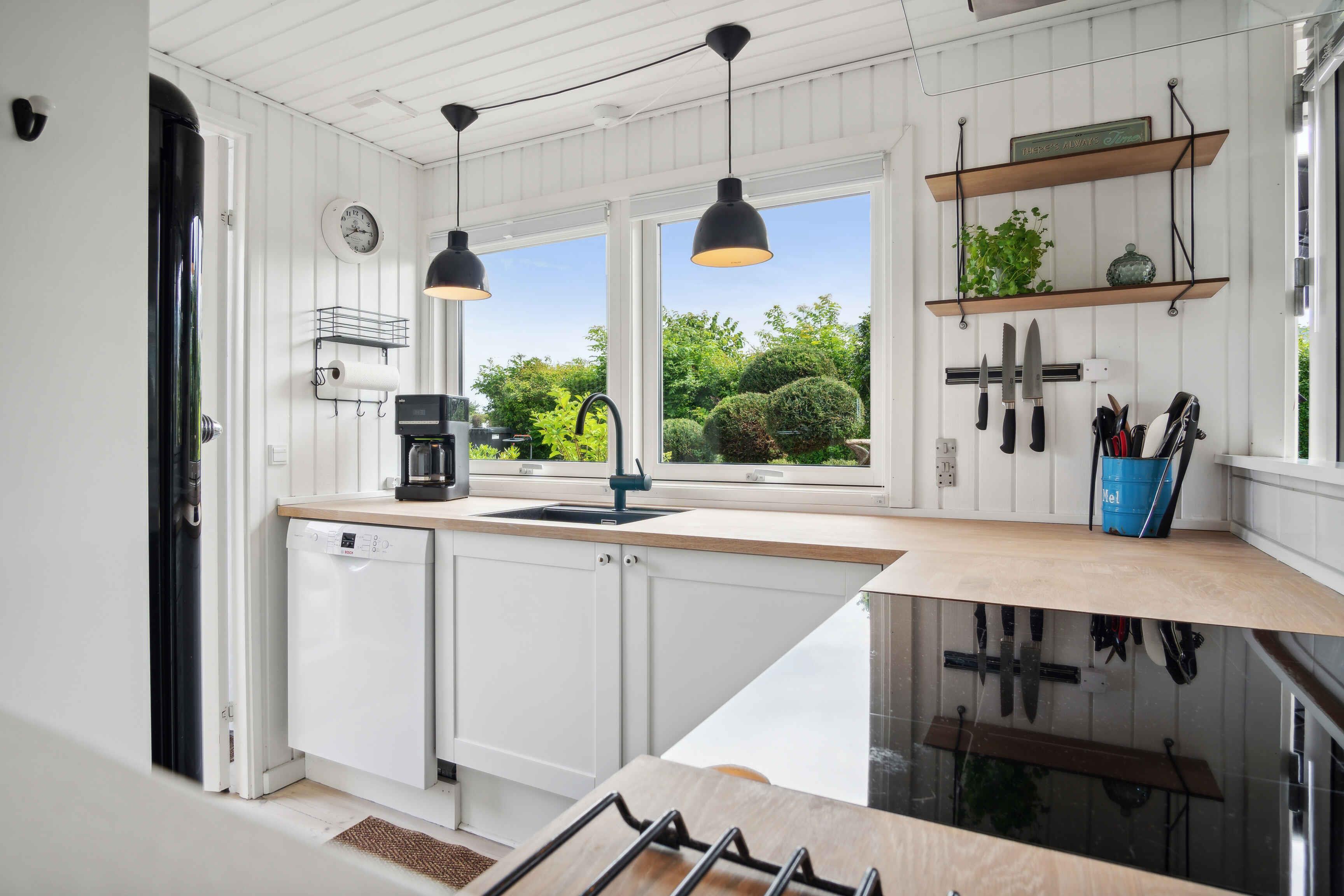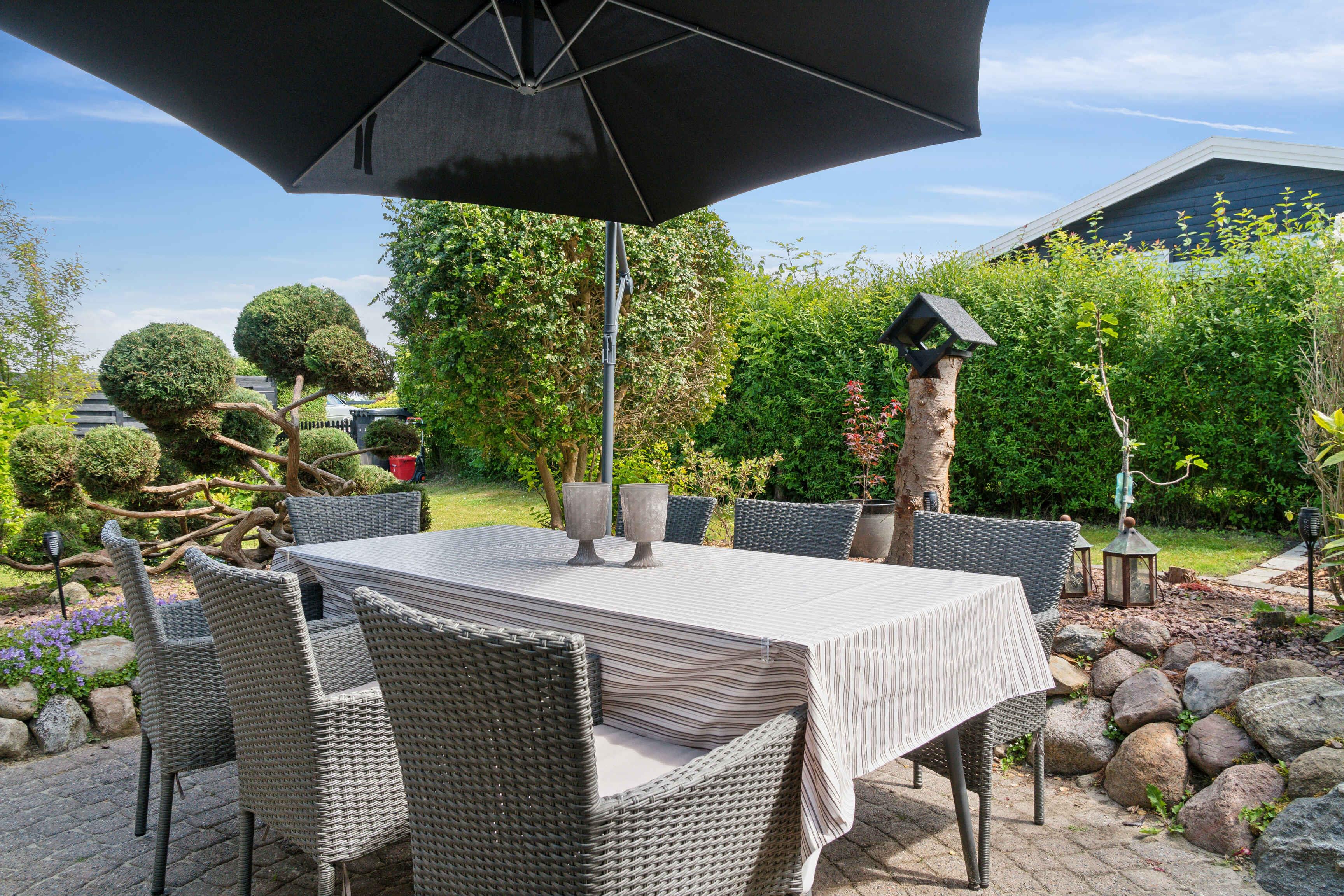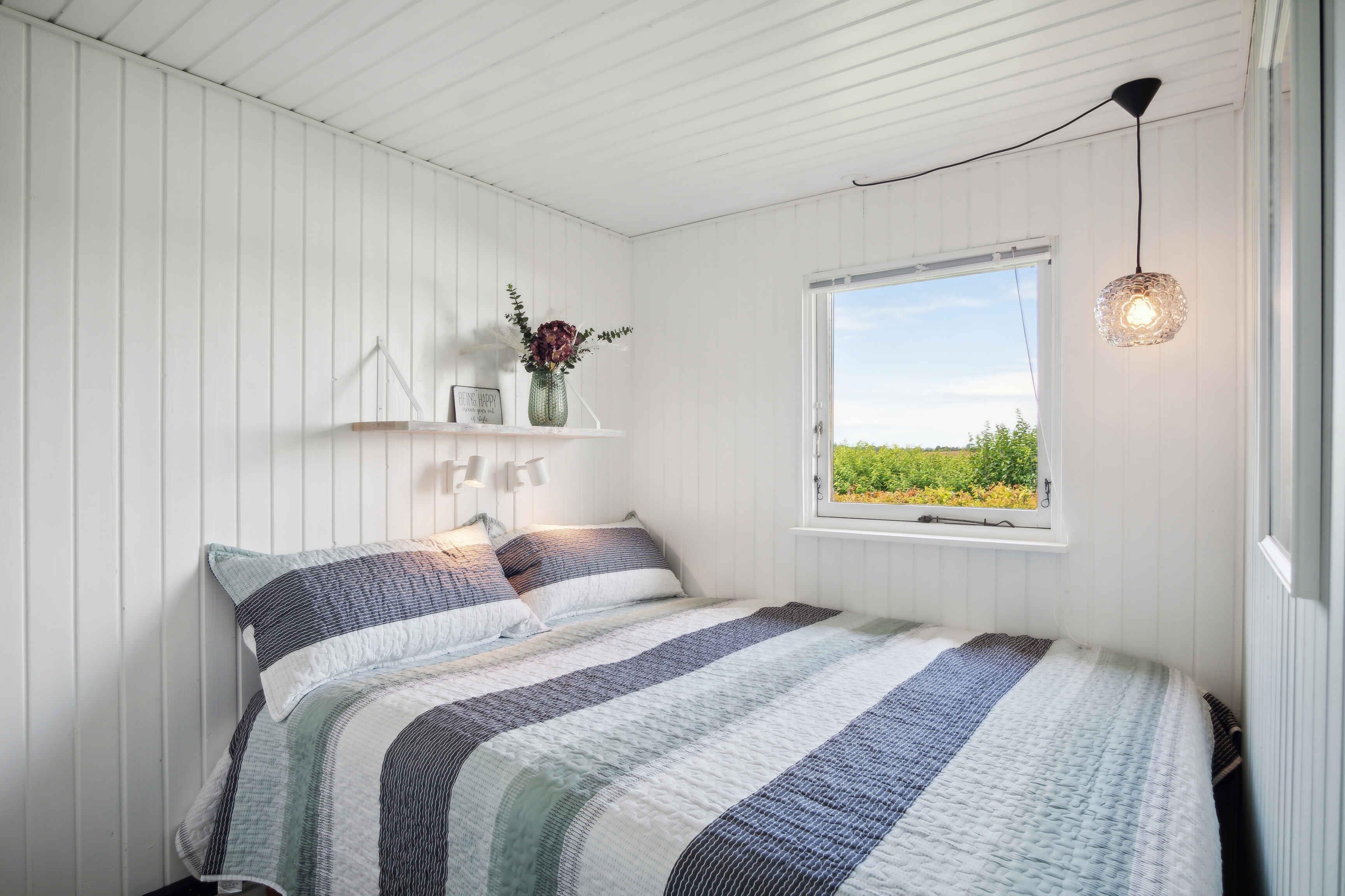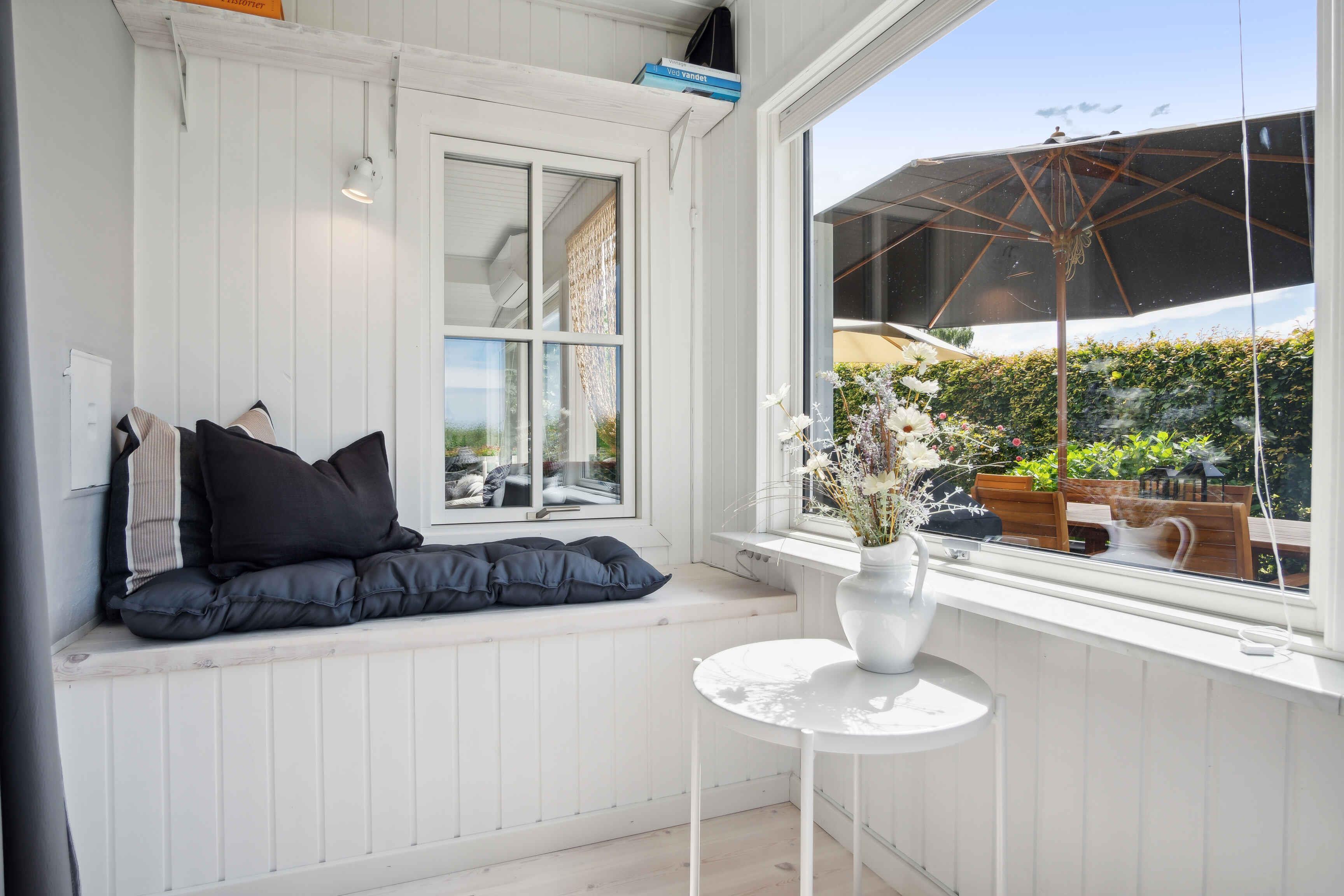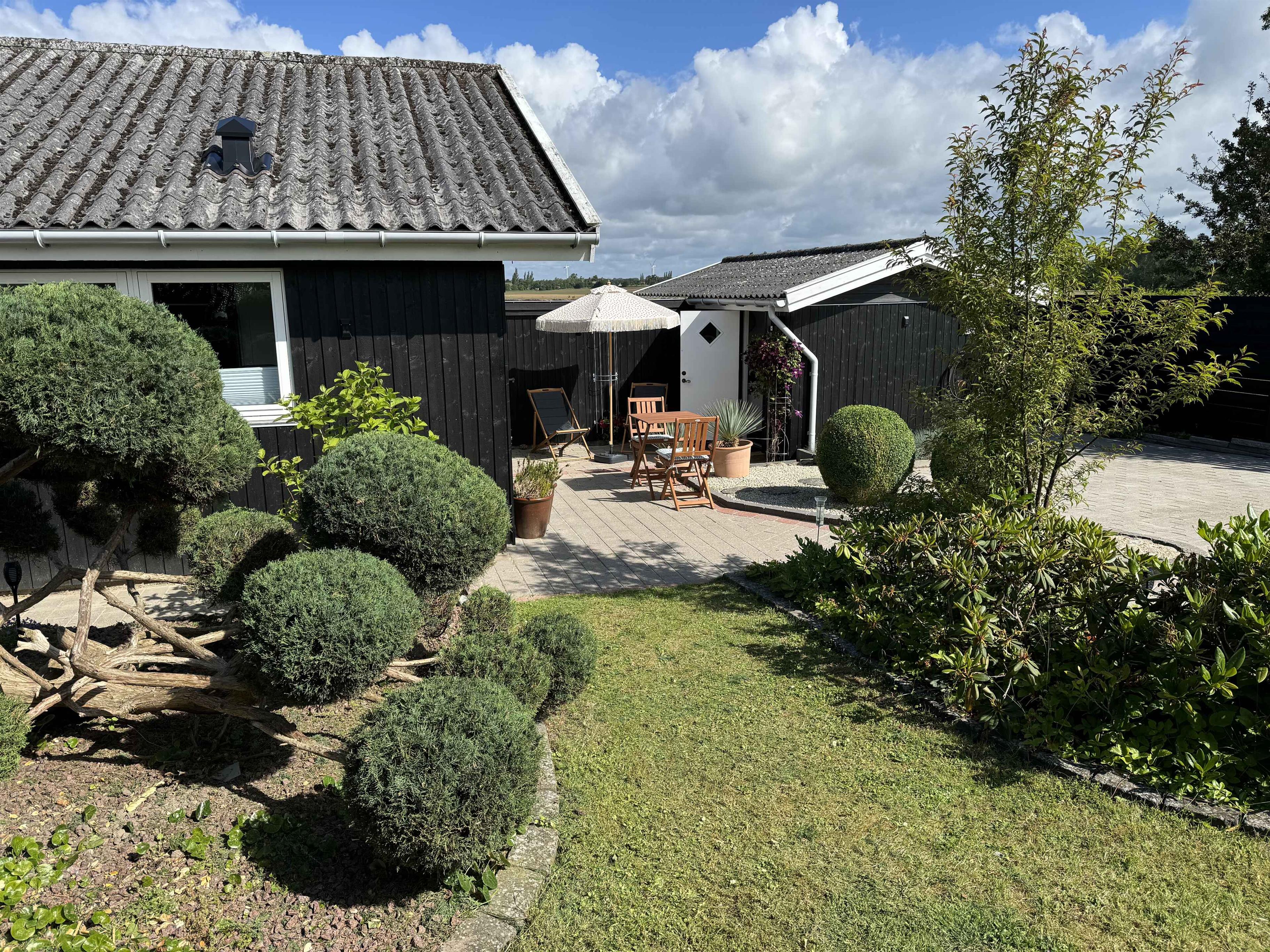 Dette charmerende sommerhus er indrettet i en lys og venlig badehotel-stil og ligger i et fredeligt område med få naboer og direkte adgang til store grønne arealer. Huset har plads til 8 personer med fire sengepladser: en dobbeltseng på 180x200 cm og tre dobbeltsenge på 160x200 cm fordelt på tre værelser i hovedhuset og et værelse i annekset, som også har eget toilet. Sommerhuset er udstyret med en praktisk vaskesøjle med varmepumpe-tørretumbler og et badeværelse med toilet og brus. I annekset findes et ekstra separat toilet. Det moderne køkken-alrum har alle nødvendige faciliteter, herunder induktionskomfur, ovn, emhætte, køle-fryseskab, mikroovn og opvaskemaskine. Stuen er udstyret med TV, pejseindsats og varmepumpe, mens de øvrige rum har nye el-radiatorer. For familier med små børn er der både weekendseng og højstol til rådighed. Desuden findes der strygejern og strygebræt, hvilket gør det nemt at holde tøjet pænt under opholdet. Sommerhuset har to dejlige terrasser med plads til 8-10 personer samt et drivhus, der om sommeren er indrettet som et hyggeligt orangeri. Der er også et ekstra stort køle-fryseskab i skuret. For dem, der har brug for at arbejde, er der indrettet en arbejdsplads med en stor ekstern skærm og fibernet, der sikrer hurtig internetforbindelse. Sommerhuset er også praktisk med el-oplader til bilen i indkørslen, som har plads til op til 3 biler indenfor hegnet. Hele grunden er indhegnet, og det er tilladt at medbringe op til to hunde. Bemærk, at der ikke må ryges indendørs, og rengøring er obligatorisk. Sommerhuset udlejes ikke til ungdomsgrupper under 25 år. Obs, udlejes ikke til erhversmæssigt brug.