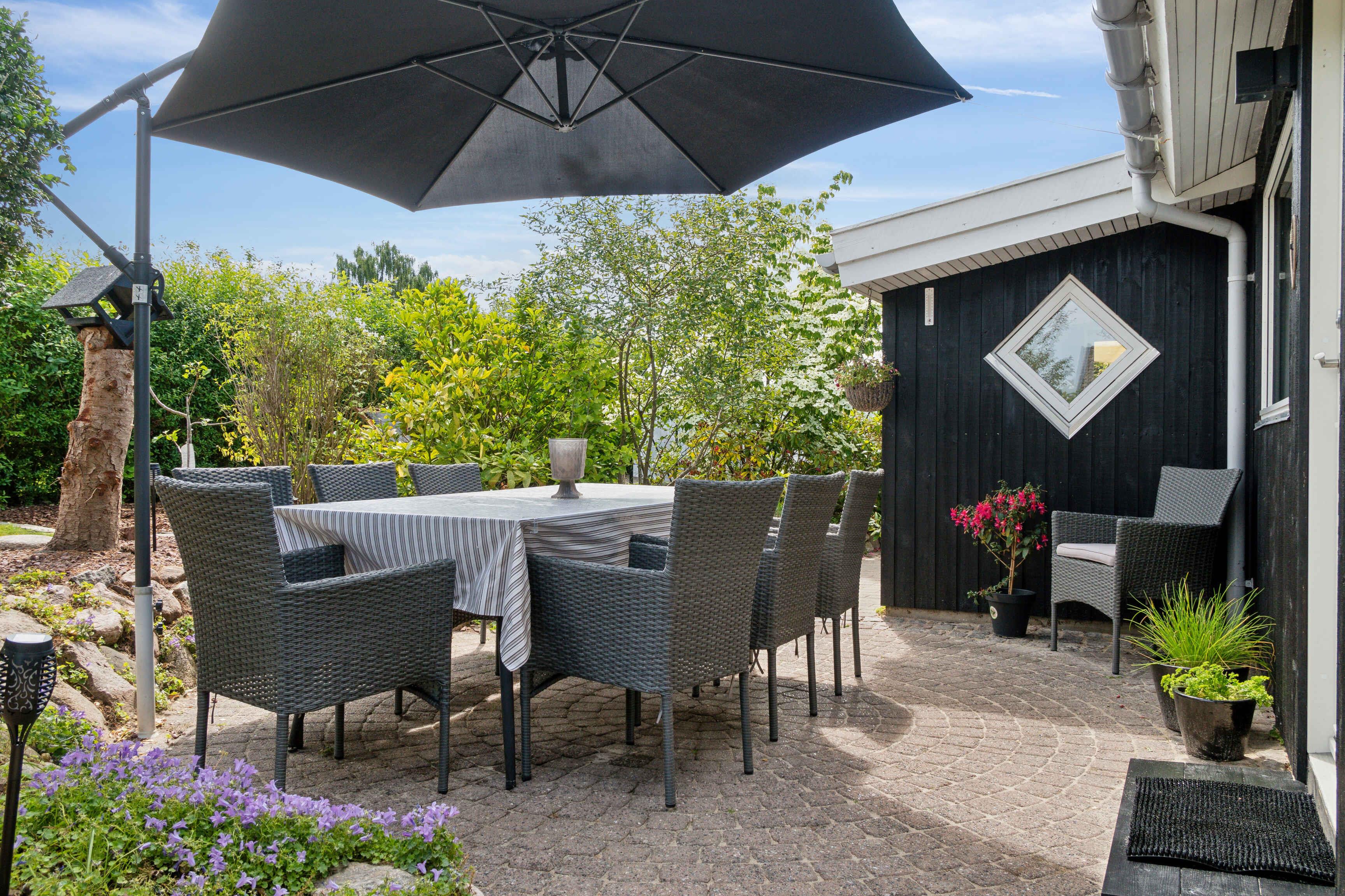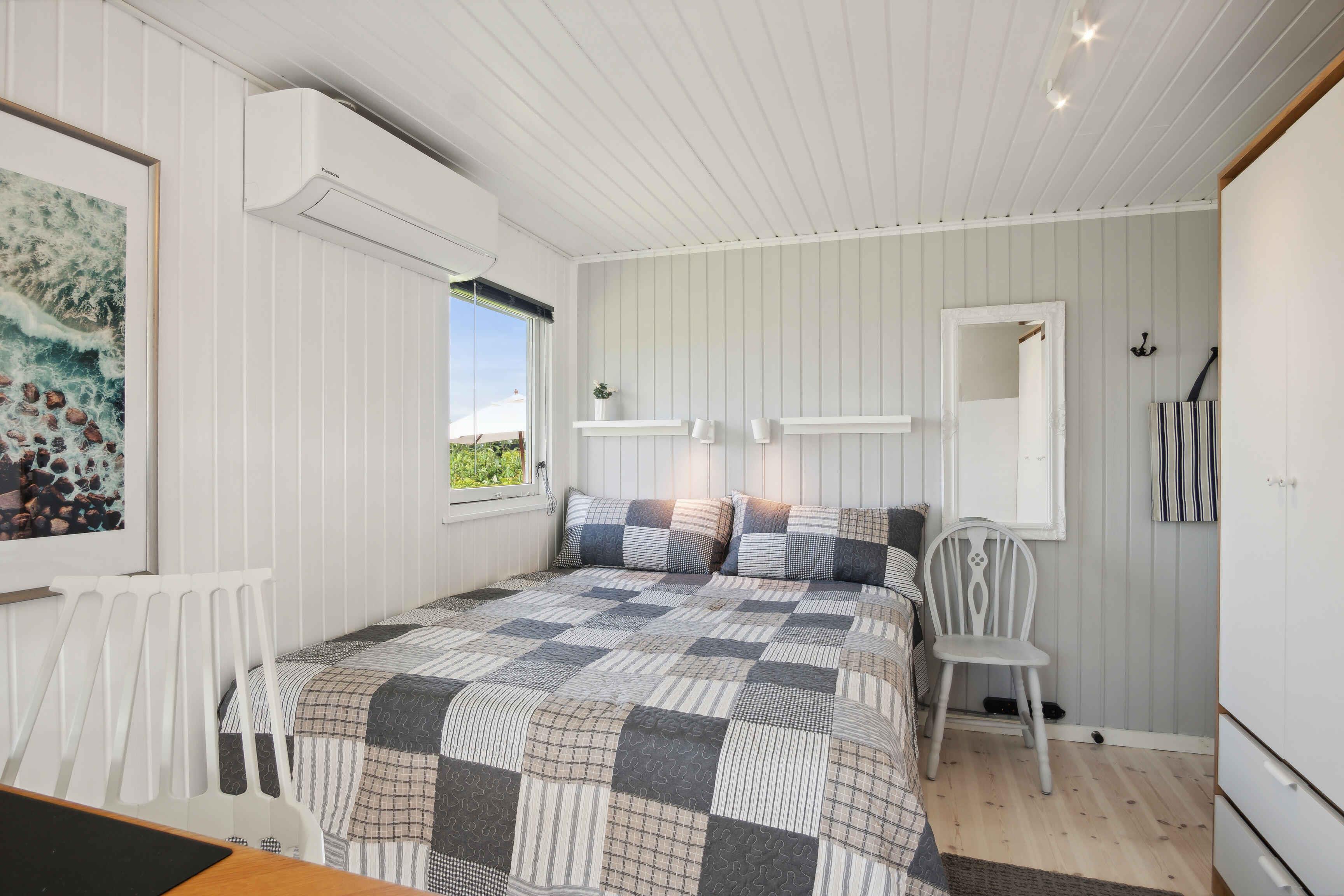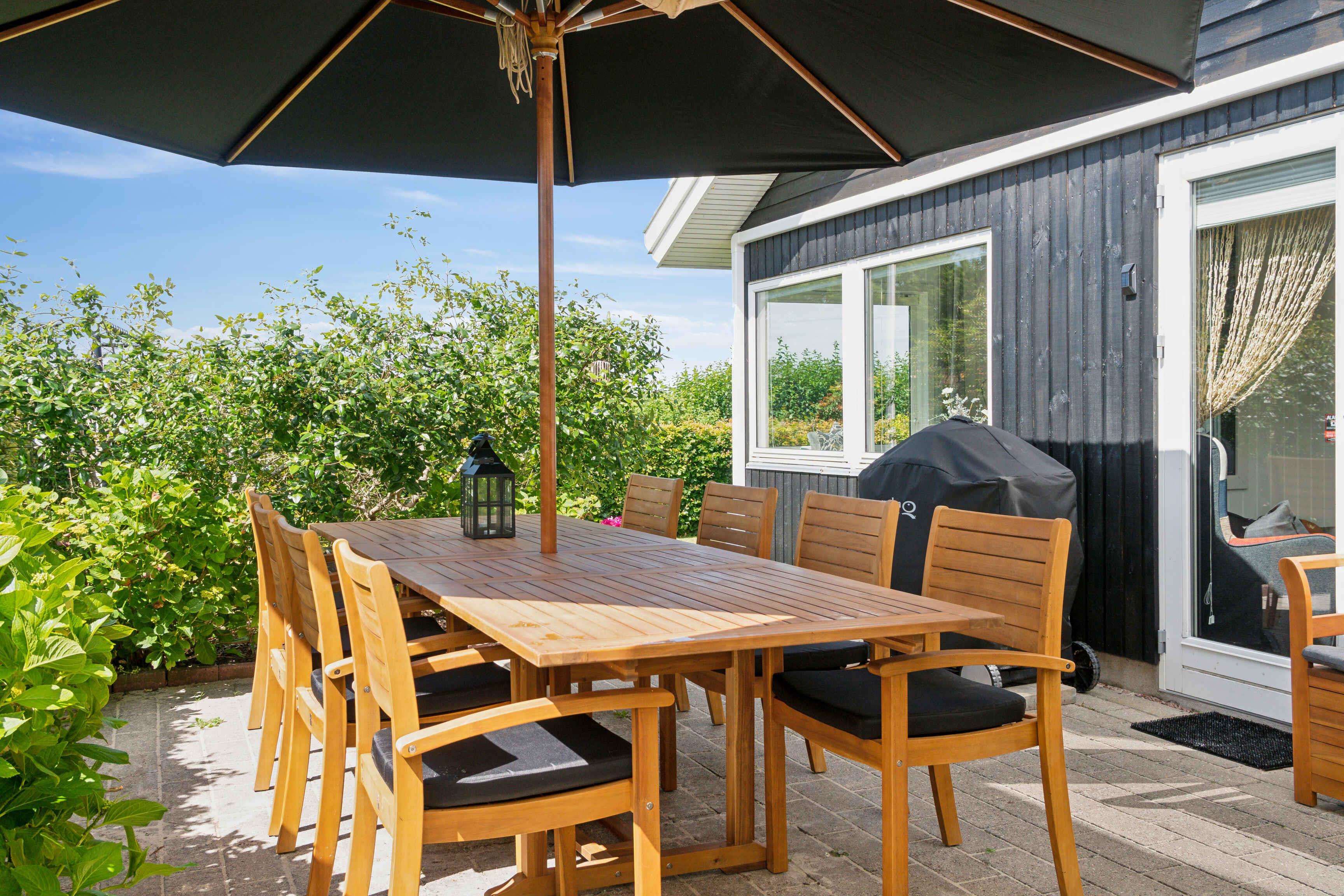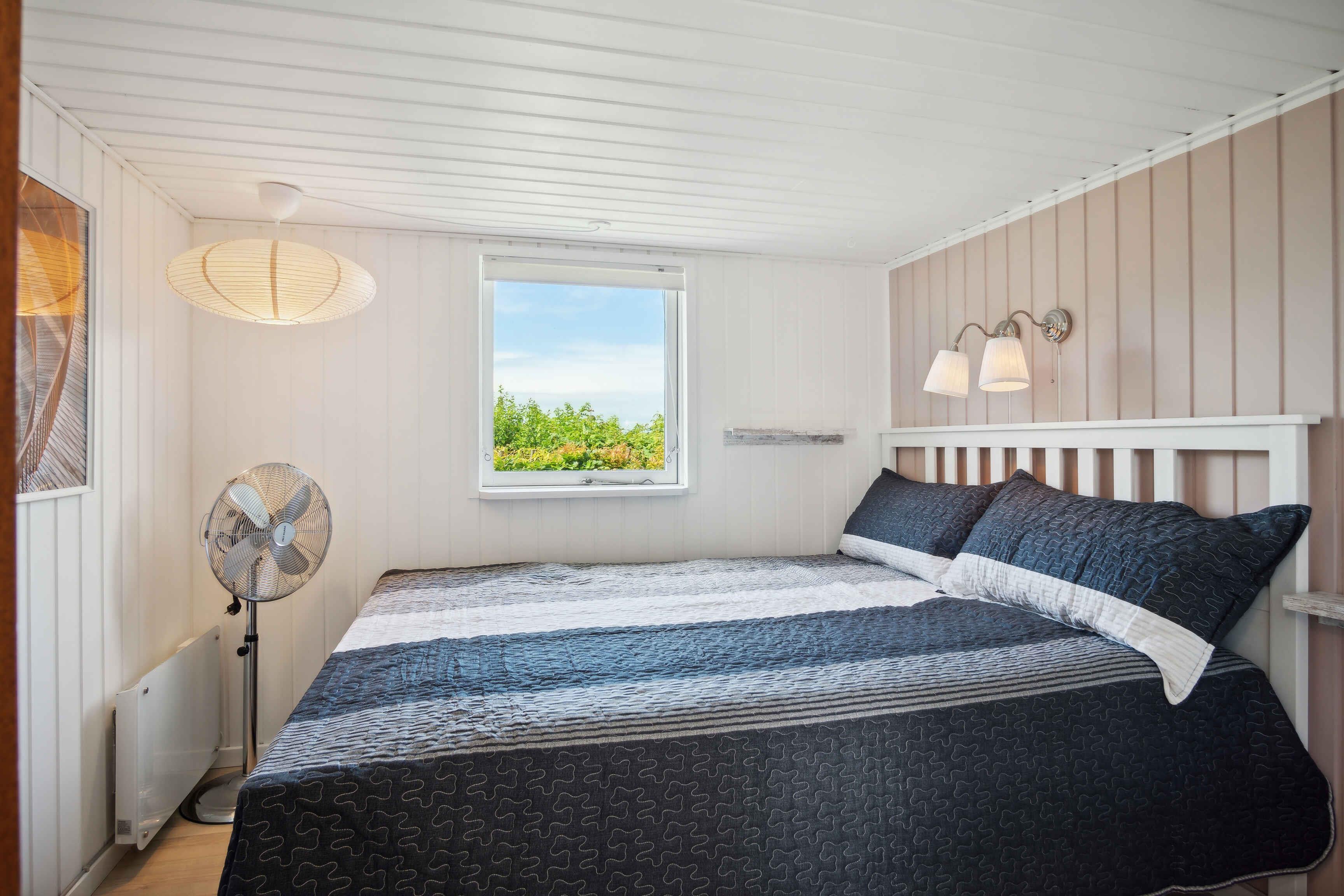 Dette charmerende sommerhus er indrettet i en lys og venlig badehotel-stil og ligger i et fredeligt område med få naboer og direkte adgang til store grønne arealer. Huset har plads til 8 personer med fire sengepladser: en dobbeltseng på 180x200 cm og tre dobbeltsenge på 160x200 cm fordelt på tre værelser i hovedhuset og et værelse i annekset, som også har eget toilet. Sommerhuset er udstyret med en praktisk vaskesøjle med varmepumpe-tørretumbler og et badeværelse med toilet og brus. I annekset findes et ekstra separat toilet. Det moderne køkken-alrum har alle nødvendige faciliteter, herunder induktionskomfur, ovn, emhætte, køle-fryseskab, mikroovn og opvaskemaskine. Stuen er udstyret med TV, pejseindsats og varmepumpe, mens de øvrige rum har nye el-radiatorer. For familier med små børn er der både weekendseng og højstol til rådighed. Desuden findes der strygejern og strygebræt, hvilket gør det nemt at holde tøjet pænt under opholdet. Sommerhuset har to dejlige terrasser med plads til 8-10 personer samt et drivhus, der om sommeren er indrettet som et hyggeligt orangeri. Der er også et ekstra stort køle-fryseskab i skuret. For dem, der har brug for at arbejde, er der indrettet en arbejdsplads med en stor ekstern skærm og fibernet, der sikrer hurtig internetforbindelse. Sommerhuset er også praktisk med el-oplader til bilen i indkørslen, som har plads til op til 3 biler indenfor hegnet. Hele grunden er indhegnet, og det er tilladt at medbringe op til to hunde. Bemærk, at der ikke må ryges indendørs, og rengøring er obligatorisk. Sommerhuset udlejes ikke til ungdomsgrupper under 25 år. Obs, udlejes ikke til erhversmæssigt brug.