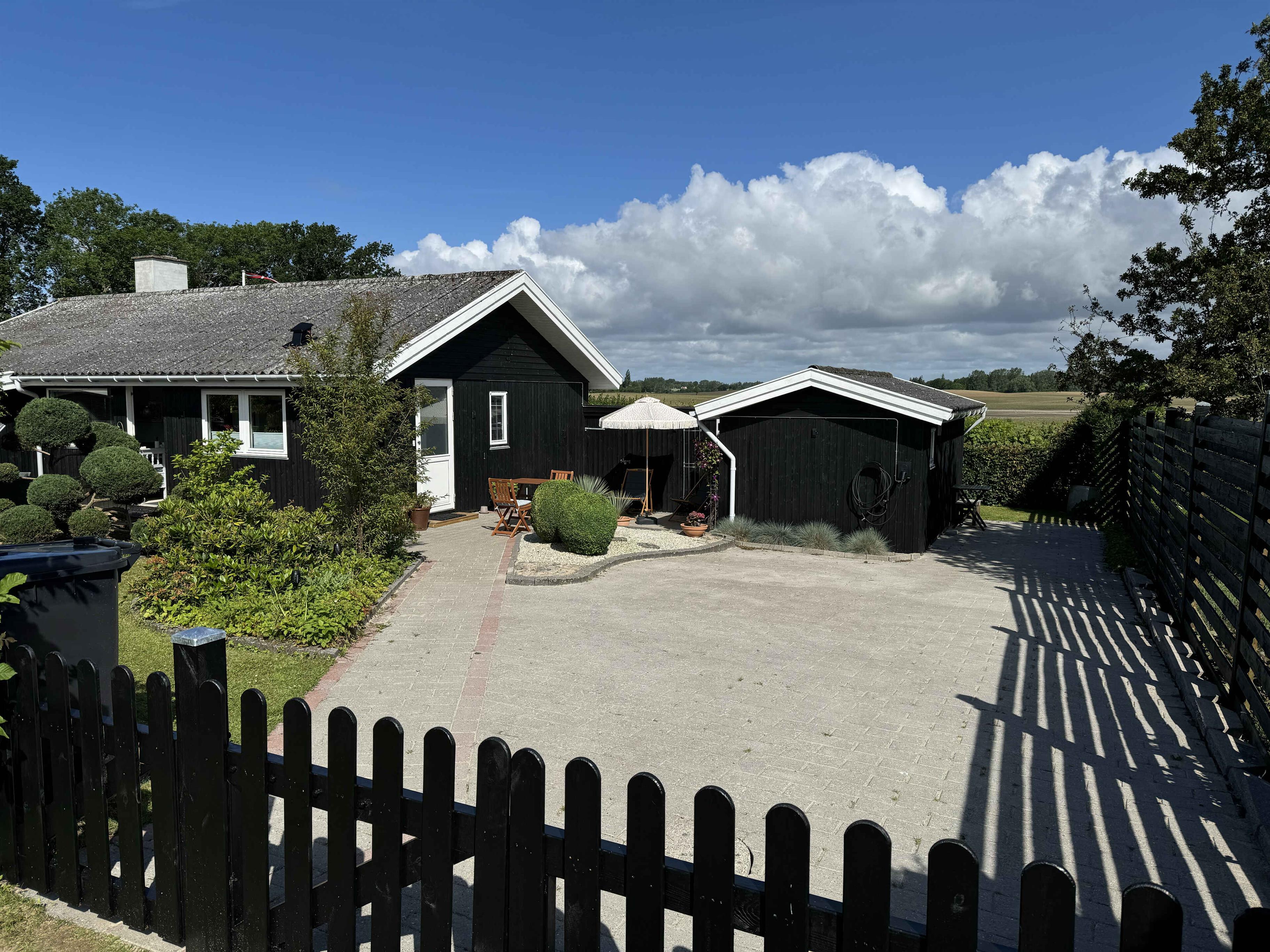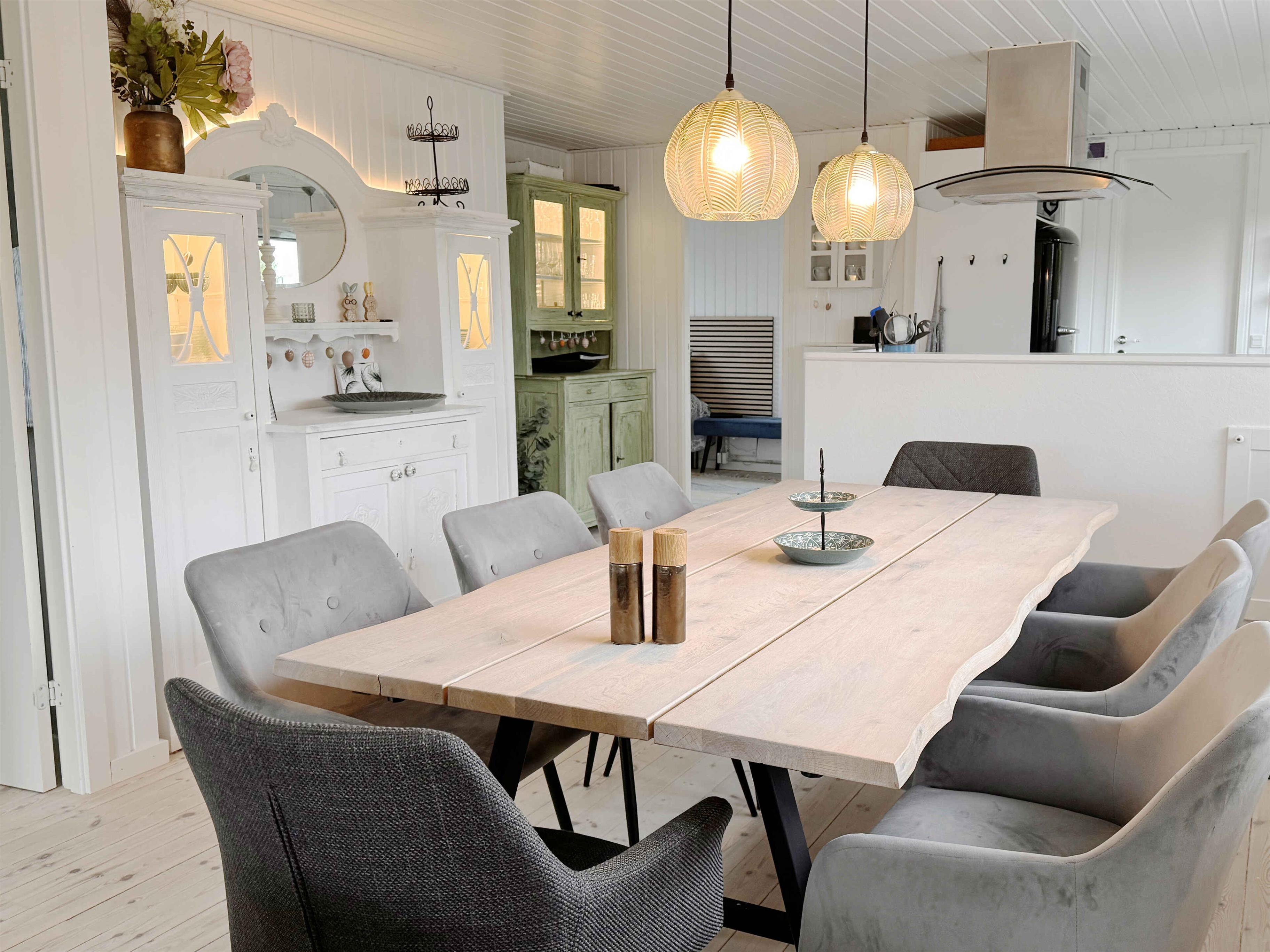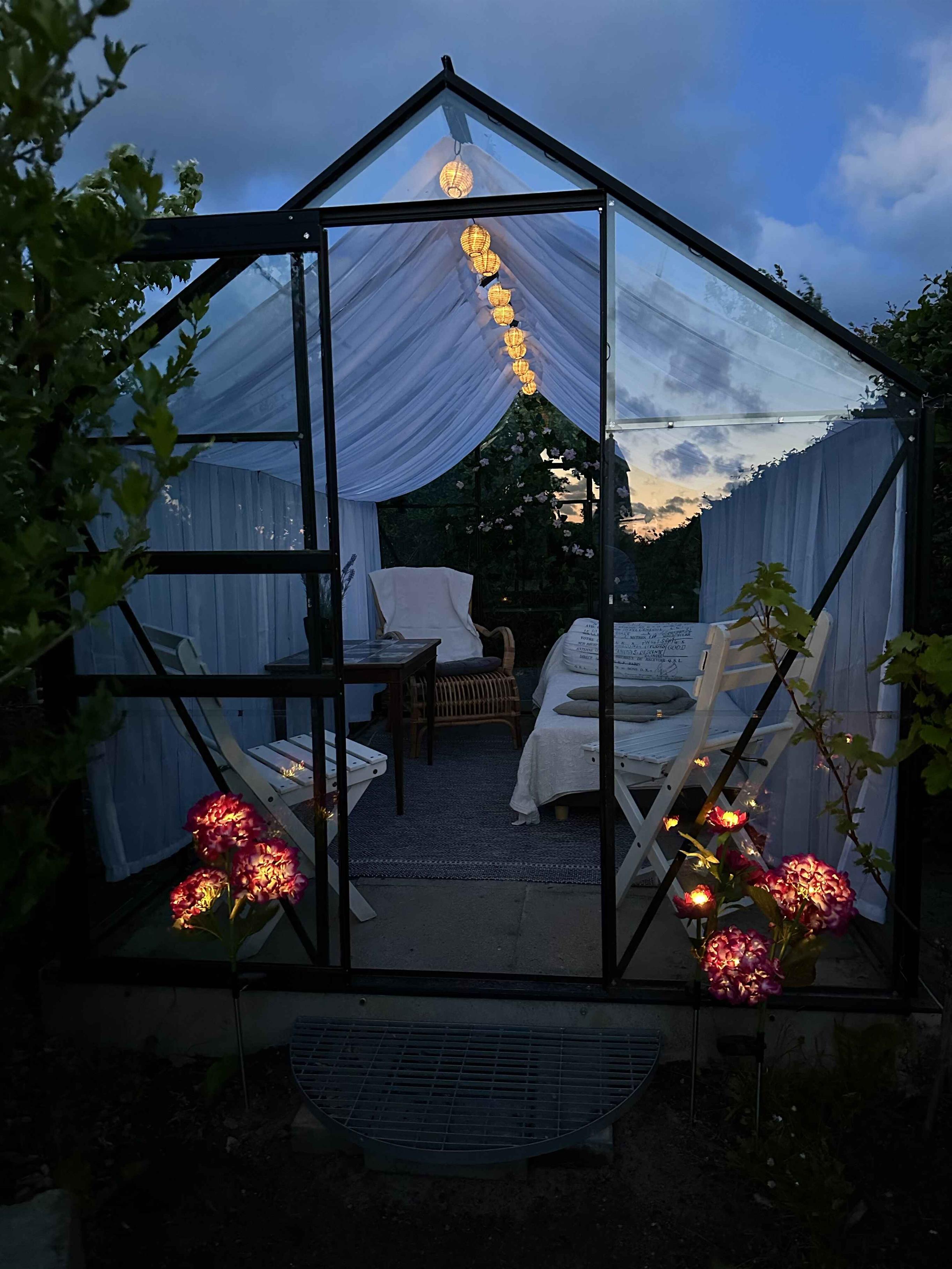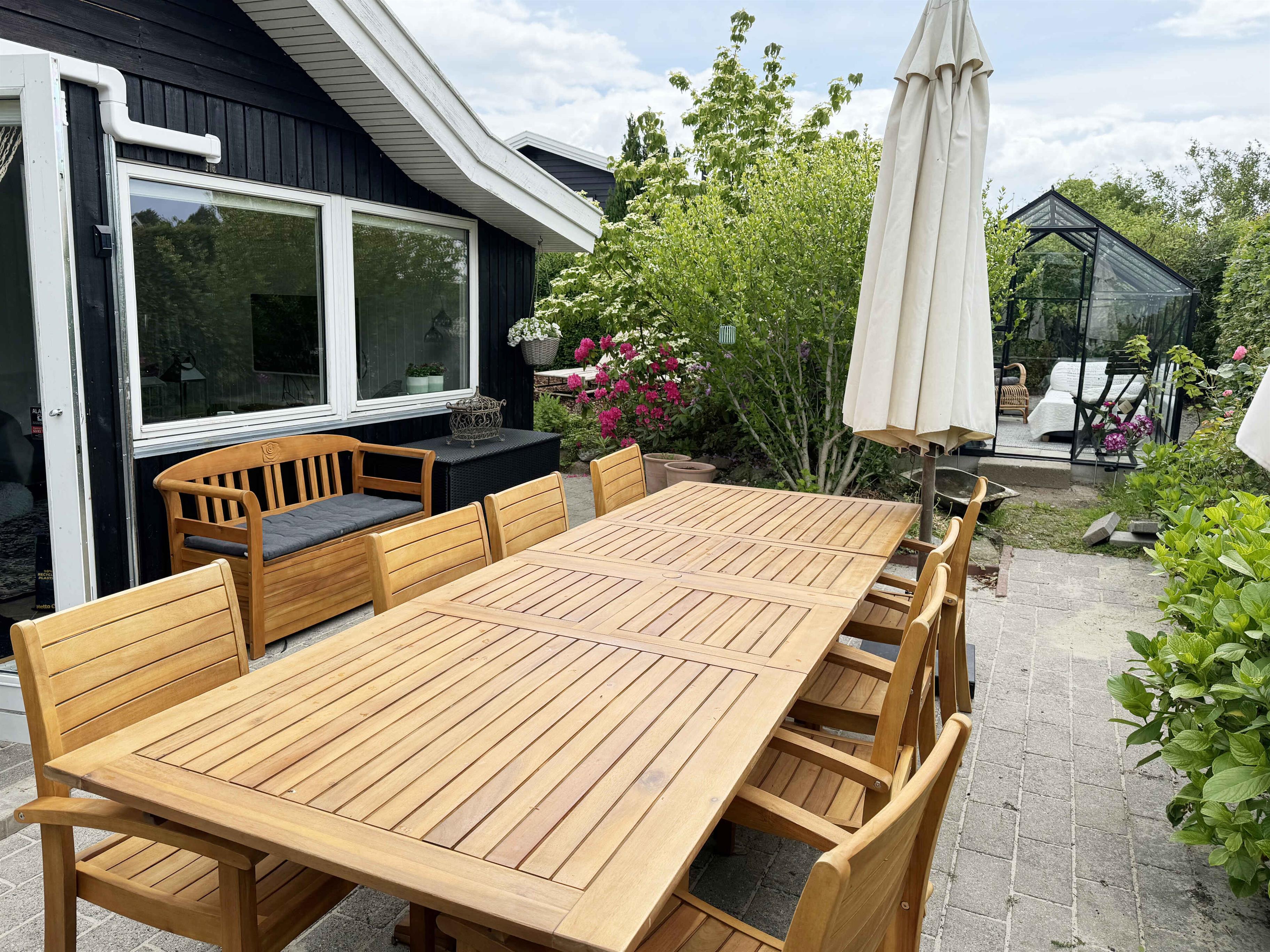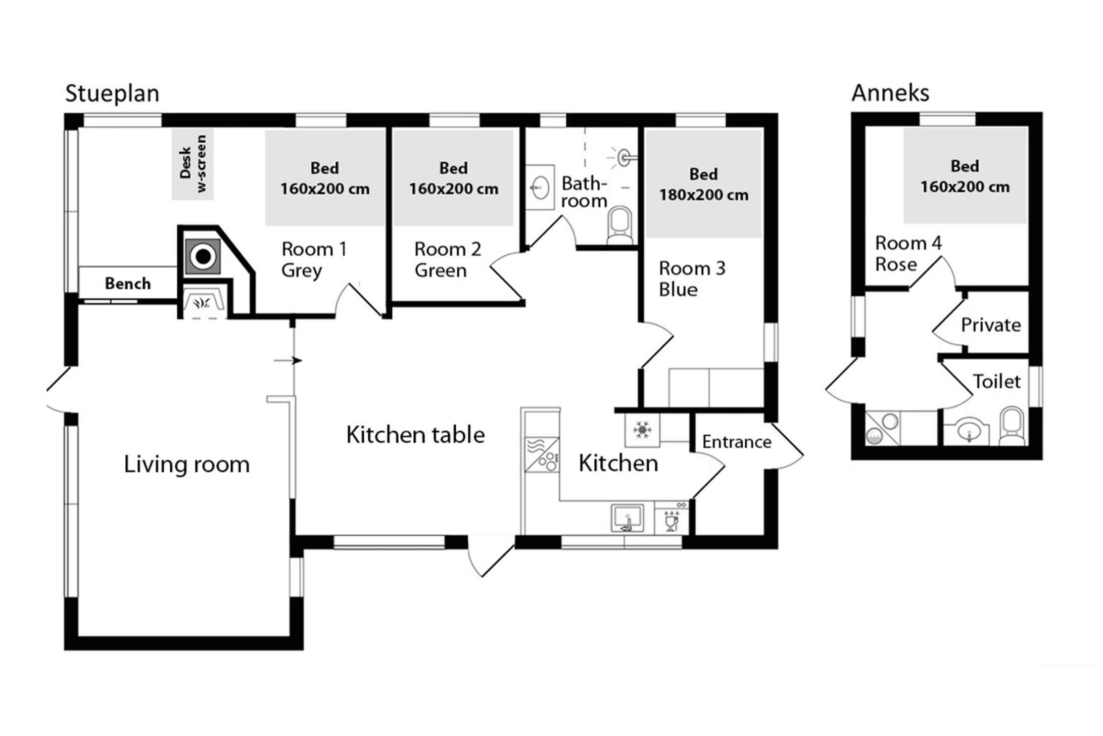 Dette charmerende sommerhus er indrettet i en lys og venlig badehotel-stil og ligger i et fredeligt område med få naboer og direkte adgang til store grønne arealer. Huset har plads til 8 personer med fire sengepladser: en dobbeltseng på 180x200 cm og tre dobbeltsenge på 160x200 cm fordelt på tre værelser i hovedhuset og et værelse i annekset, som også har eget toilet. Sommerhuset er udstyret med en praktisk vaskesøjle med varmepumpe-tørretumbler og et badeværelse med toilet og brus. I annekset findes et ekstra separat toilet. Det moderne køkken-alrum har alle nødvendige faciliteter, herunder induktionskomfur, ovn, emhætte, køle-fryseskab, mikroovn og opvaskemaskine. Stuen er udstyret med TV, pejseindsats og varmepumpe, mens de øvrige rum har nye el-radiatorer. For familier med små børn er der både weekendseng og højstol til rådighed. Desuden findes der strygejern og strygebræt, hvilket gør det nemt at holde tøjet pænt under opholdet. Sommerhuset har to dejlige terrasser med plads til 8-10 personer samt et drivhus, der om sommeren er indrettet som et hyggeligt orangeri. Der er også et ekstra stort køle-fryseskab i skuret. For dem, der har brug for at arbejde, er der indrettet en arbejdsplads med en stor ekstern skærm og fibernet, der sikrer hurtig internetforbindelse. Sommerhuset er også praktisk med el-oplader til bilen i indkørslen, som har plads til op til 3 biler indenfor hegnet. Hele grunden er indhegnet, og det er tilladt at medbringe op til to hunde. Bemærk, at der ikke må ryges indendørs, og rengøring er obligatorisk. Sommerhuset udlejes ikke til ungdomsgrupper under 25 år. Obs, udlejes ikke til erhversmæssigt brug.