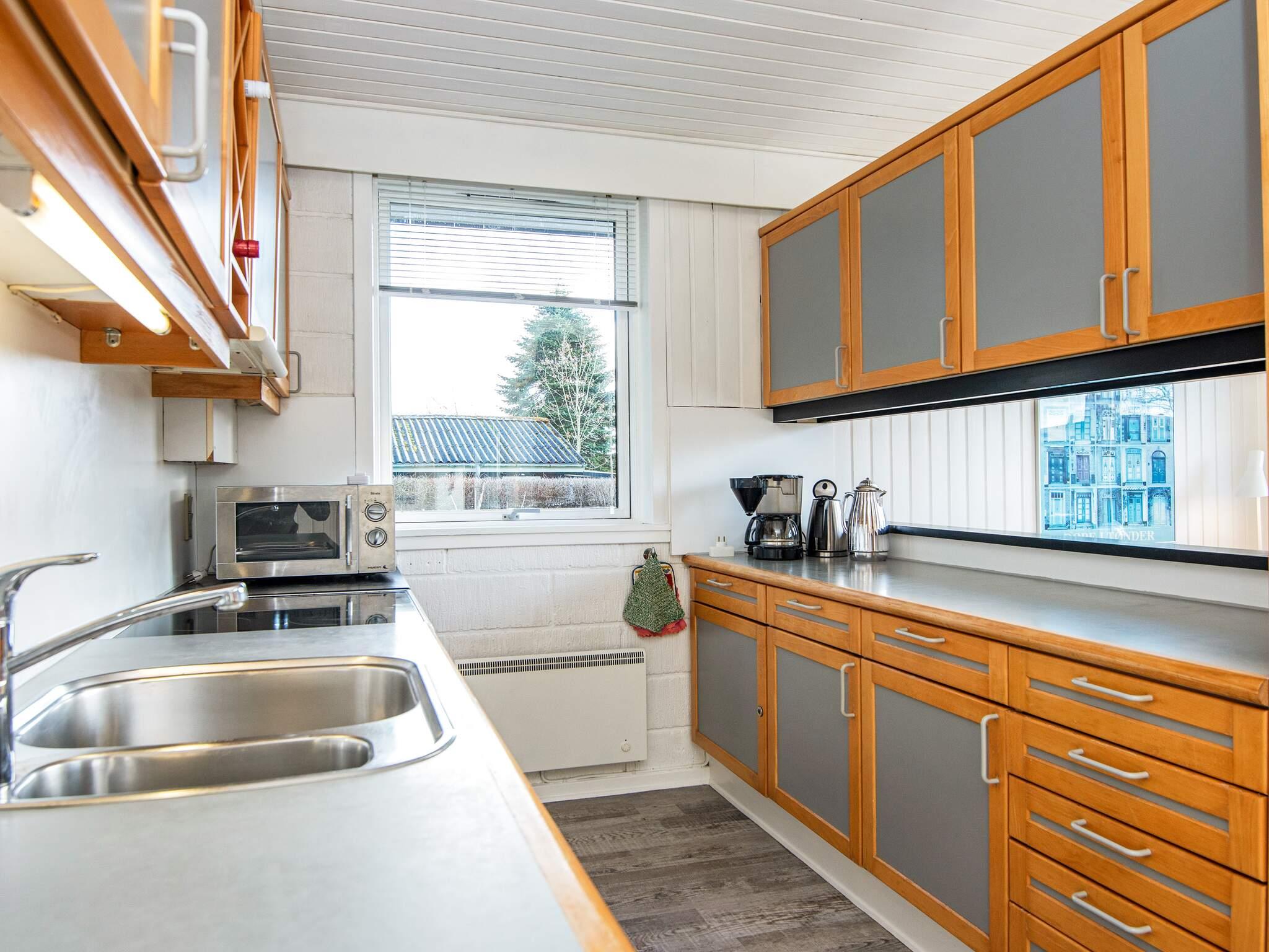 Køkken: Høj stol, el-komfur, køleskab m/frostboks, mikroovn, kaffemaskine, opvaskemask.