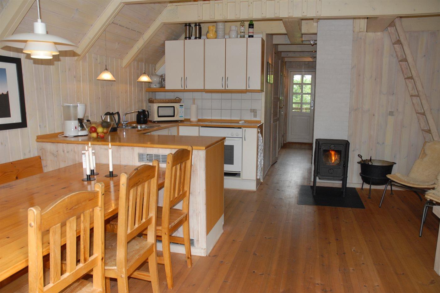 Køkkenet er udstyret med 1 køleskab. Der er 4 keramiske kogeplader, varmluftovn, mikrobølgeovn samt opvaskemaskine.