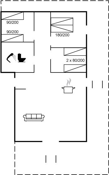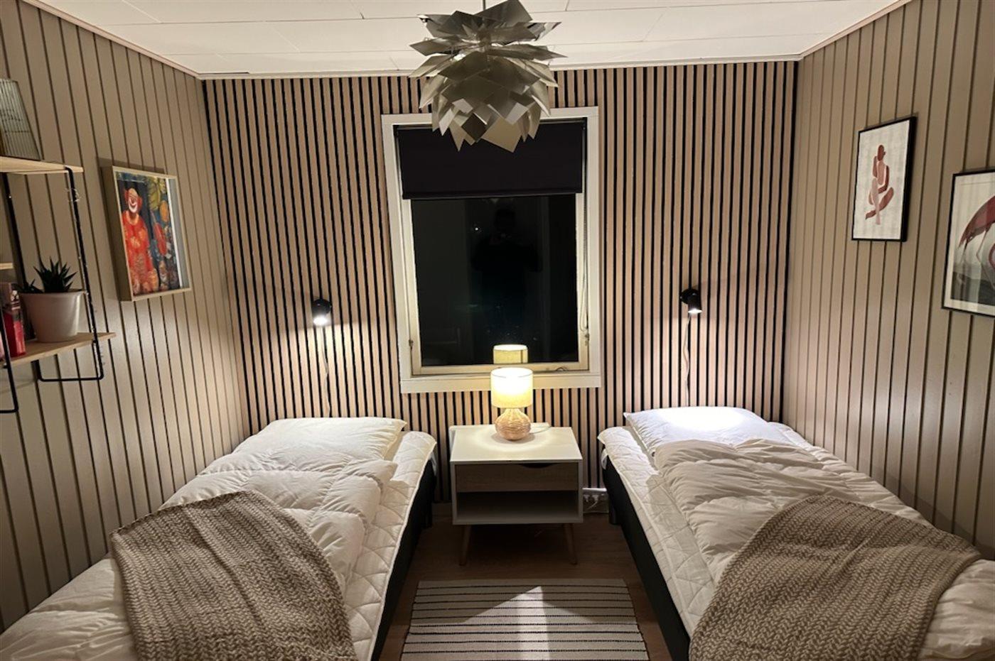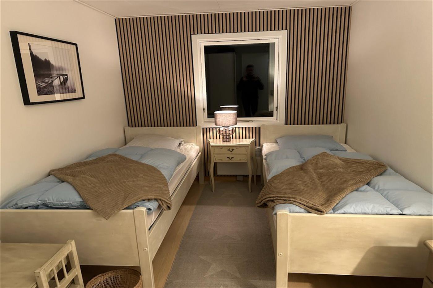 Der er i alt 3 soveværelser. Sovepladserne fordeler sig på: 2 sovepladser i dobbeltseng. 4 sovepladser i enkeltsenge. Derudover er der 1 stk. barneseng.