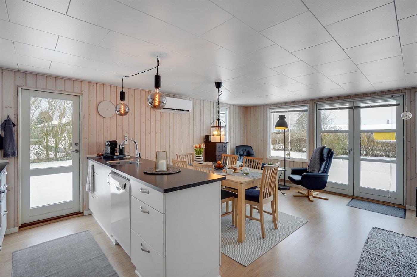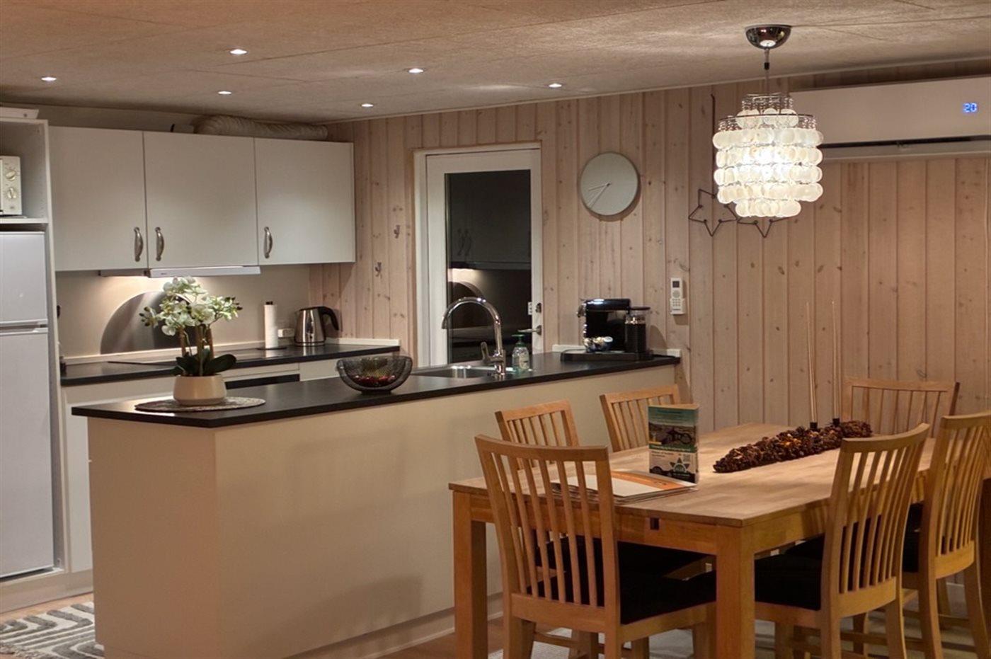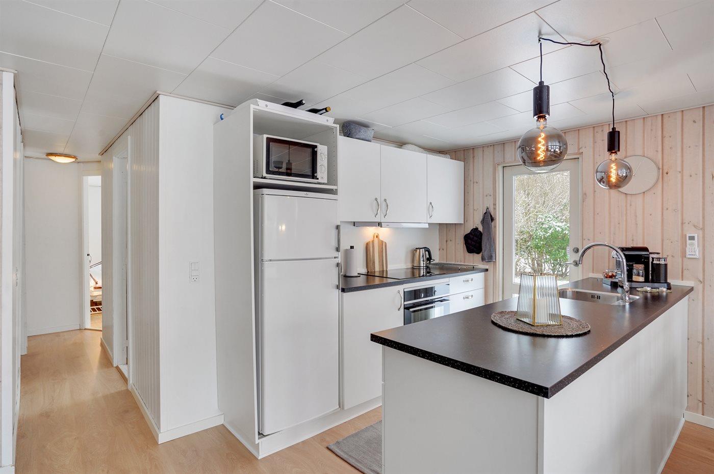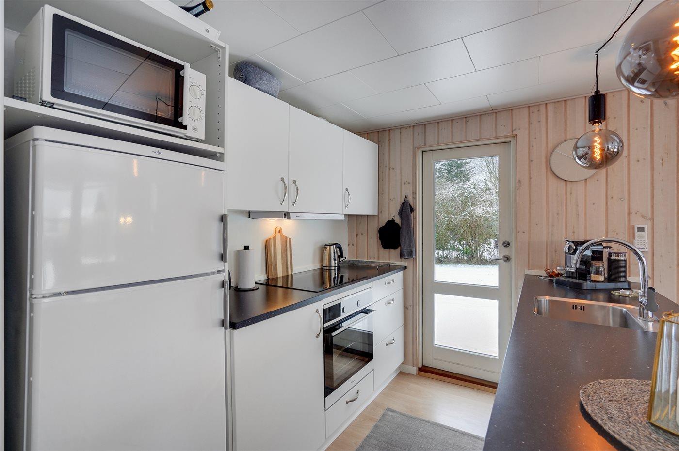 Køkkenet er udstyret med 1 køleskab. Der er 4 keramiske kogeplader, varmluftovn, mikrobølgeovn samt opvaskemaskine.