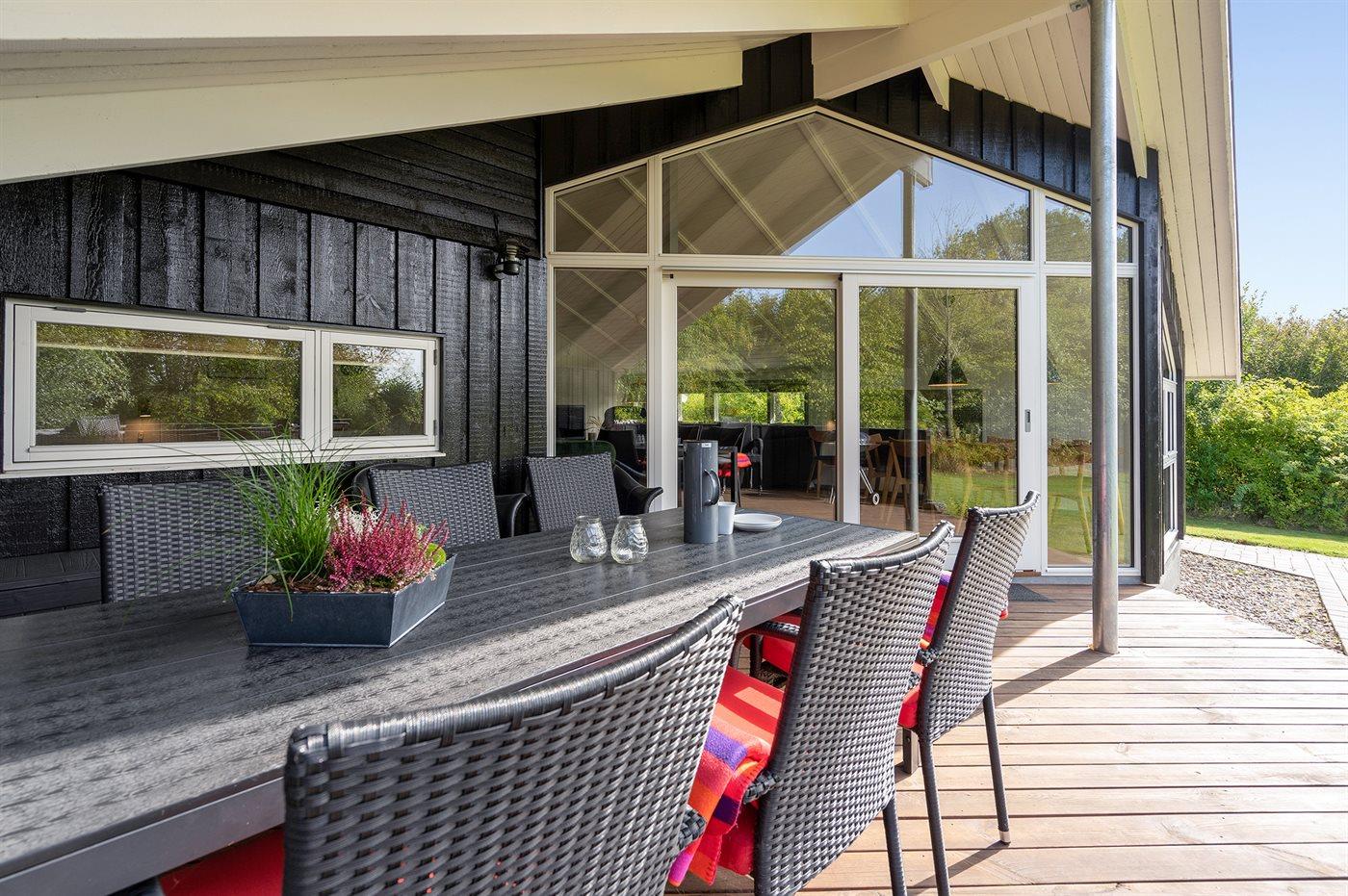 Ferieboligen er beliggende på en 1100 m² stor havegrund. Der er 450 m til havet. Nærmeste forretning er beliggende i en afstand af 10000 m. Til ferieboligen hører 50 m² terrasseareal. Desuden er der 20 m² overdækket terrasse. 2 solvogne. Der er redskabsrum. Grill til rådighed. Parkering ved ferieboligen.