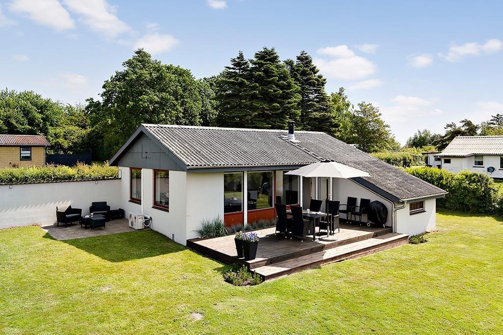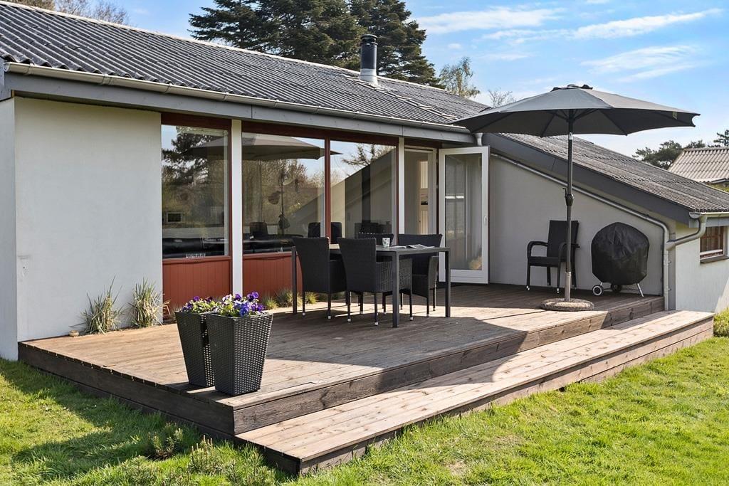 Udenfor finder du en stor, velplejet have med masser af plads til leg og afslapning. Den hyggelige træterrasse indbyder til morgenkaffe i solen eller grillhygge om aftenen. Fra terrassen er der havkig, og du kan høre bølgernes brusen i det fjerne. Den store græsplæne er perfekt til boldspil, solbadning eller en afslappet eftermiddag med en god bog.