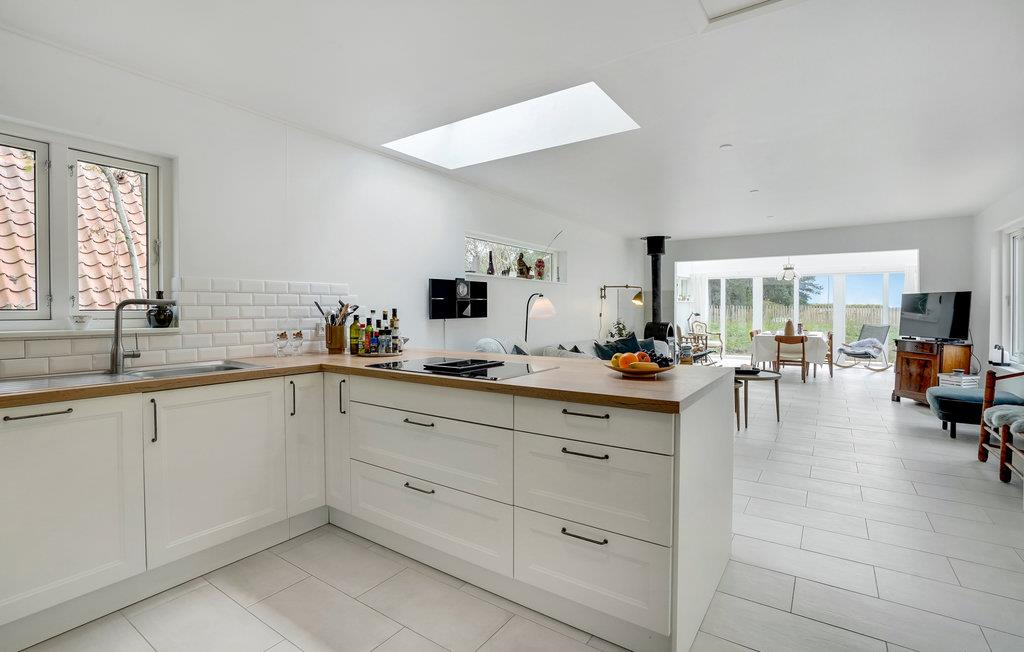 Dette skønne, lyse sommerhus er velegnet til en badeferie på Kegnæs, for her får I nogle dejlige rammer til livet både indendørs og udenfor. Den rummelige og moderne stue er husets hjerte og bliver jeres naturlige mødested. Fra spisepladsen, med store vinduespartier, kan I se havet. En smuk, flot terrasse giver jer et dejligt sted at slappe af i solen eller klargøre lækre ferieretter på grillen.