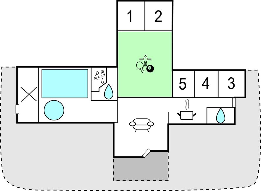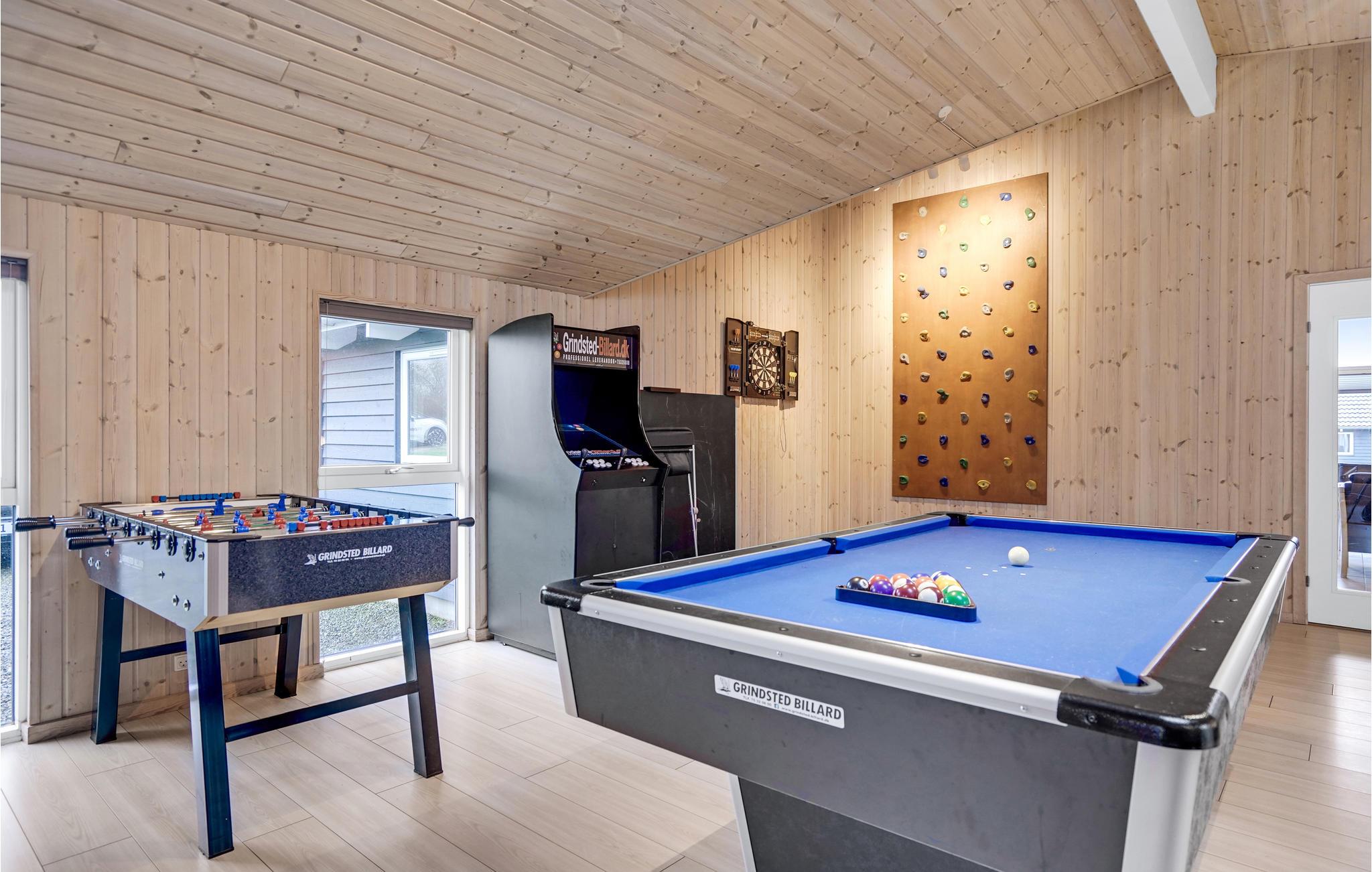 Aktivitetsrummet inviterer til dyst i husets mange aktiviteter, og ude på den store, lækre terrasse kan alle samles omkring feriemiddagen der evt. tilberedes på grillen. Huset ligger på en skøn naturgrund med god plads til boldspil og leg.