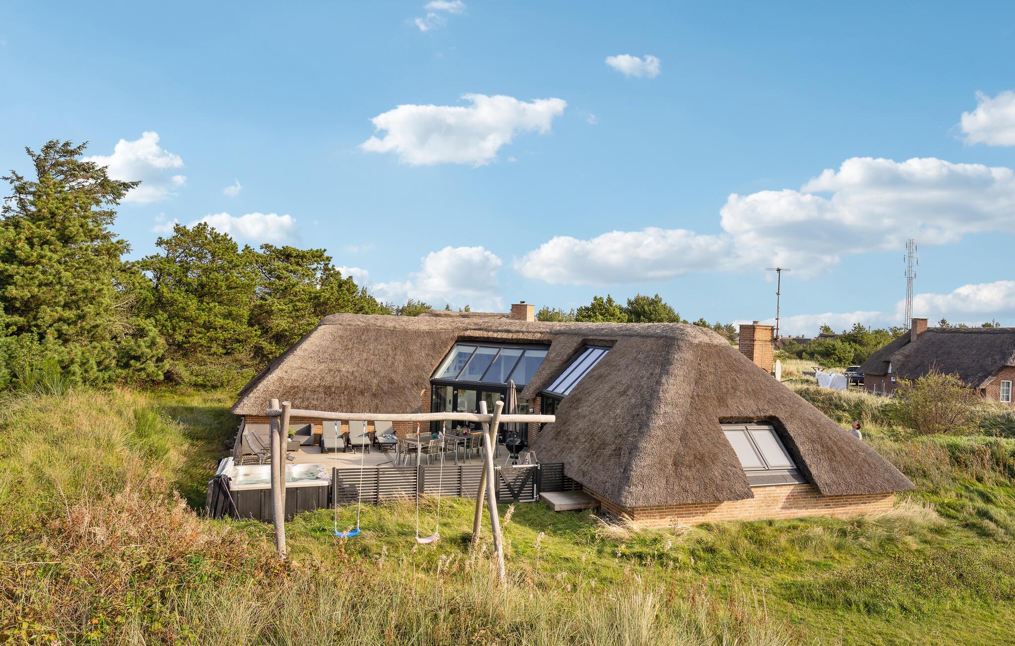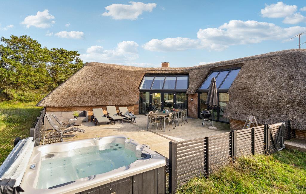 Oplev luksusferien i dette stråtækte hus med pool, sauna og strandvandsspa i gåafstand til stranden i Klegod.