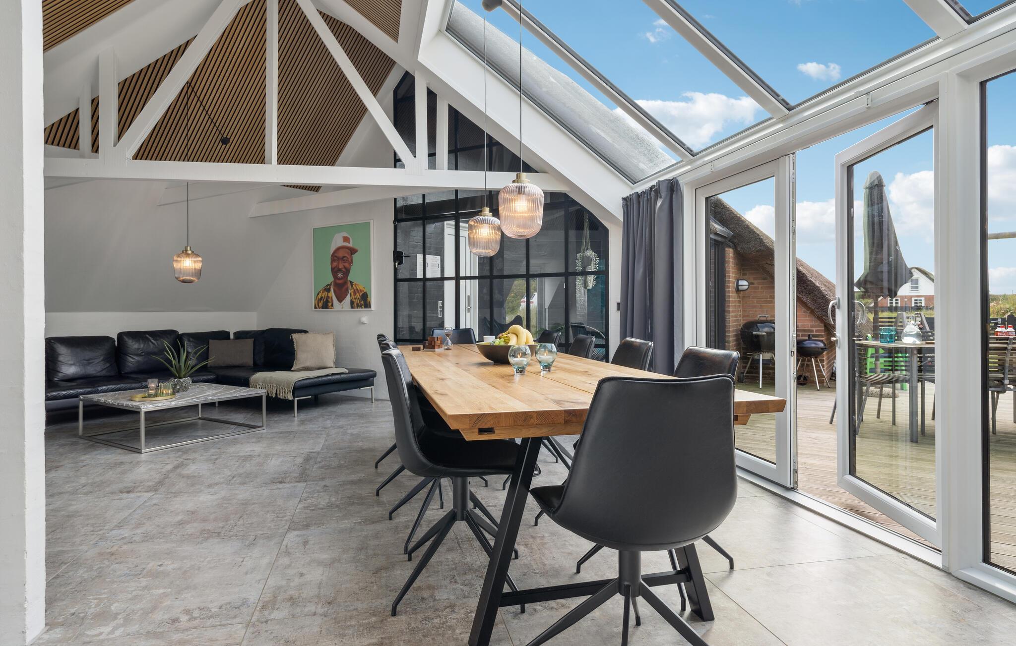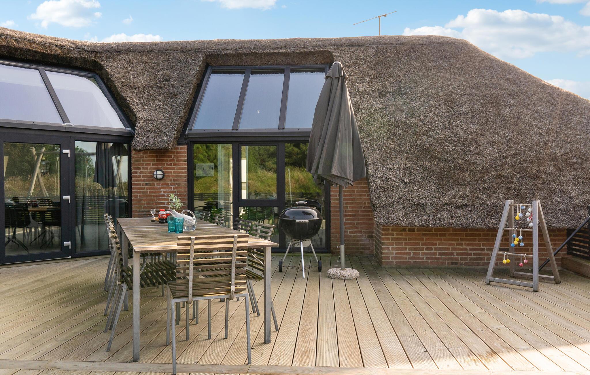 Tilbring en uforglemmelig tid med dem, I holder af, i dette eksklusive, stråtækte hus i gåafstand til stranden. I den stilfulde atmosfære i de lyse værelser viser store panoramavinduer på optimal vis nærheden til havet og naturen, og et særligt stykke glastag tilføjer et ekstravagant strejf og bringer sommerhimlen indenfor. Lad jer fortrylle af udsigten, når I spiser sammen, og glæd jer til hyggelige aftener ved brændeovnen i jeres dejlige feriebolig, som også kan rumme en større familie. Slap af i saunaen efter en tur på stranden og spring i poolen uanset vind og vejr. Ved huset kan I også nyde hyggelige timer i det fri, slikke sol på en liggestol, slappe af på den ugenerte terrasse og senere grille med hele familien. En stund i whirlpoolen byder på ren afslapning. Gå til stranden og nyd havet og solen.