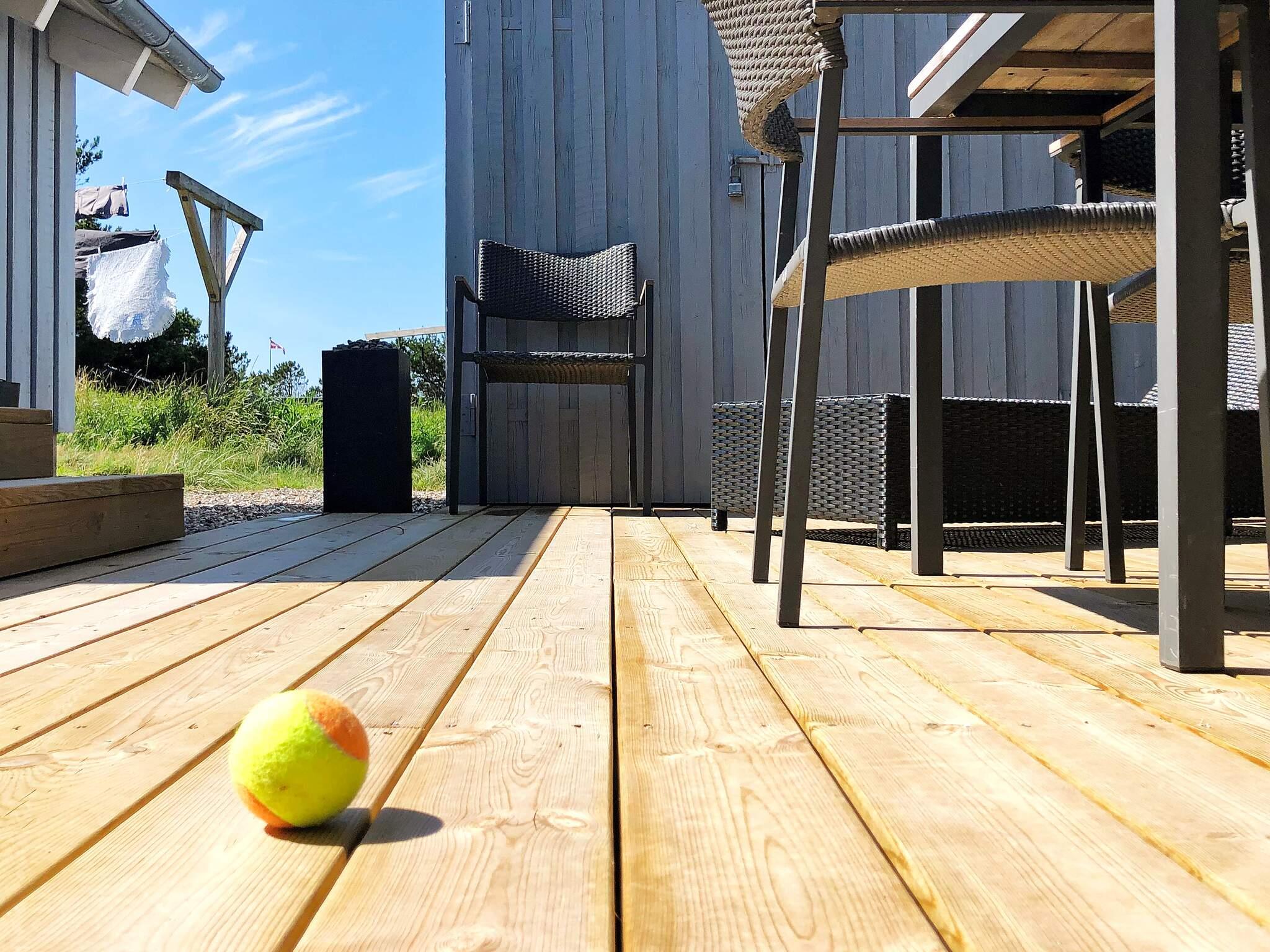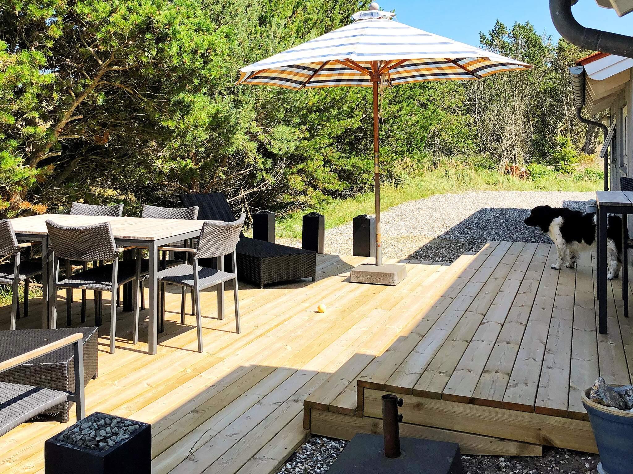 Huset ligger på en kuperet klitgrund med både åbne og overdækkede terrasser, hvor I kan sidde helt ugenert. Der er gode læmuligheder på terrasserne, som indbyder til grill på den store havegrill. Der er endvidere sandkasse og gyngestativ til børnene på grunden. Huset ligger ca. 600 m fra Vesterhavet og en god sandstrand.