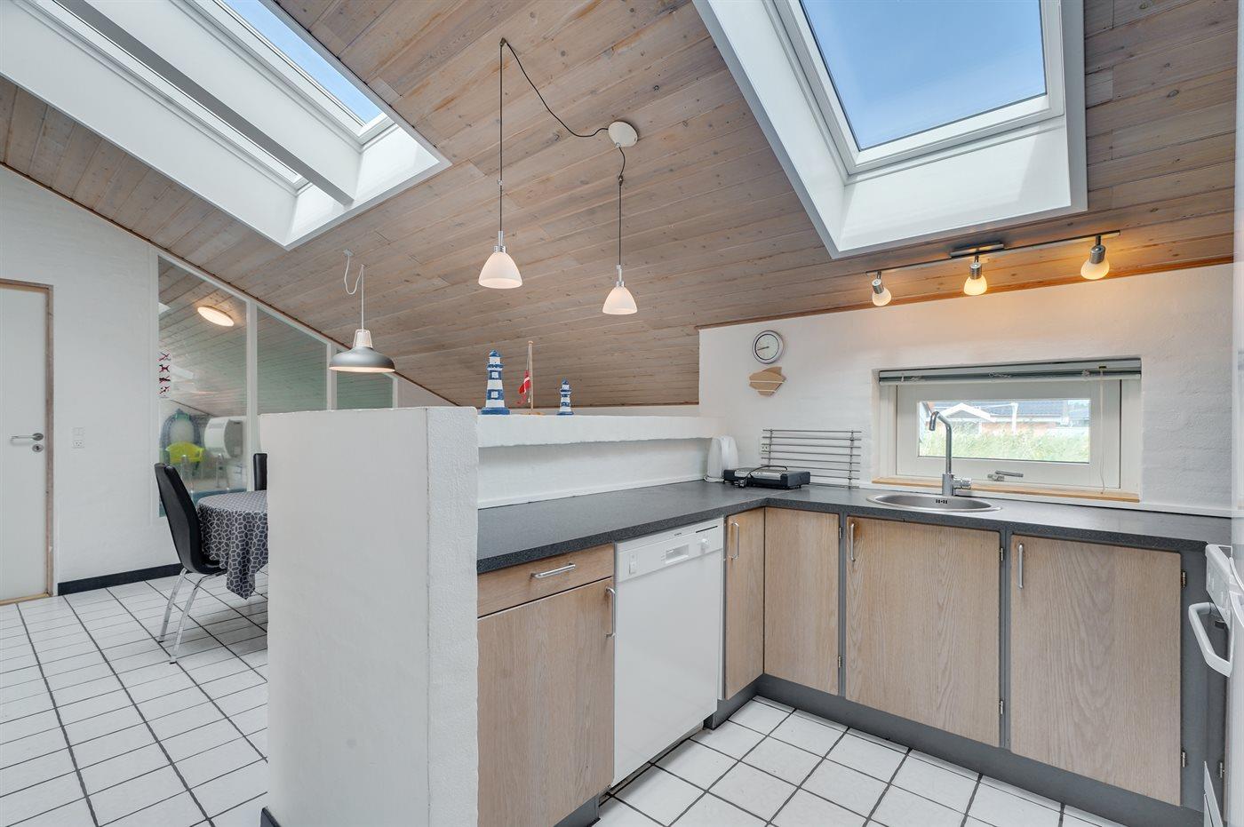 Køkkenet er udstyret med 1 køleskab. Der er 4 keramiske kogeplader, varmluftovn, mikrobølgeovn samt opvaskemaskine Der er gulvvarme i køkkenet.