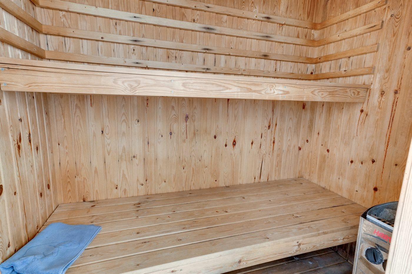 Der er 2 badeværelser med bruseniche og 2 toiletter. Der er gulvvarme på 2 badeværelser. I saunaen er der mulighed for afslapning.