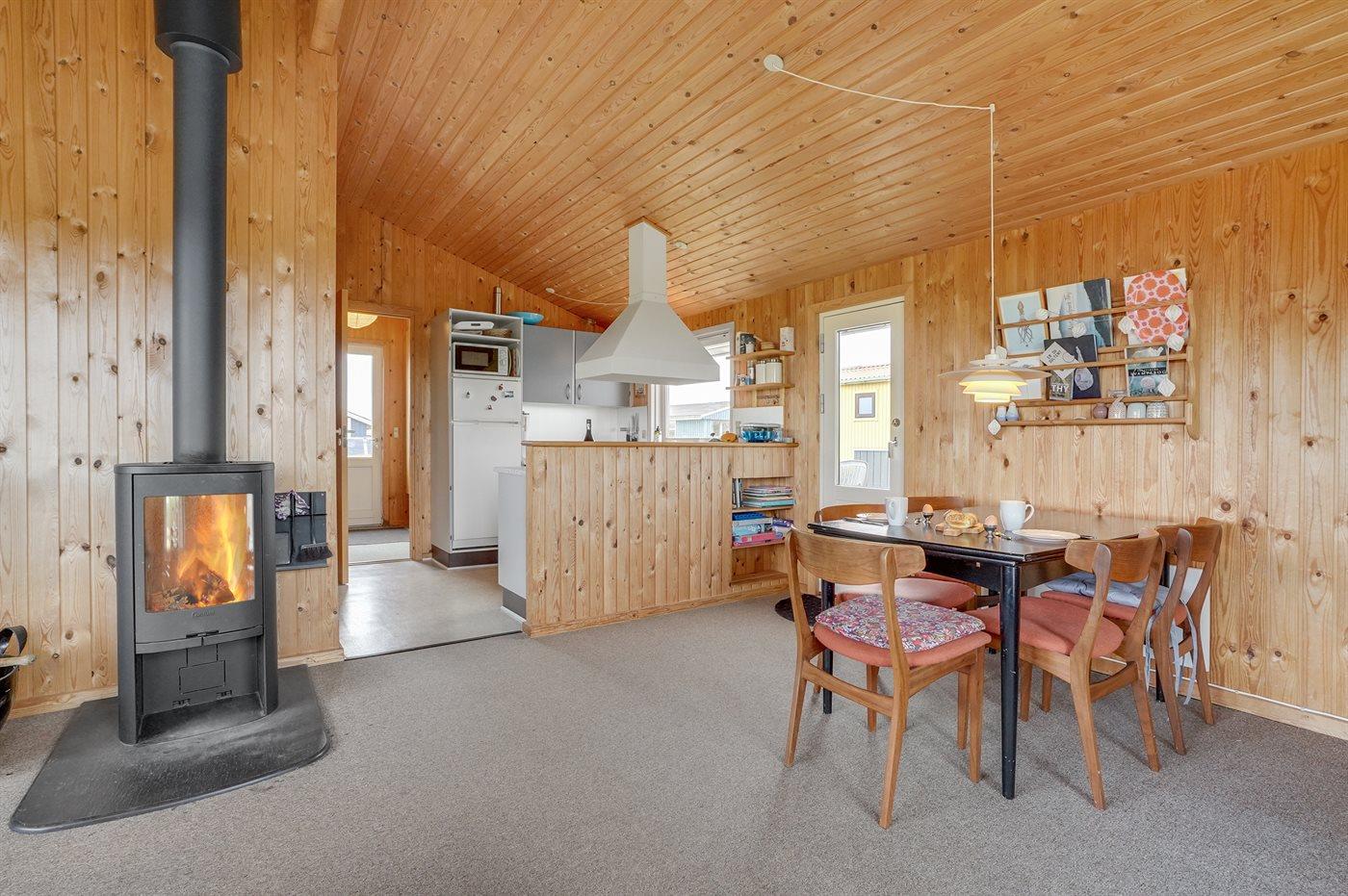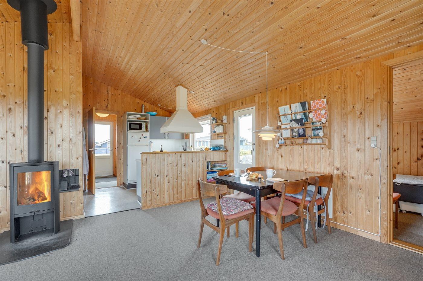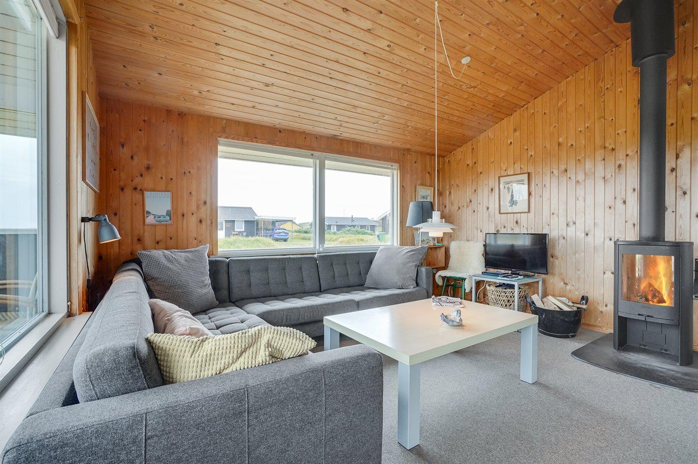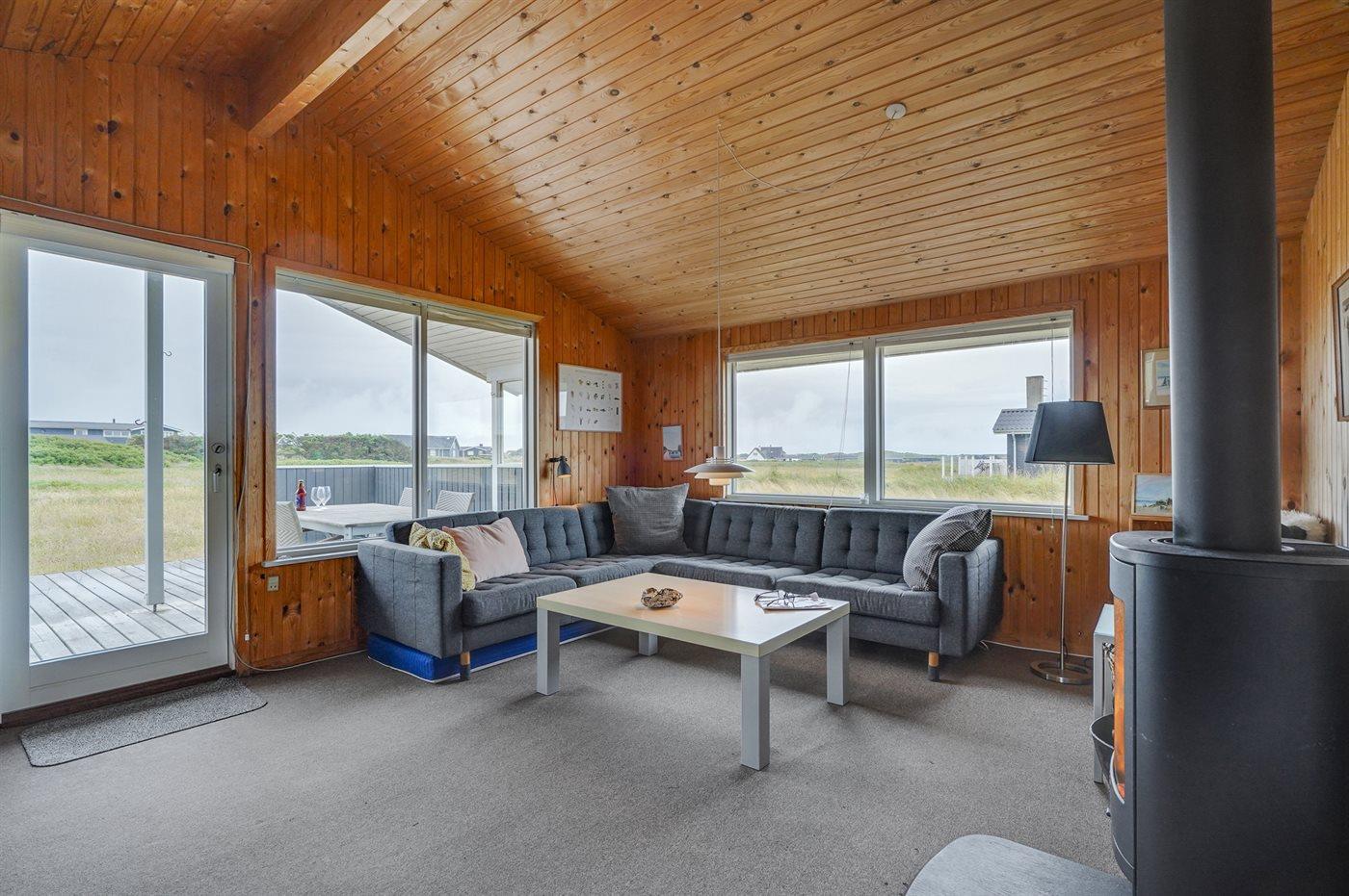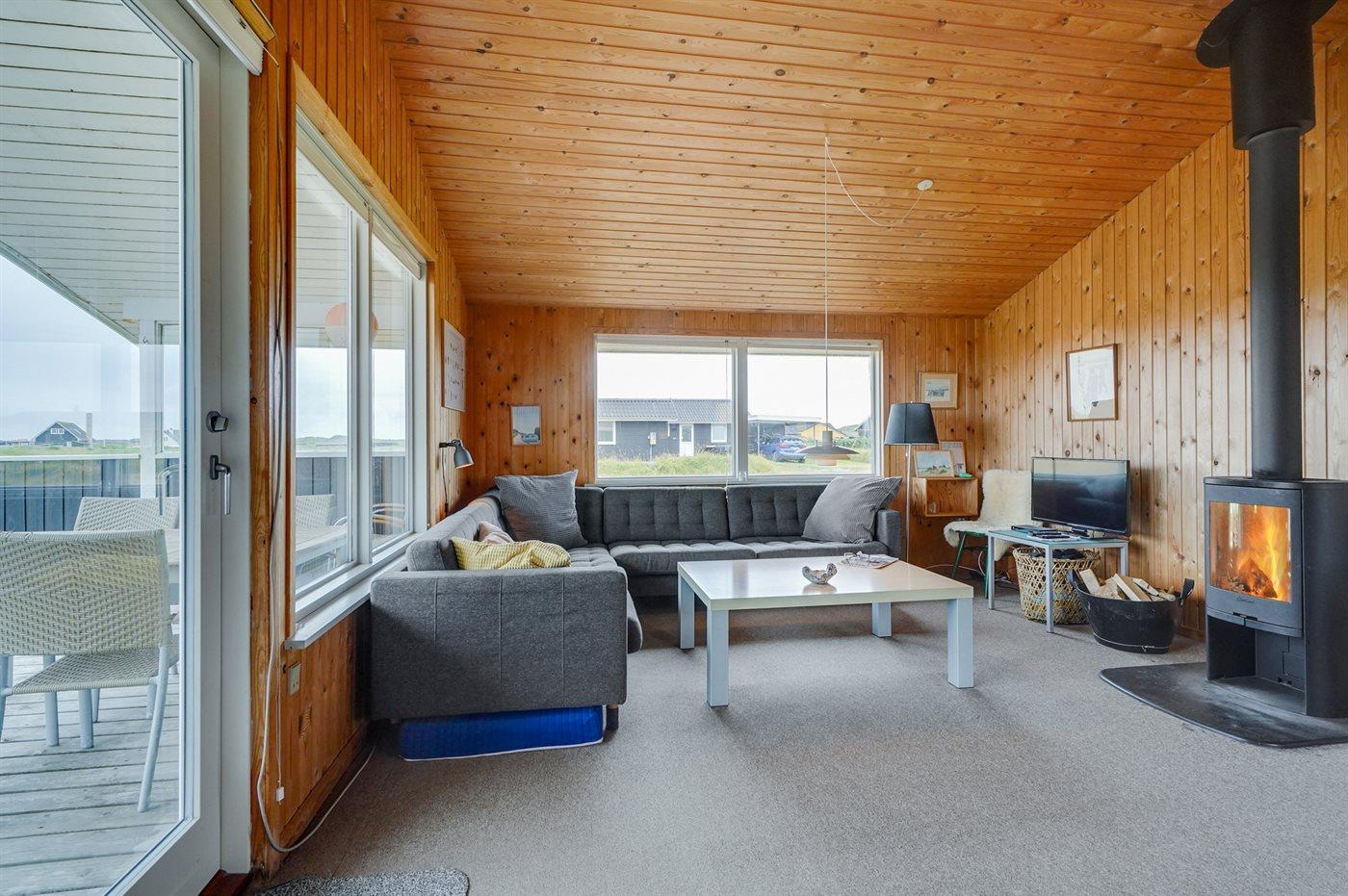 Hyggeligt træsommerhus i Klitmøller med brændeovn, stor terrasse og tæt på havet.