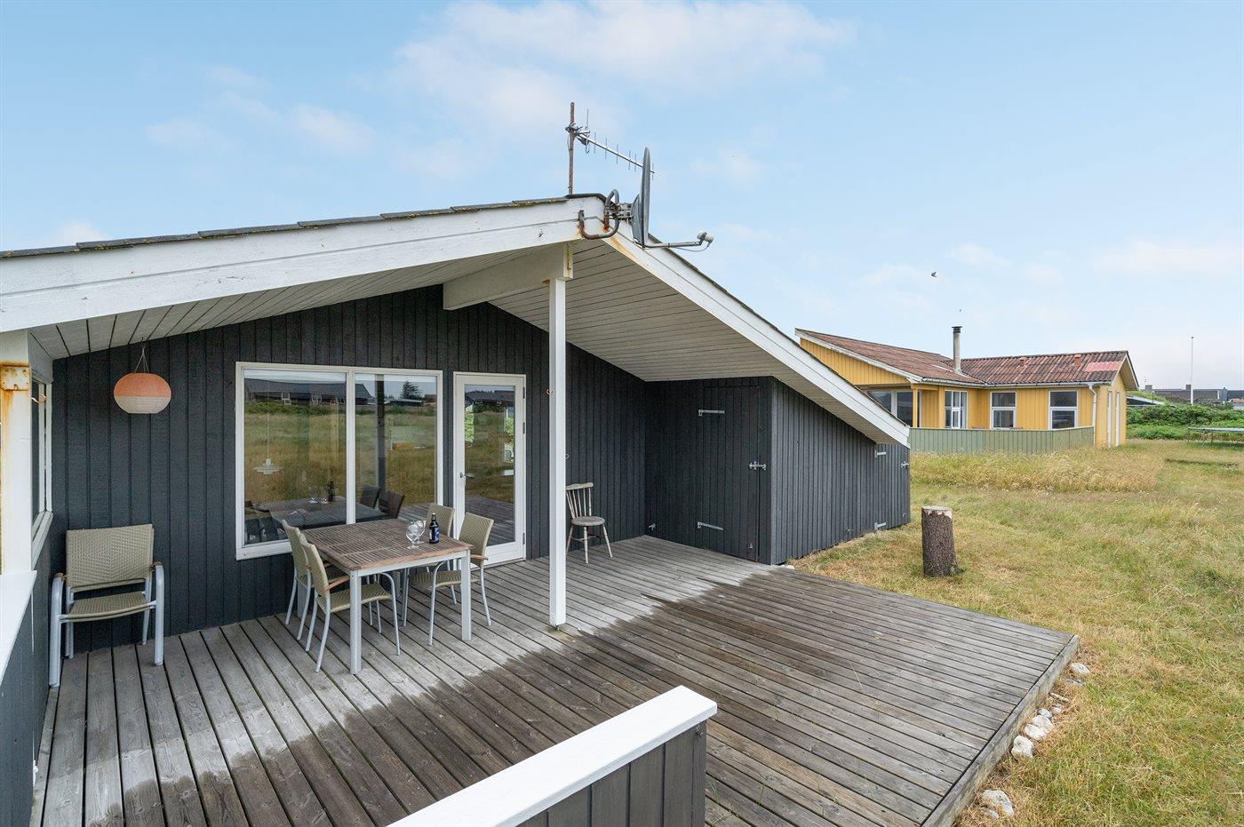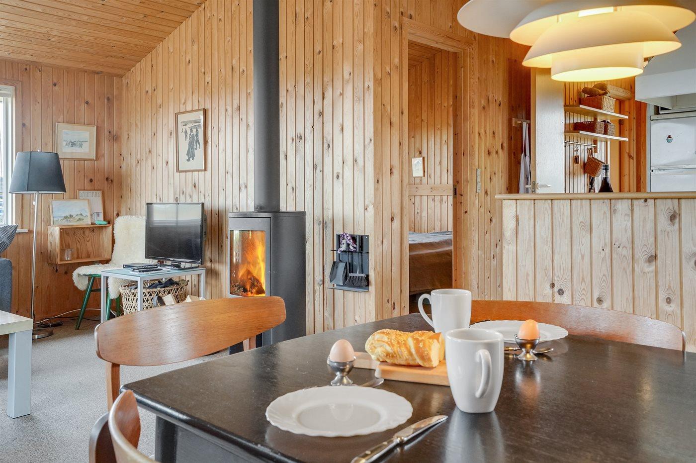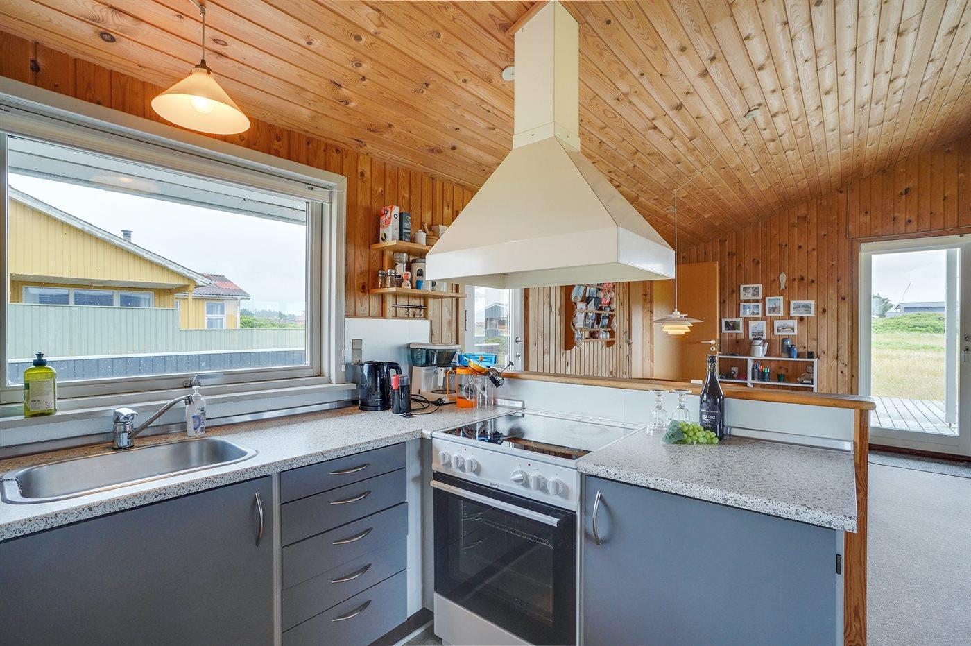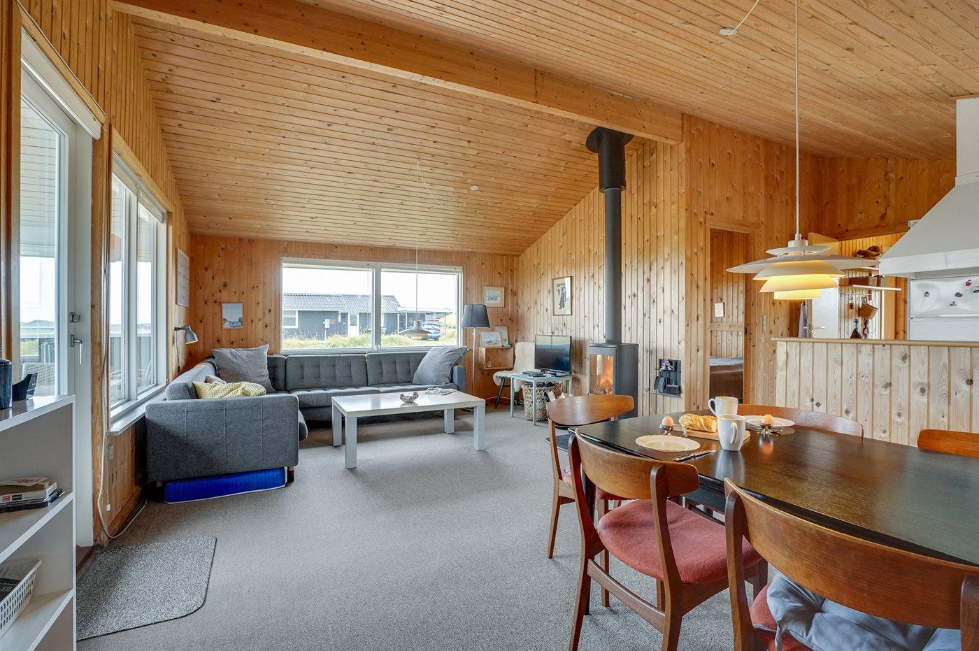 Hyggeligt træsommerhus i Klitmøller med brændeovn, stor terrasse og tæt på havet.