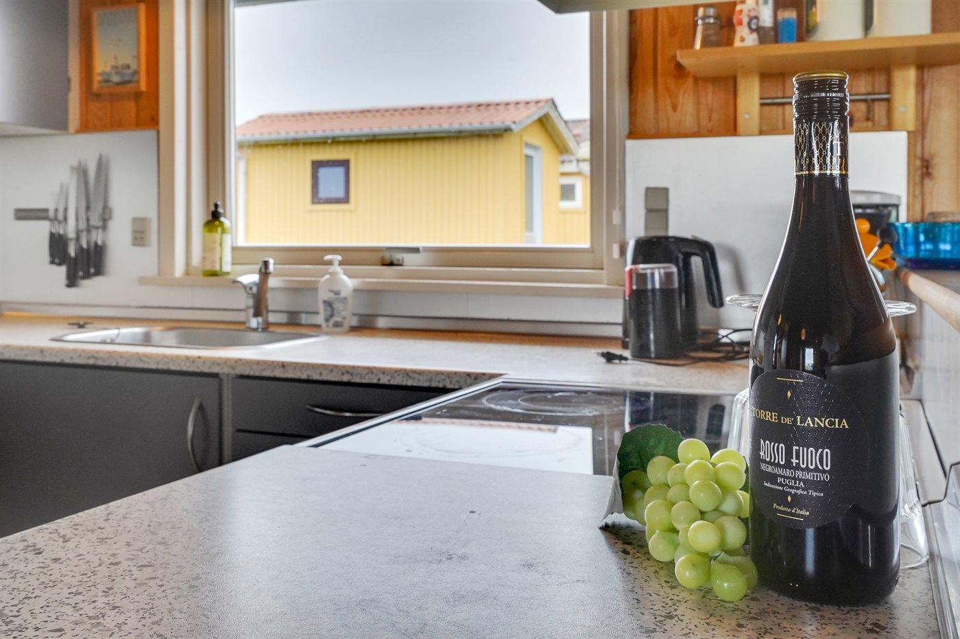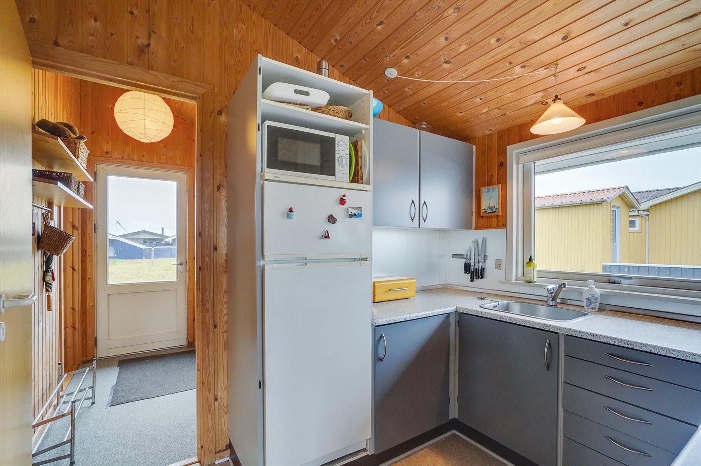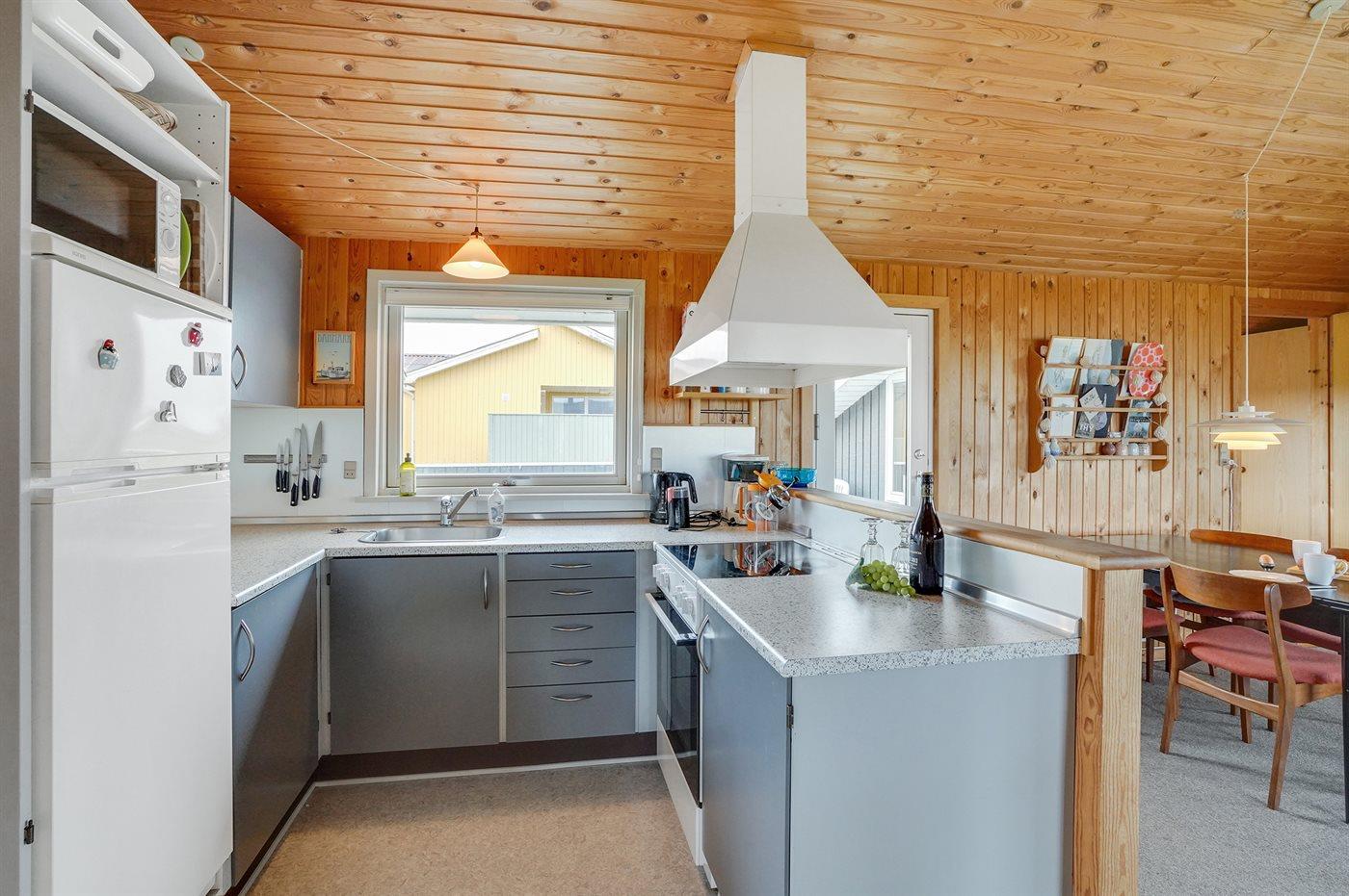 Køkkenet er udstyret med 1 køleskab. Der er 4 keramiske kogeplader, varmluftovn, mikrobølgeovn.
