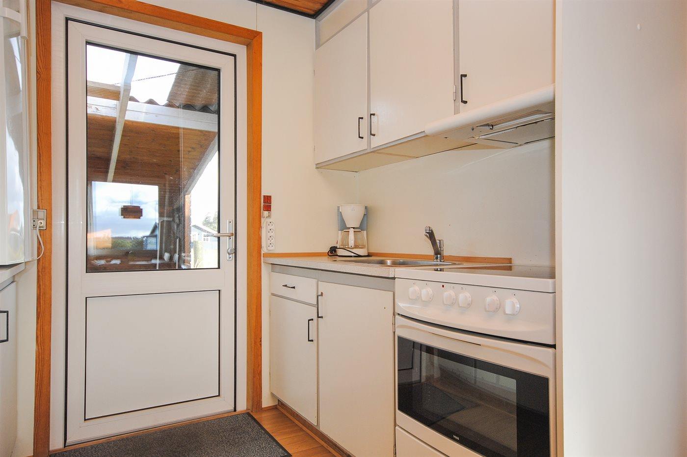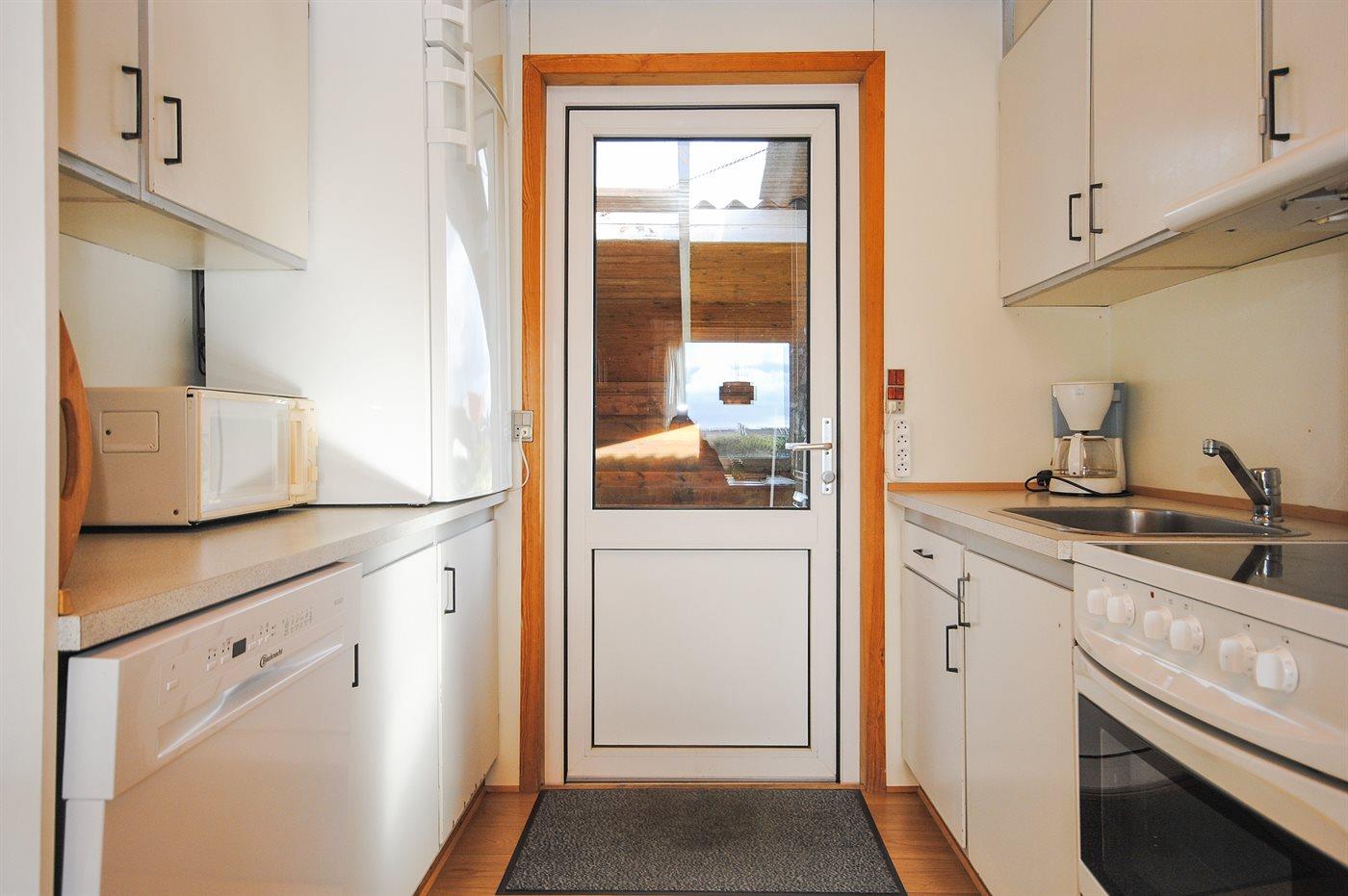 Køkkenet er udstyret med 1 køleskab. Der er 4 keramiske kogeplader, bageovn, mikrobølgeovn samt opvaskemaskine.