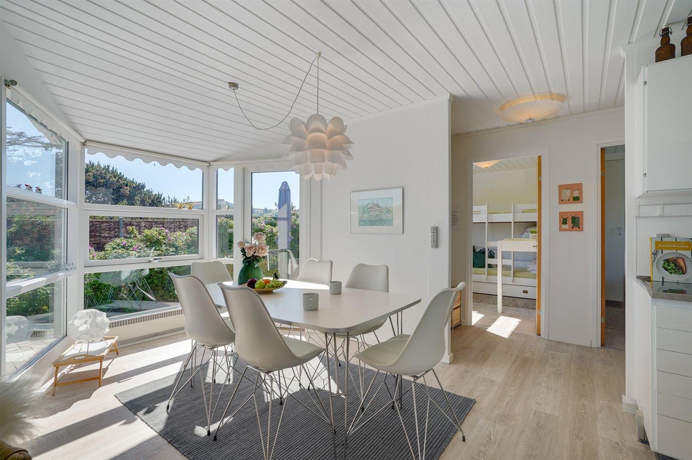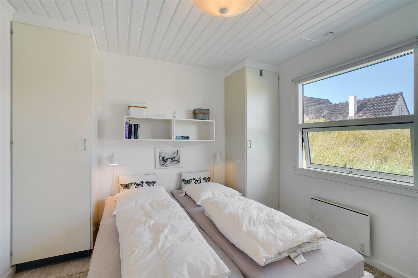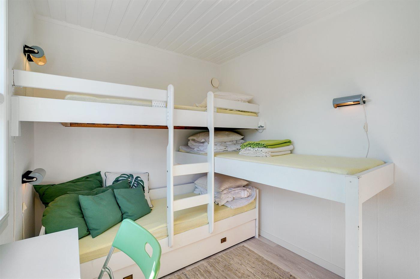 1 enkeltseng og køjeseng. Hertil kommer et anneks på 9 m2 med 2 enkeltsenge/dobbeltseng + hems.