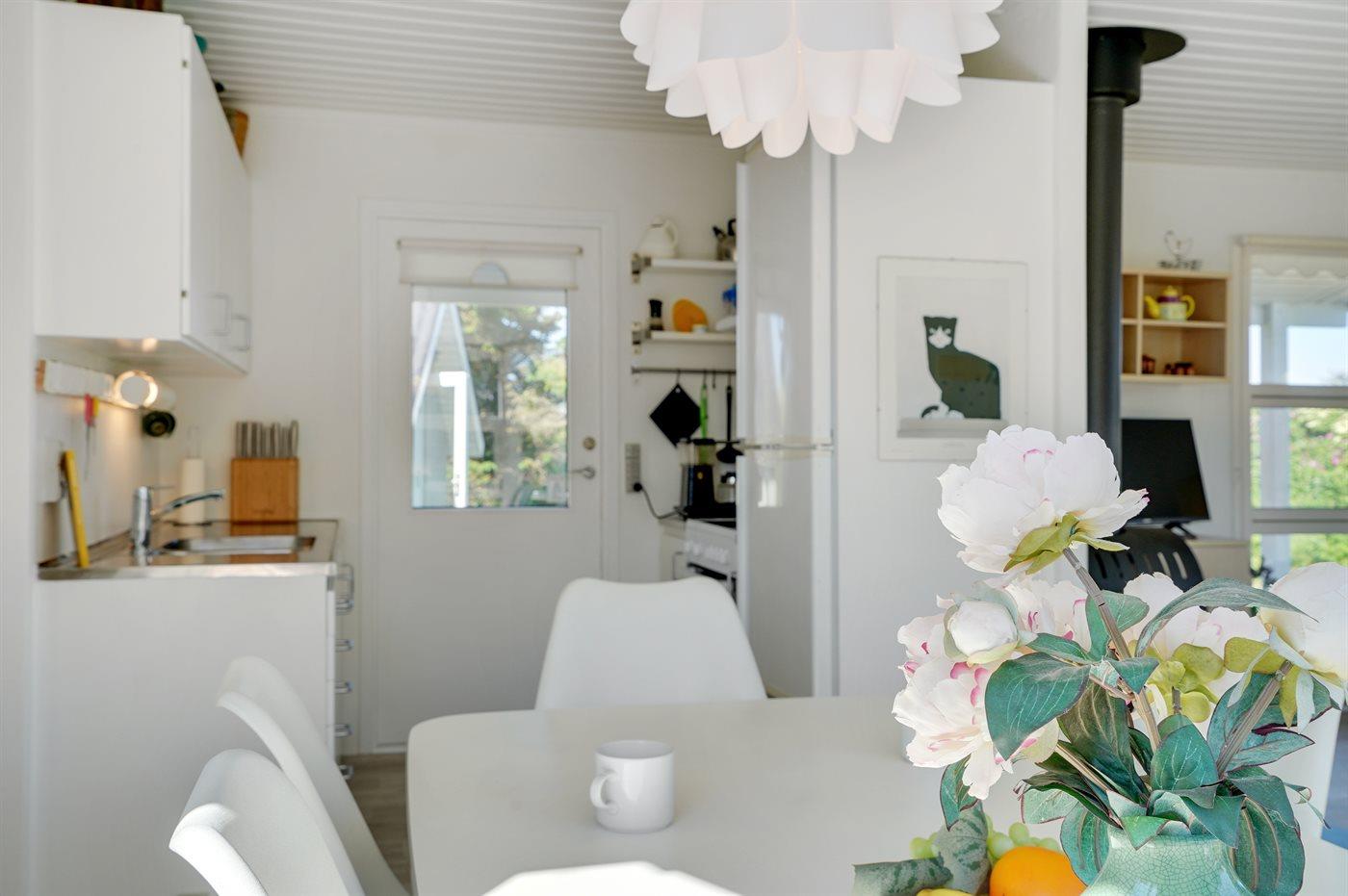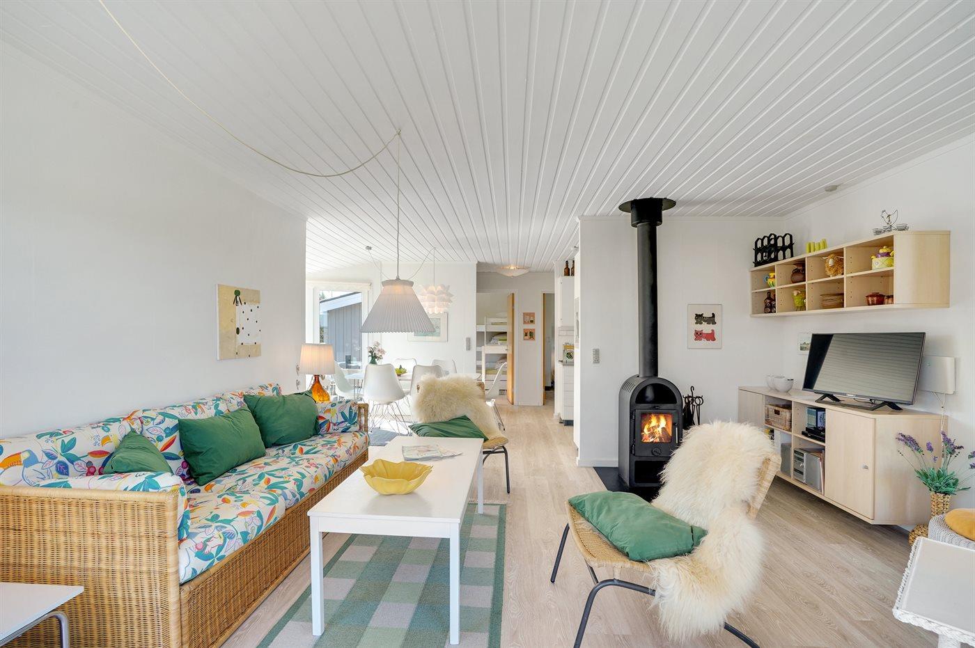Der er brændeovn i stuen. Køkkenet er udstyret med 1 køleskab, fryser med en kapacitet