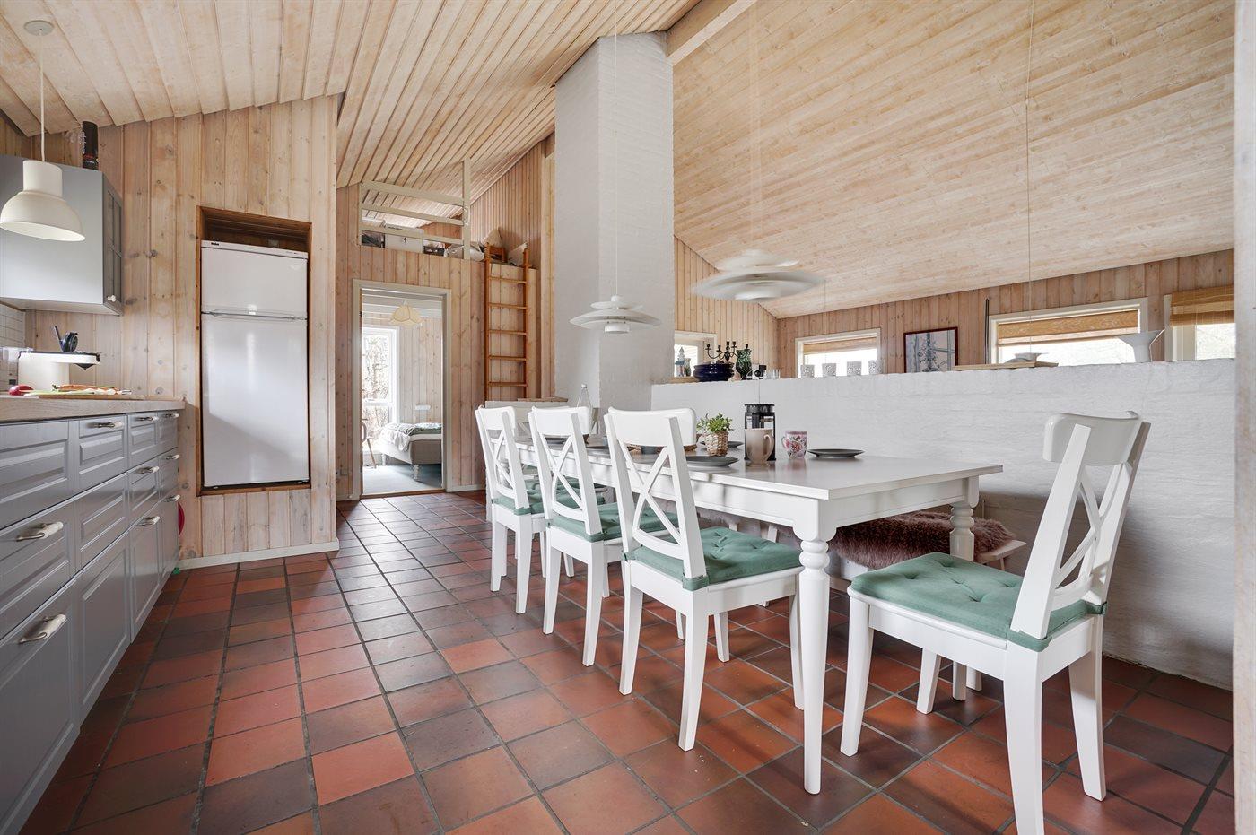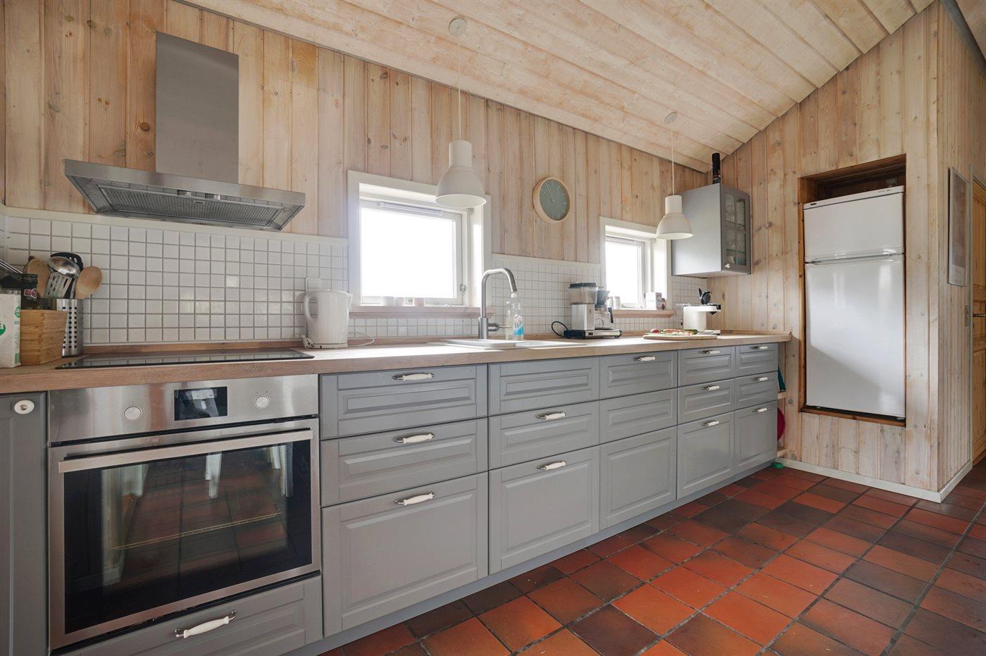 Køkkenet er udstyret med 1 køleskab. Der er 4 induktionskogeplader, varmluftovn samt opvaskemaskine Der er gulvvarme i køkkenet.