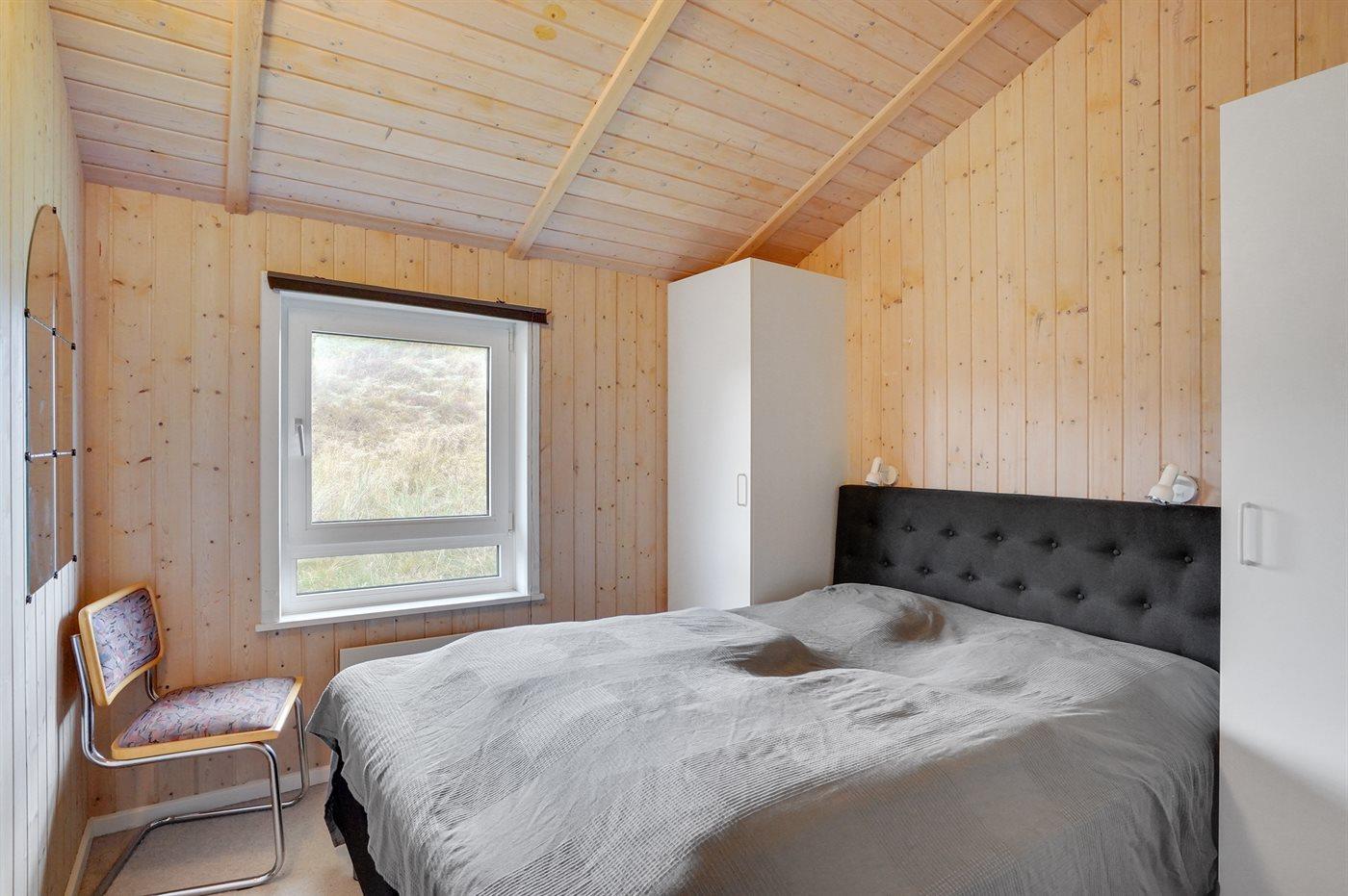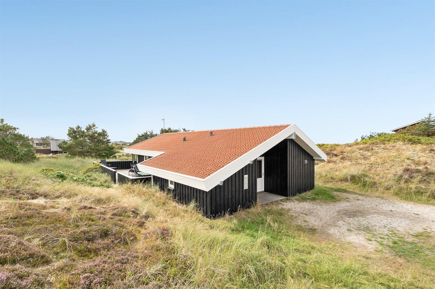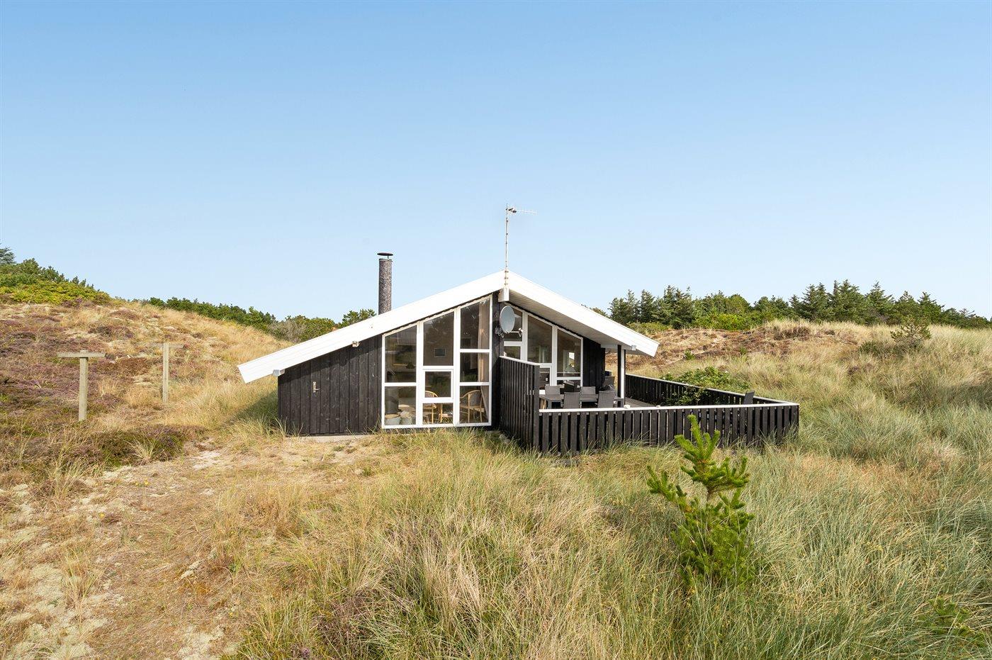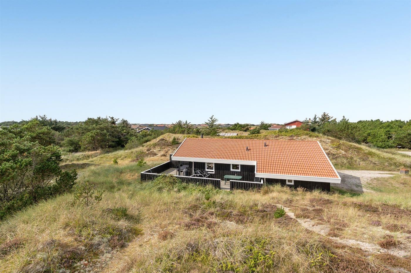 På en rolig og kuperet klithede-naturgrund bevokset med lyng, revling og marehalm ligger dette velholdte og veludstyrede sommerhus.