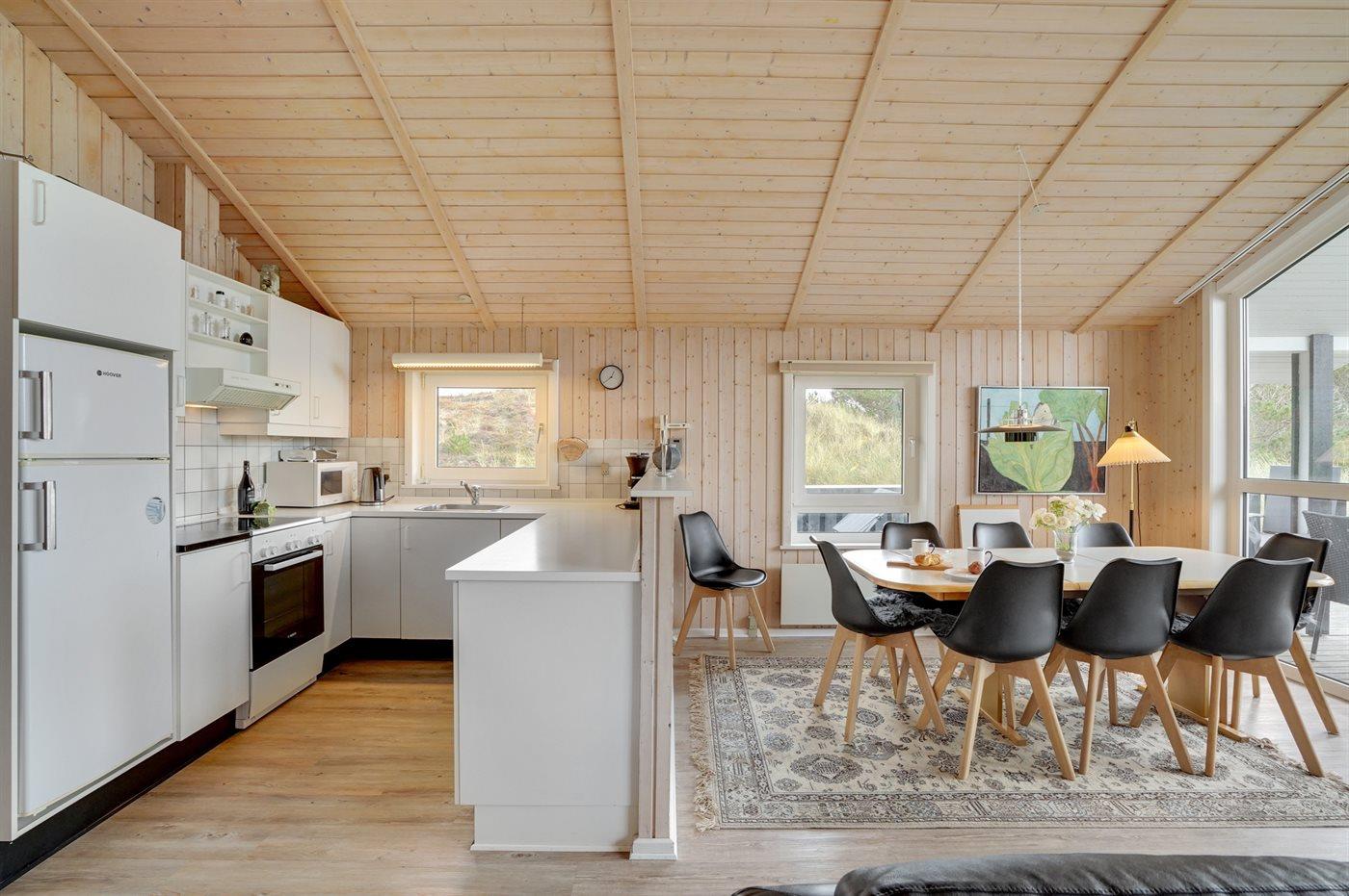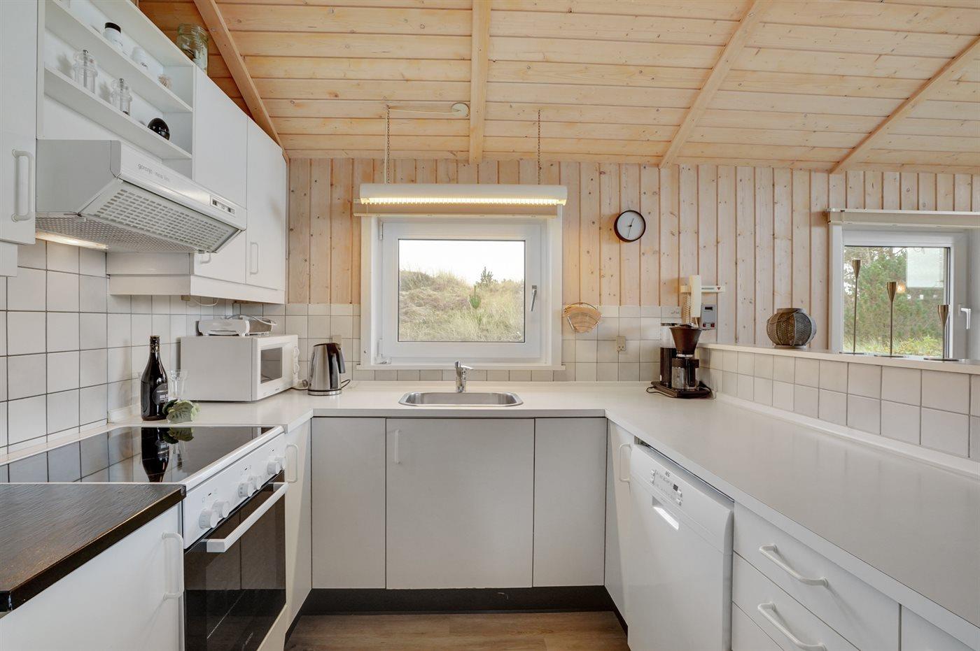Køkkenet er udstyret med 1 køleskab. Der er 4 elkogeplader, bageovn, mikrobølgeovn samt opvaskemaskine.