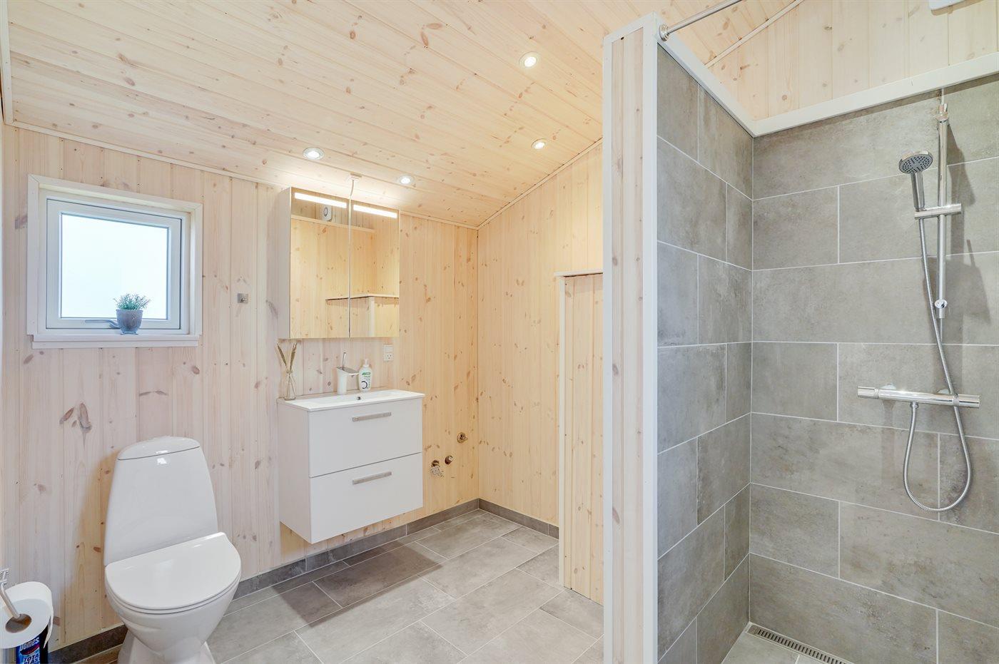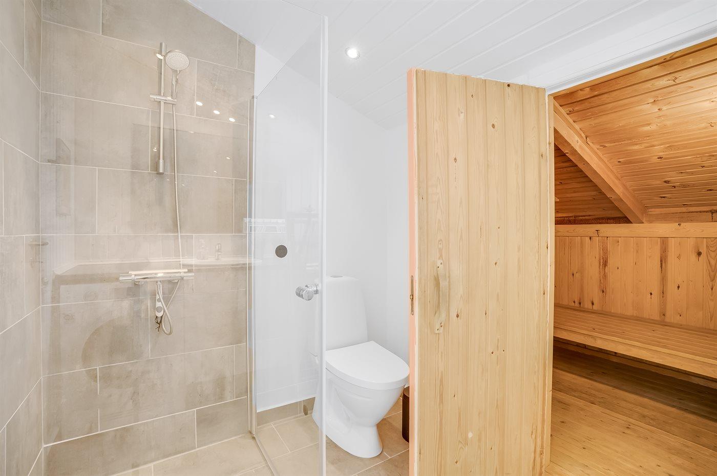 Der er 2 badeværelser med bruseniche og 2 toiletter. Der er gulvvarme på 2 badeværelser. I saunaen er der mulighed for afslapning.