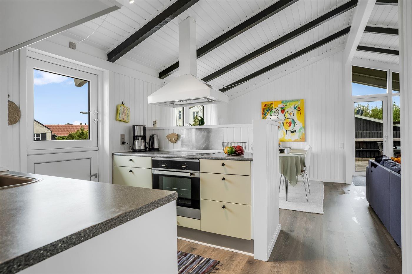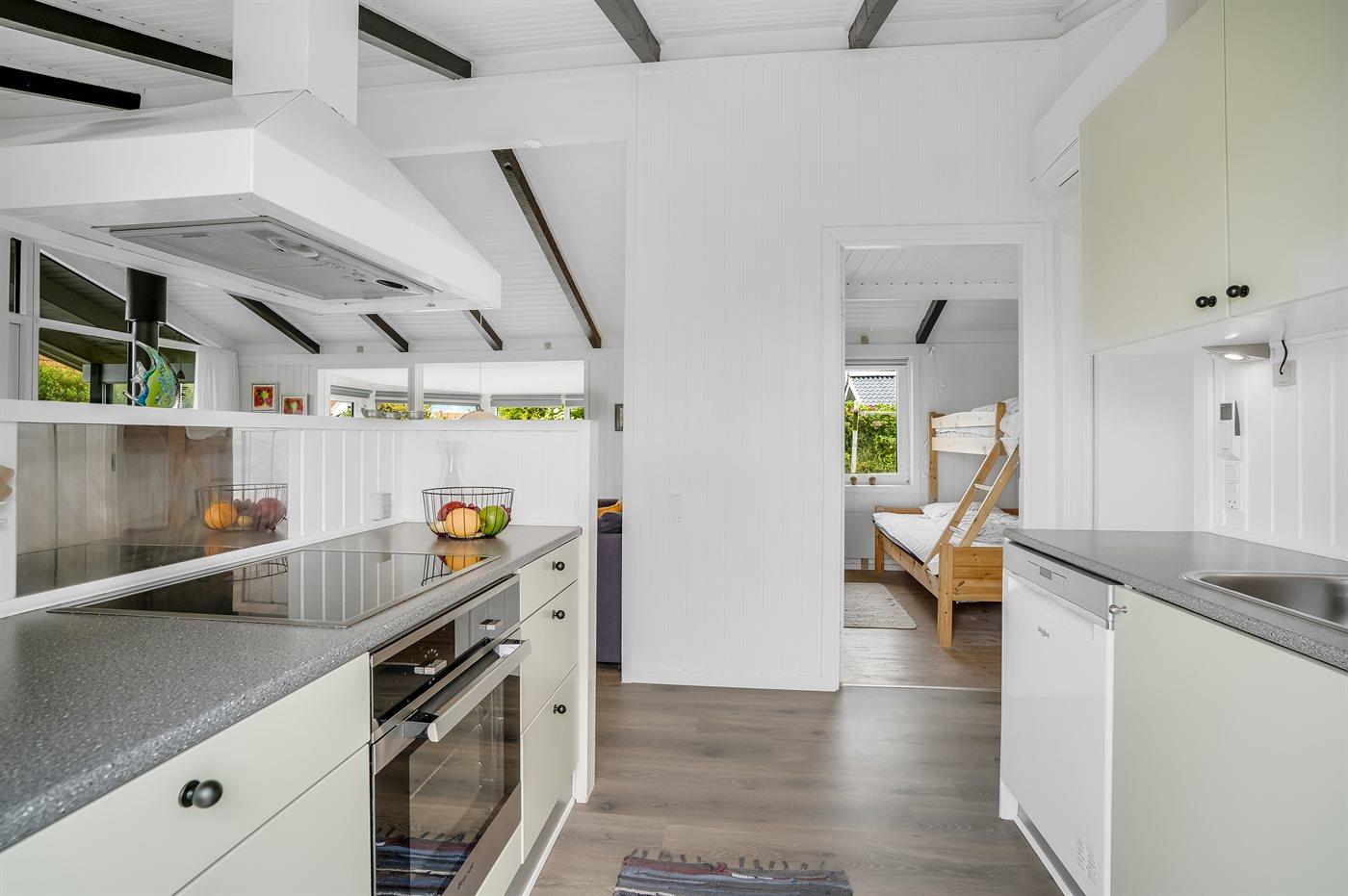Køkkenet er udstyret med 1 køleskab. Der er 4 elkogeplader, bageovn, mikrobølgeovn samt opvaskemaskine.