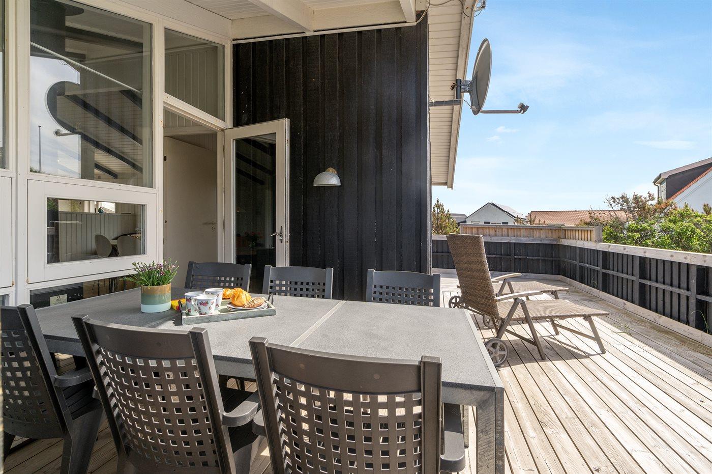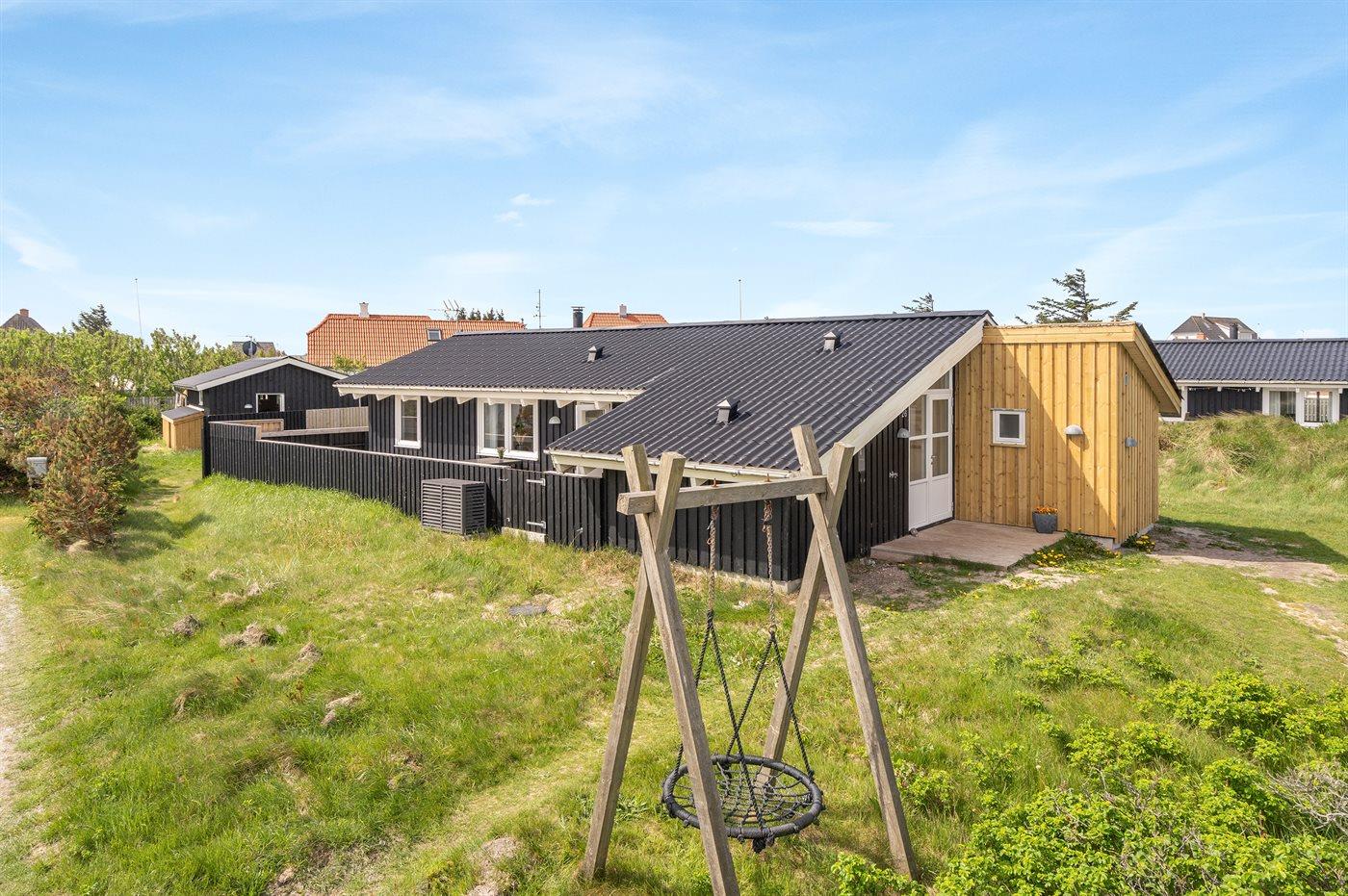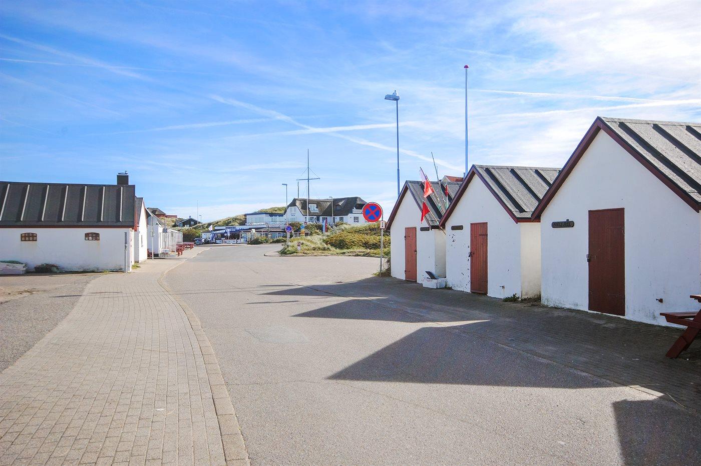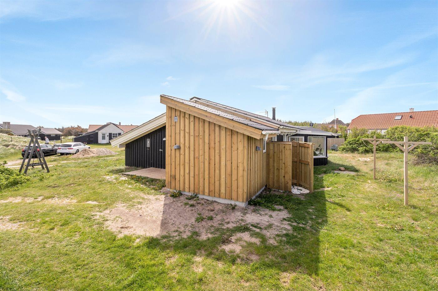 Ferieboligen er beliggende på en 1240 m² stor naturgrund. Der er 75 m til havet. Nærmeste forretning er beliggende i en afstand af 400 m. Til ferieboligen hører 60 m² terrasseareal. Desuden er der 10 m² overdækket terrasse. Der er redskabsrum. Gynge. Udendørs bruser. Grill til rådighed. Der er installeret stik til opladning af elbil.