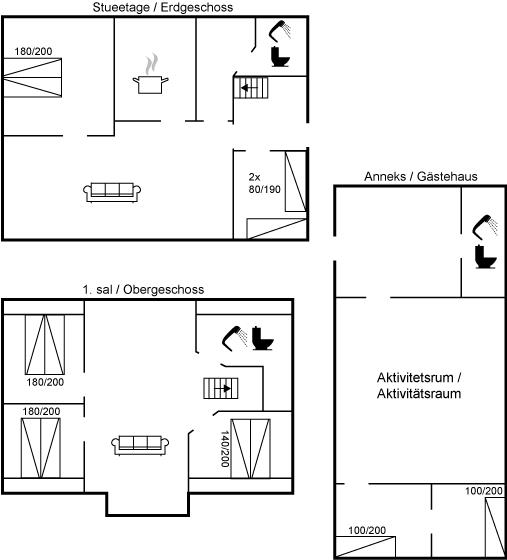 Der er i alt 7 soveværelser. Sovepladserne fordeler sig på: 10 sovepladser i dobbeltsenge. 4 sovepladser i enkeltsenge.- 2 af disse sovepladser befinder sig i et anneks. Derudover er der 2 stk. barnesenge.