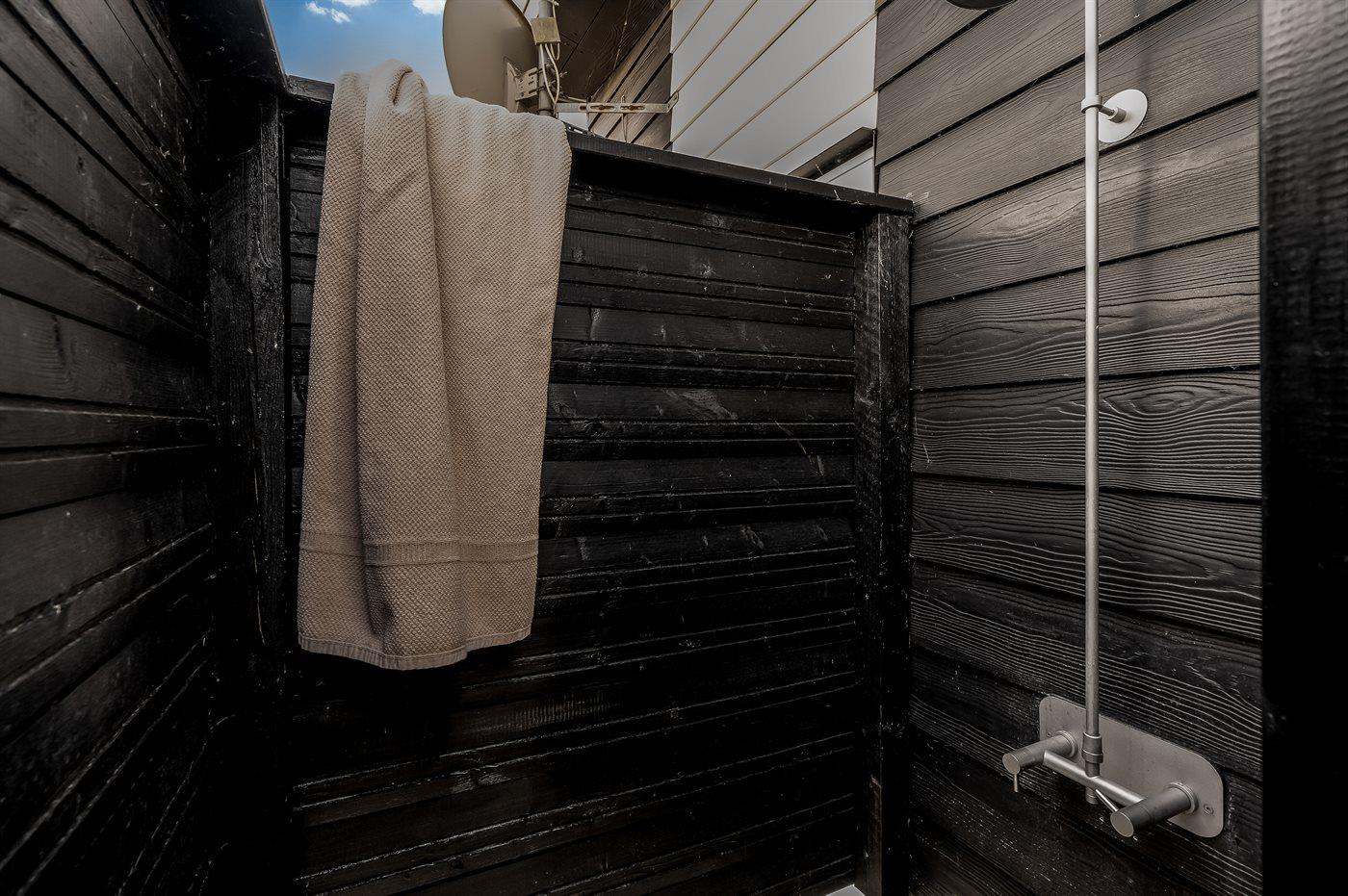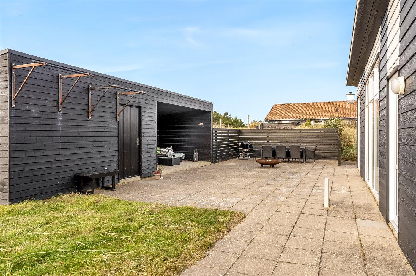 Ferieboligen er beliggende på en 1400 m² stor naturgrund. Der er 400 m til havet. Nærmeste forretning er beliggende i en afstand af 200 m. Til ferieboligen hører 139 m² terrasseareal. Desuden er der 12 m² overdækket terrasse. Der er installeret stik til opladning af elbil. Parkering ved ferieboligen.